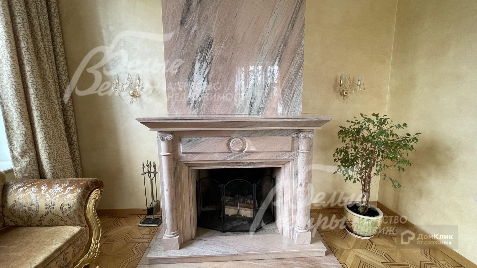 Внутренняя отделка: выполнена отделка дорогими материалами в классическом стиле: многоуровневые потолки и сложные потолочные карнизы, колонны с каннелюрами, импортная плитка со множеством декора, лестница и три камина облицованы мрамором, штучный и наборный паркет из массива дуба. Многометровая люстра и французские шторы. Все три камина отделаны разными видами мрамора, особенно впечатляет розовый мрамор камина в Гостиной. На полах дорогой наборный паркет из дуба. На кухне испанская плитка, выложенная мозаикой, идеально сочетается с классической кухней. В доме множество точек света, при этом очень большие окна, что дополнительно расширяет пространство..