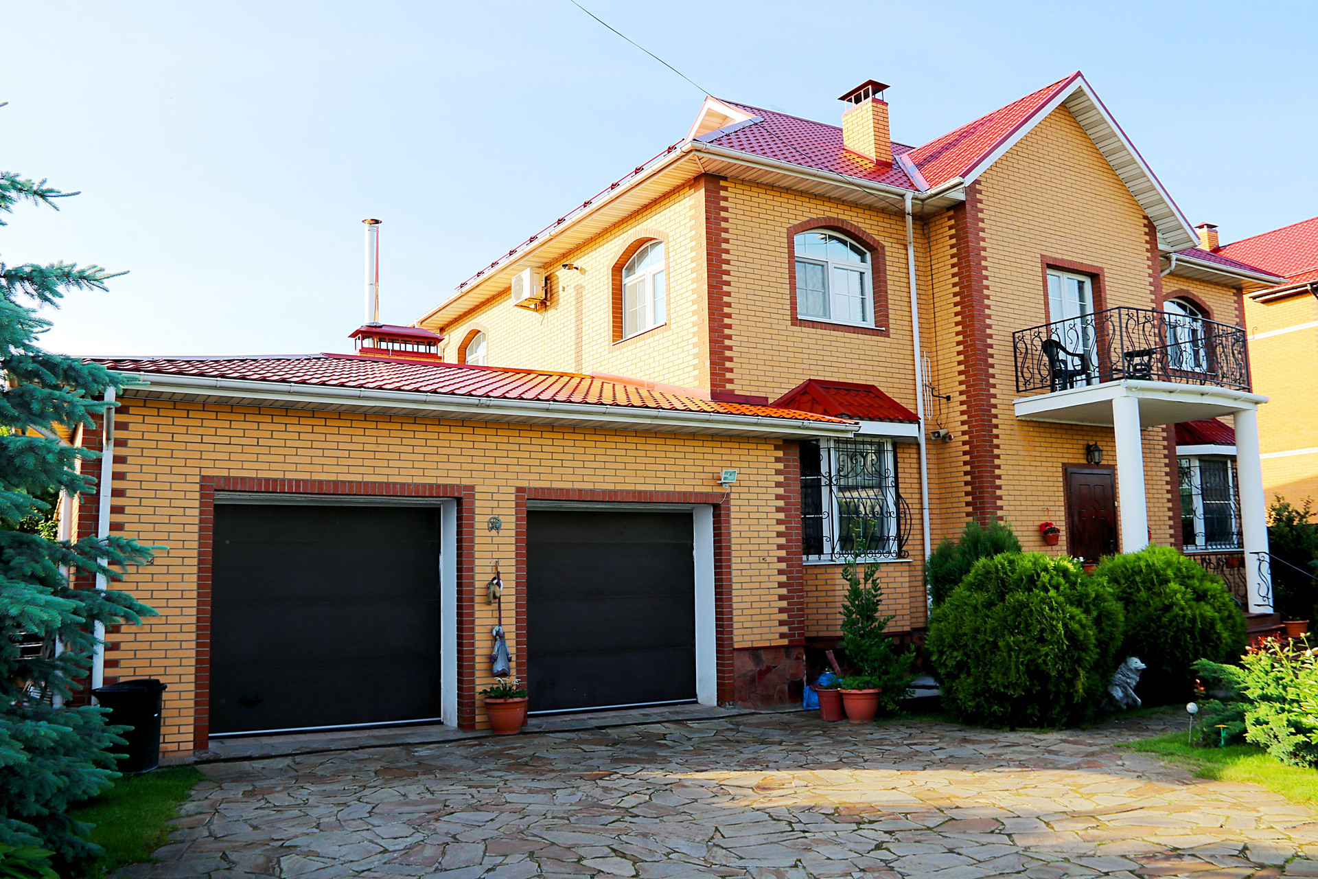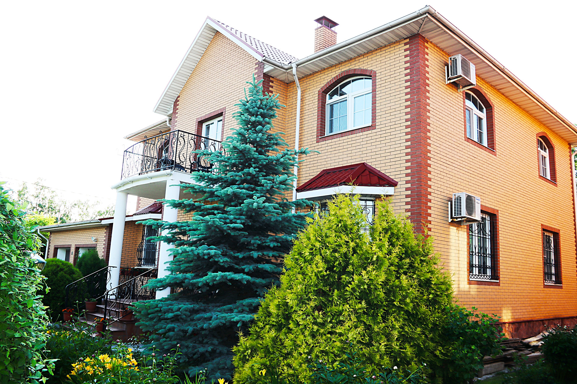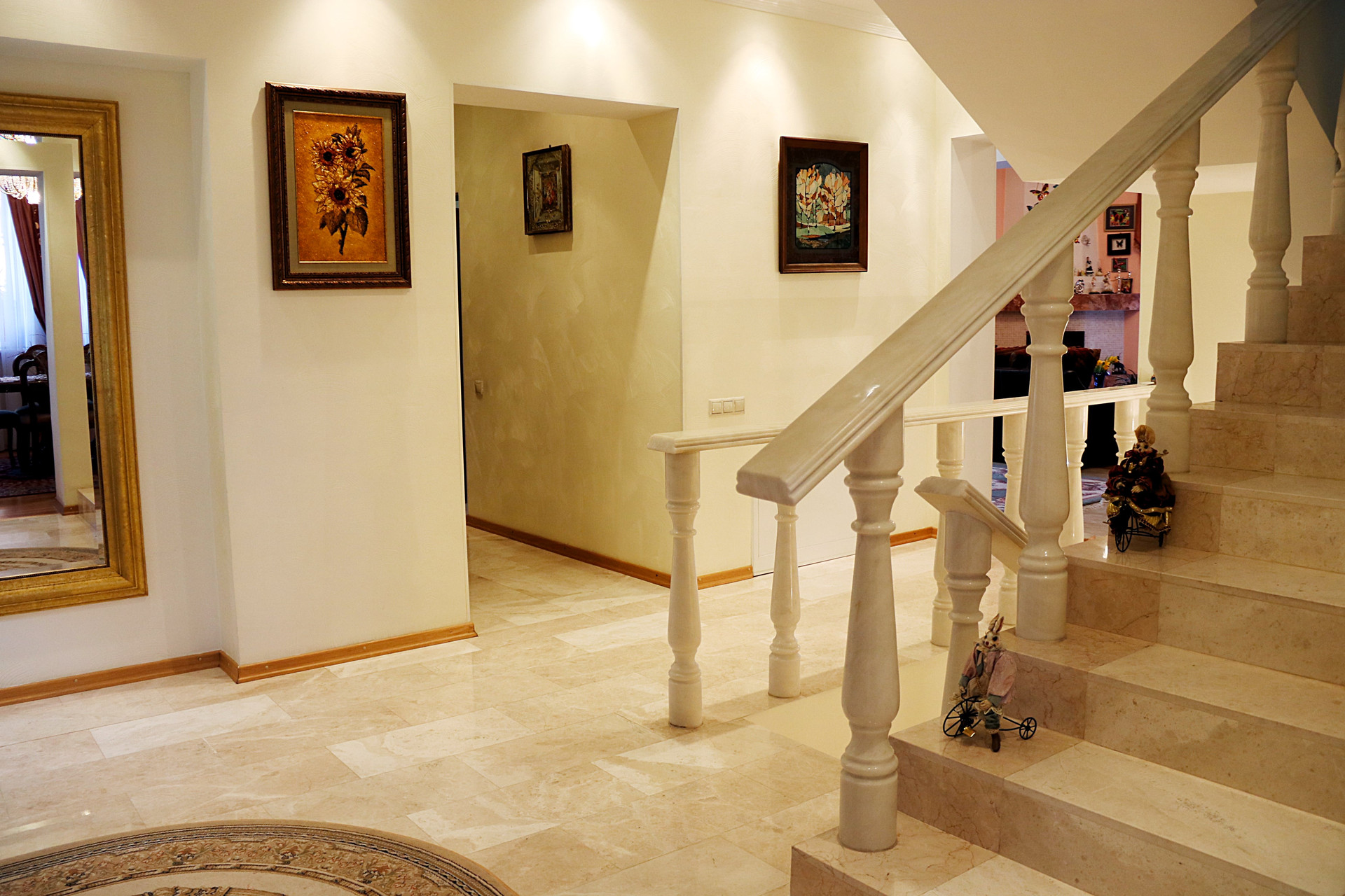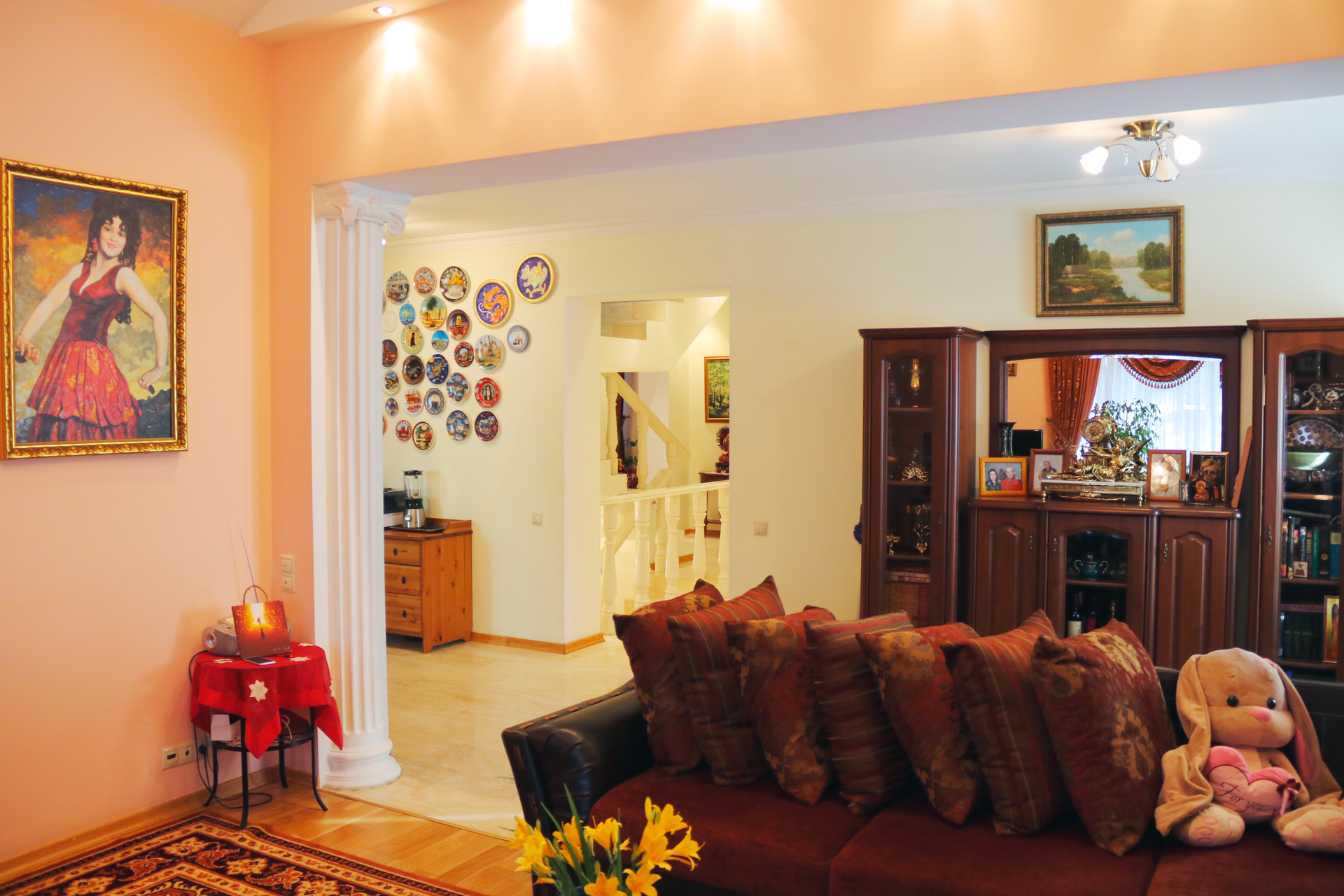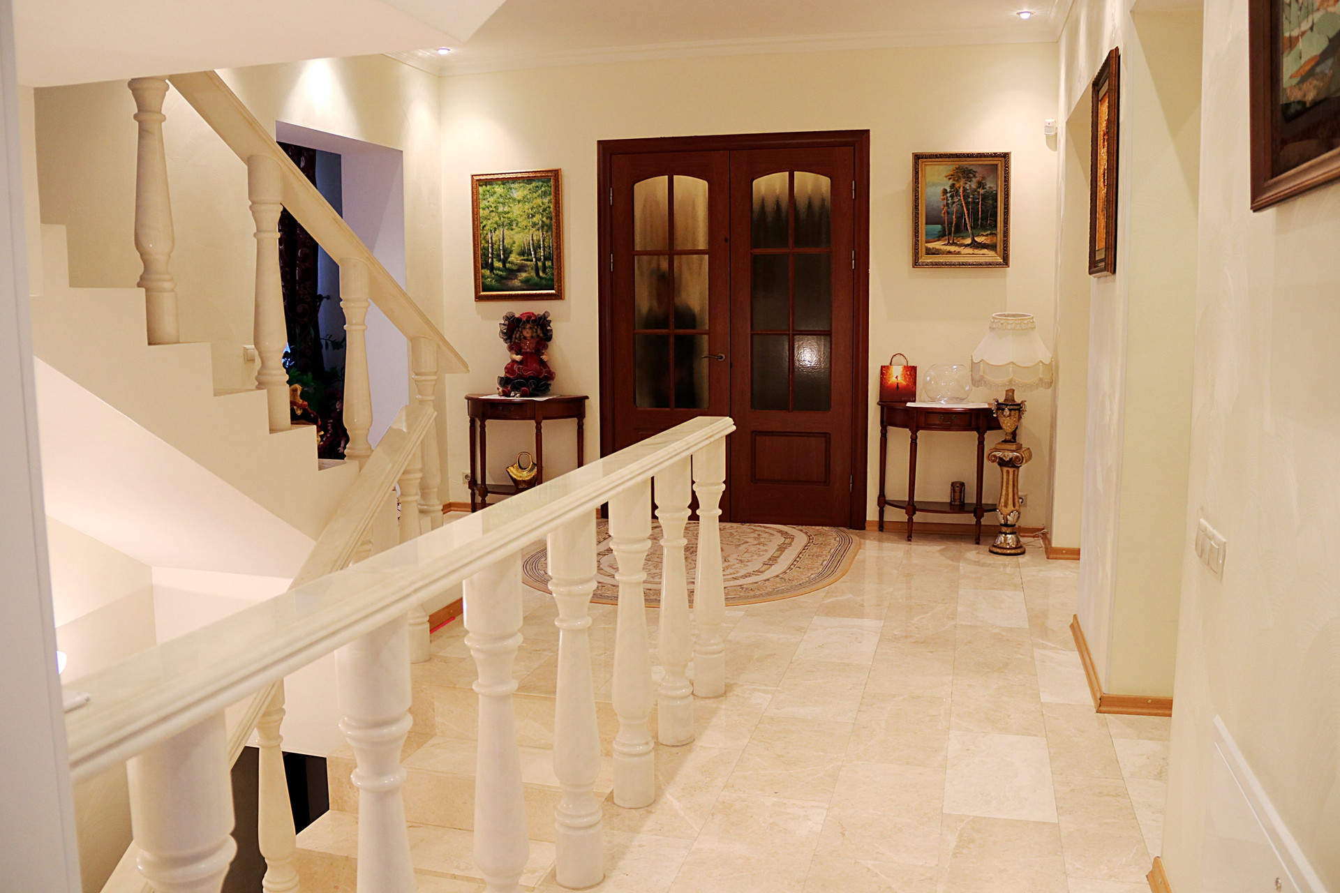 Дизайн внутреннего пространства выдержан в едином стиле это элегантная классика с аккуратными барочными деталями. Дом полностью укомплектован мебелью, люстры и светильники, узорчатые колонны и перила. В интерьере преобладают теплые оттенки с яркими акцентами в мебели и декоре, что в сочетании с обилием естественного света и натуральными материалами отделки (древесина, кожа, мрамор, хрусталь) создает атмосферу уюта и спокойствия.