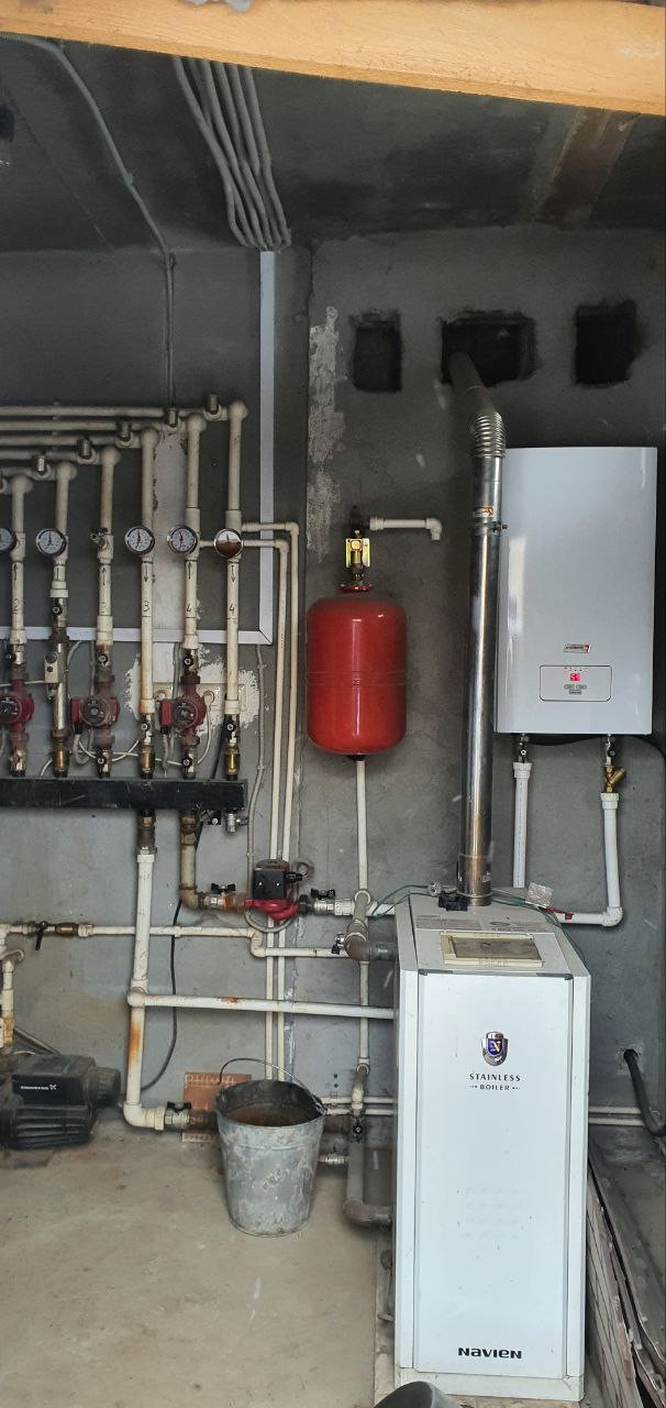 Отопление и горячая вода от электрического котла (вся система работает, разведено по всему дому). Магистральный газ по границе участка.