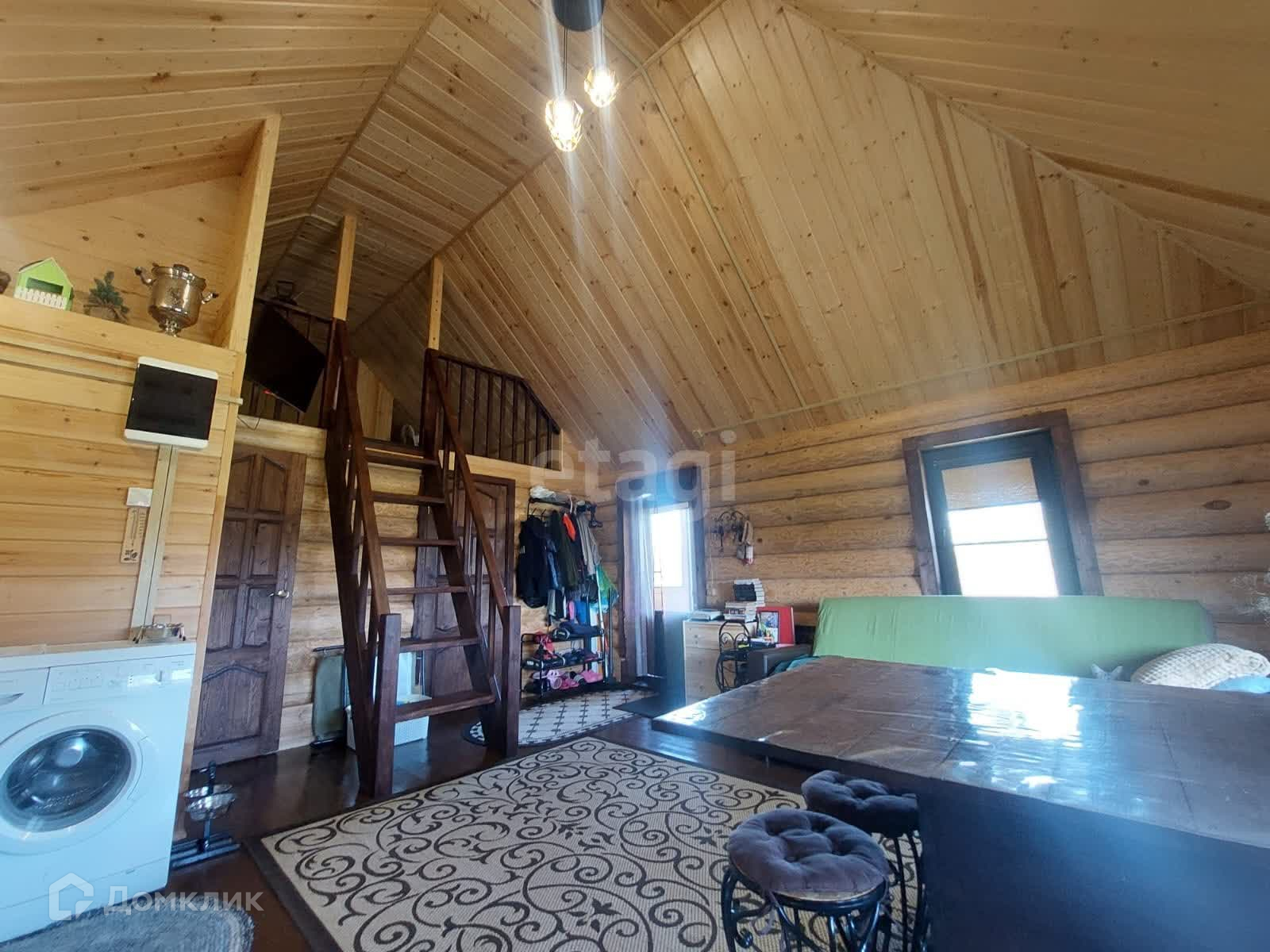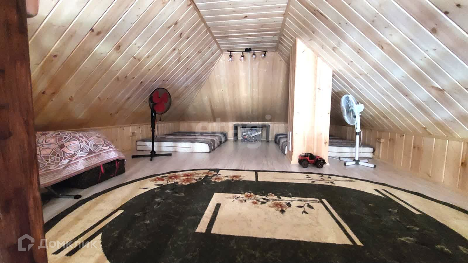 Дом - бревенчатый, на ленточном фундаменте. Мансардный этаж - жилой. Кровля утеплена, покрыта качественной металлочерепицей, толщиной 55 мм.