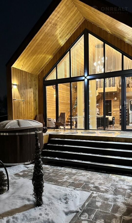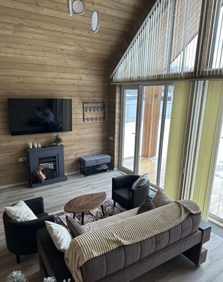 Гостиная оборудована стильным камином с панорамным видом на двор и выходом к чану.