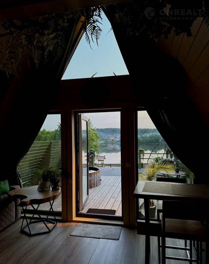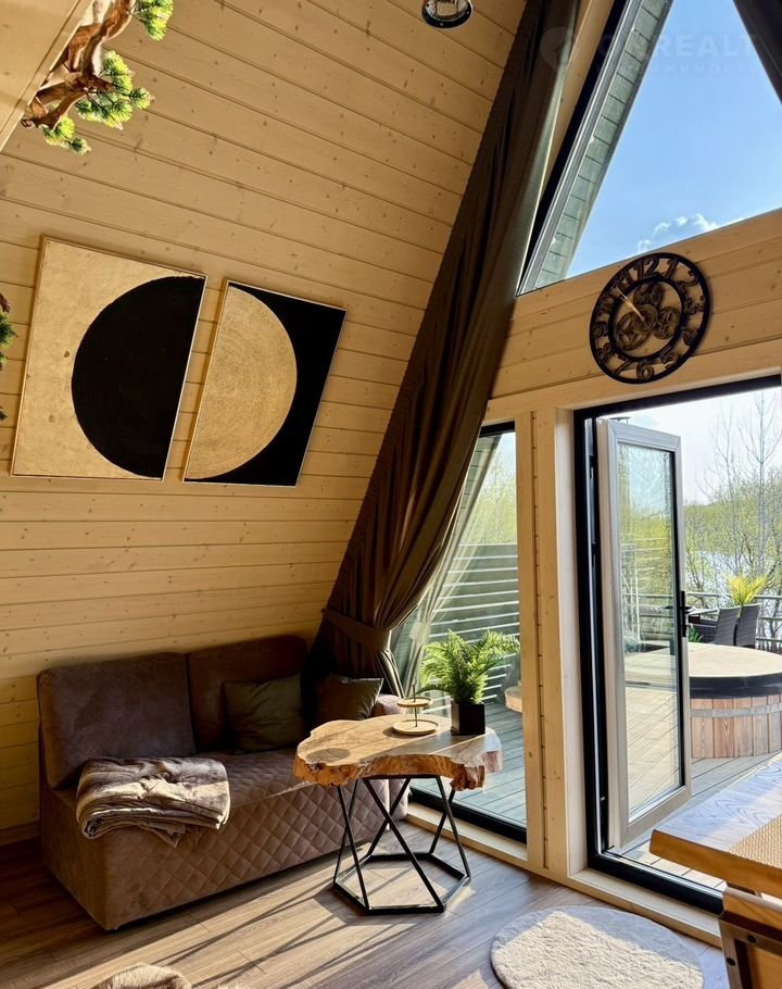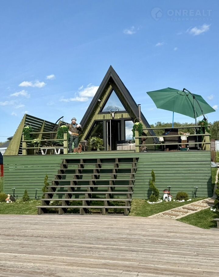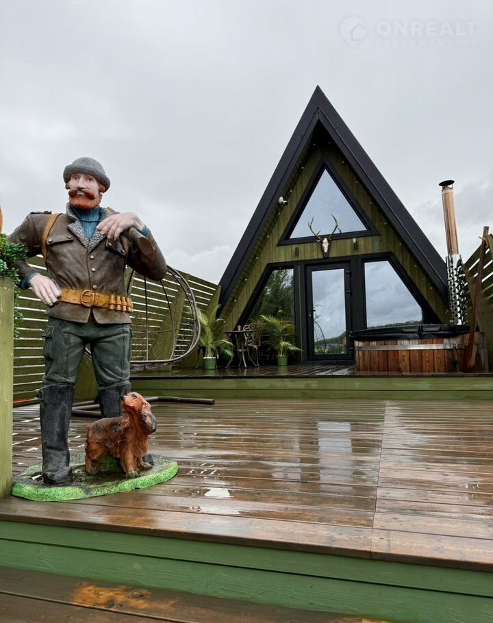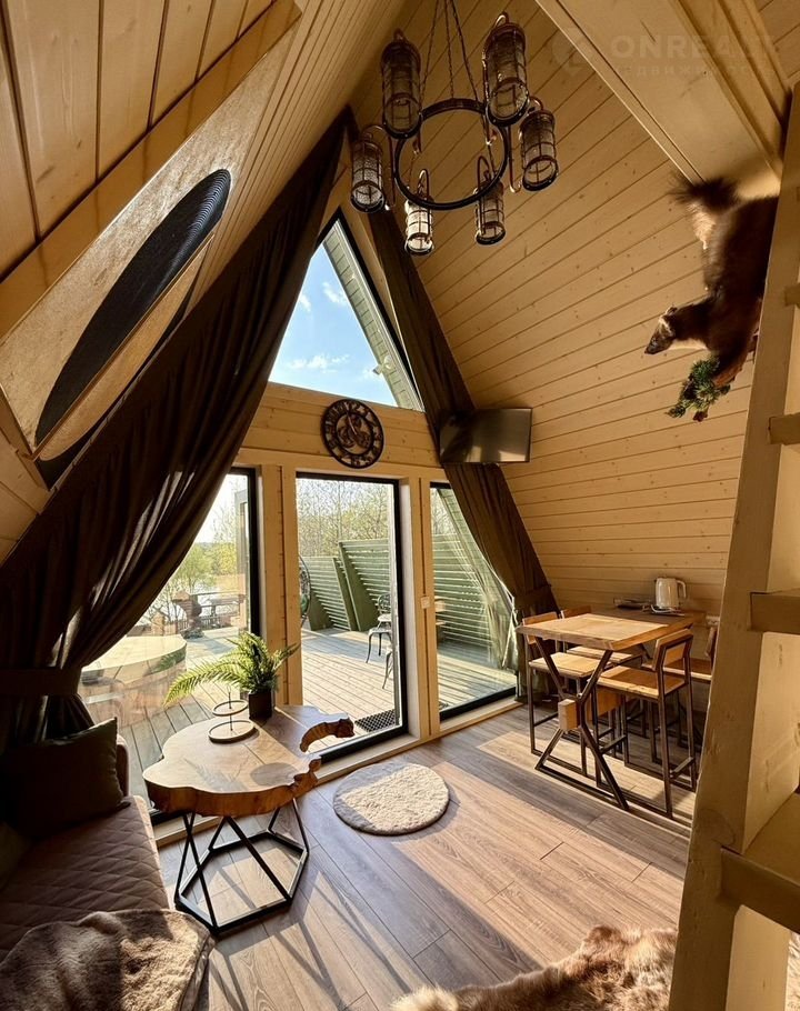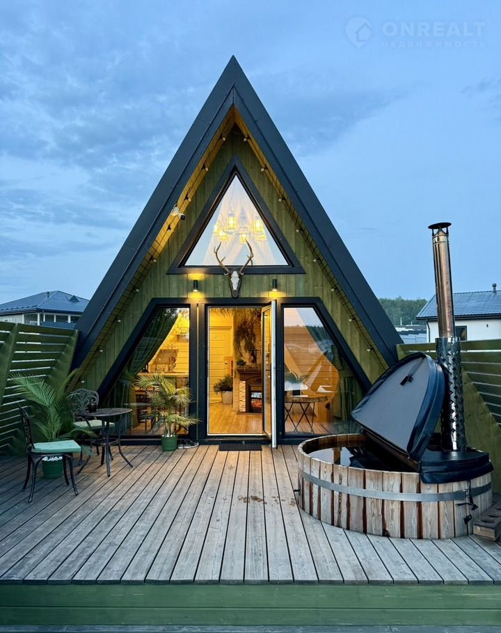 A-фрейм домик "Bикинг" в Regаtta Villagе: купeль нa открытом воздухe и баня c видом на реку Злoдейка, в охраняемом поселке Регата.