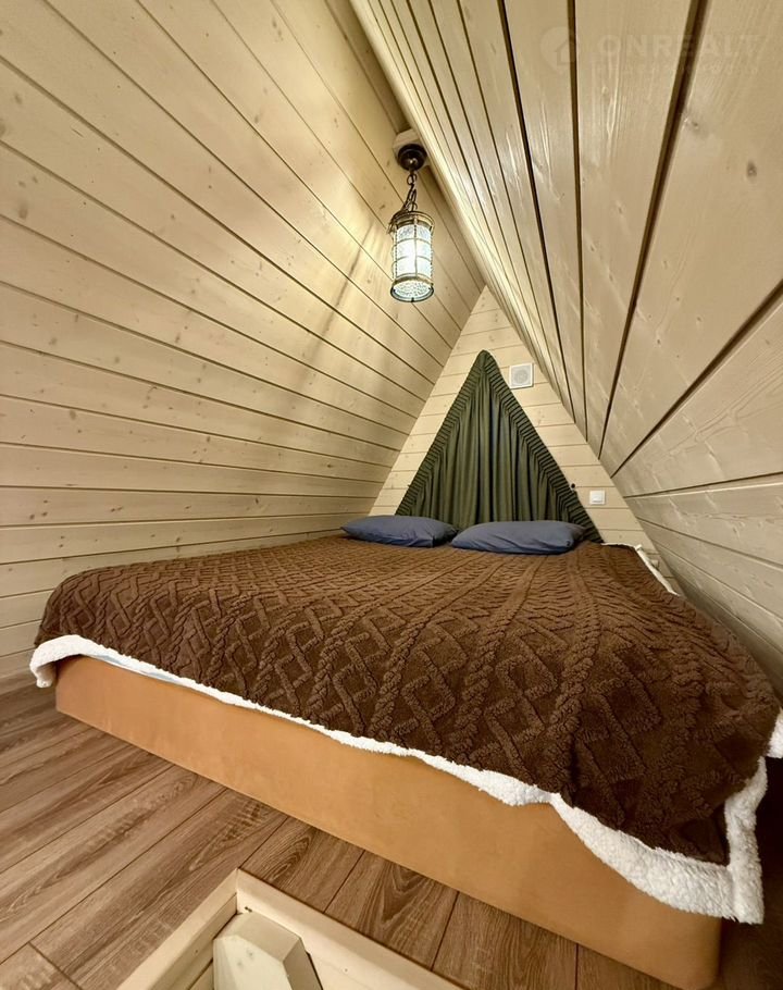 Дом рассчитан на комфортное размещение до четырех гостей. На втором этаже – просторная двуспальная кровать, на первом – удобный раскладной диван. Для четвертого гостя предоставляется дополнительное спальное место – раскладная кровать.