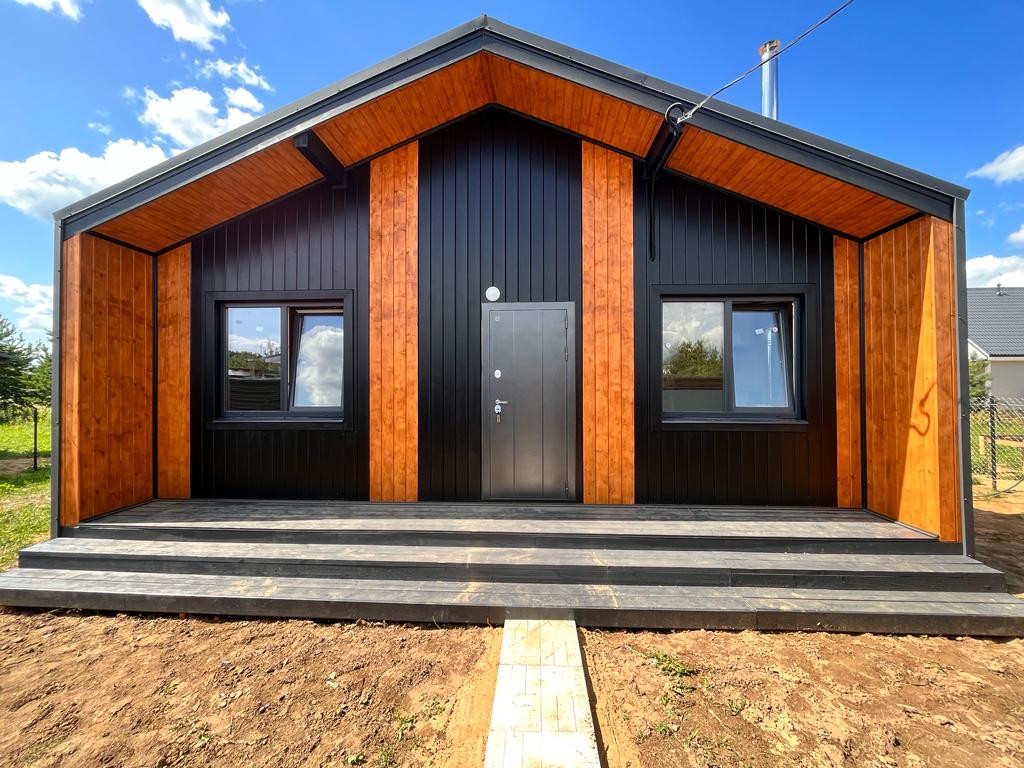 В доме кухня-гостиная площадью 22 кв. м с выходом на террасу 24 кв. м, две комнаты по 11 кв. м, санузел, холл и техническое помещение.