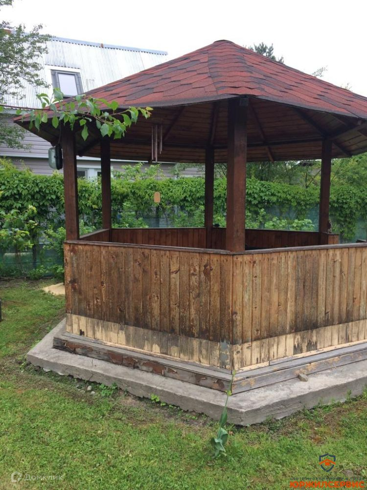 Фундамент под всеми строениями ленточный (кроме беседки). Все строения щитовые. Отделка дома и кухни  сайдинг.