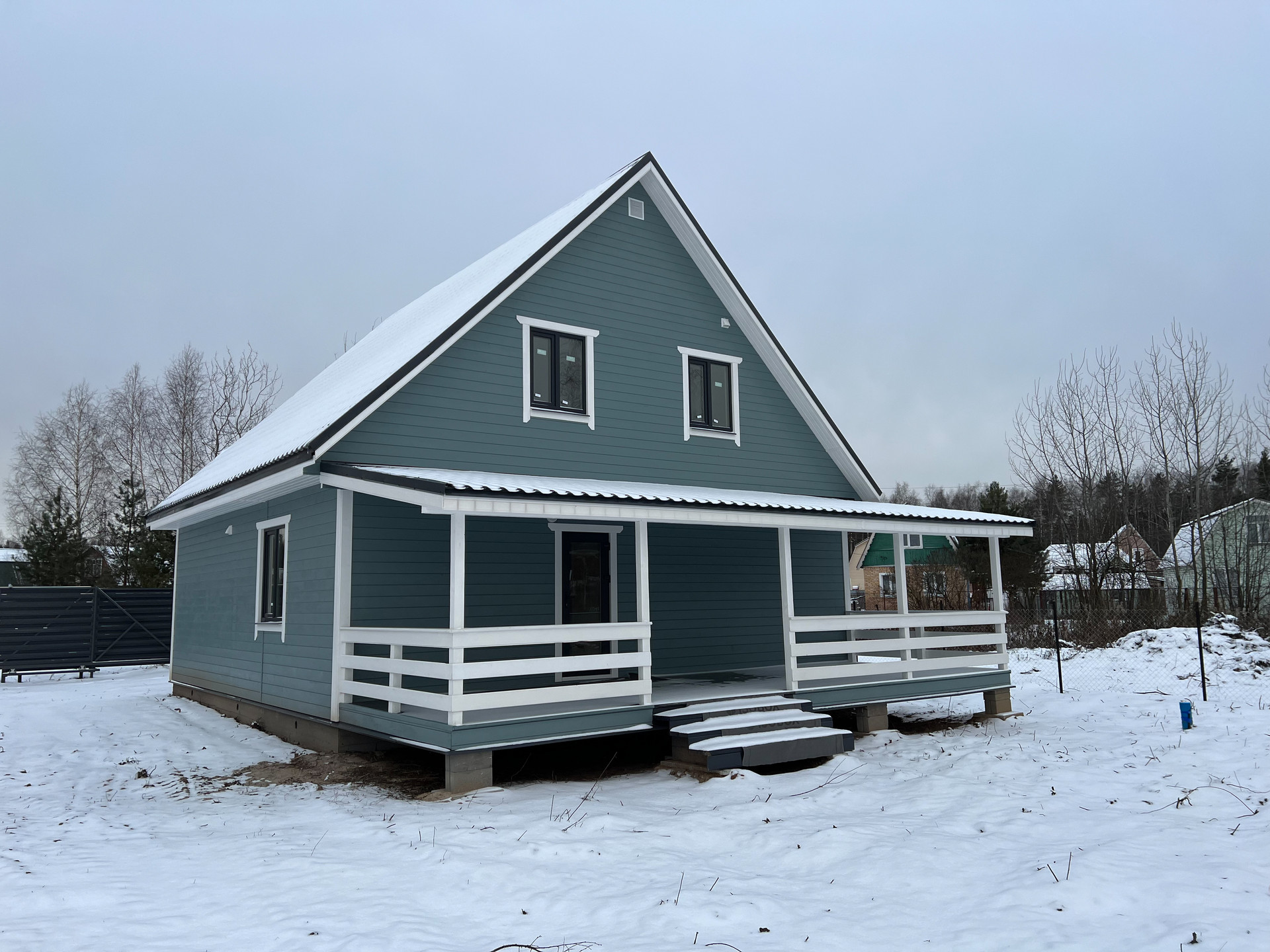 Дом построен по каркасной технологии с утеплением 150 мм (стены, потолок и перекрытия) и 200 мм (пол).