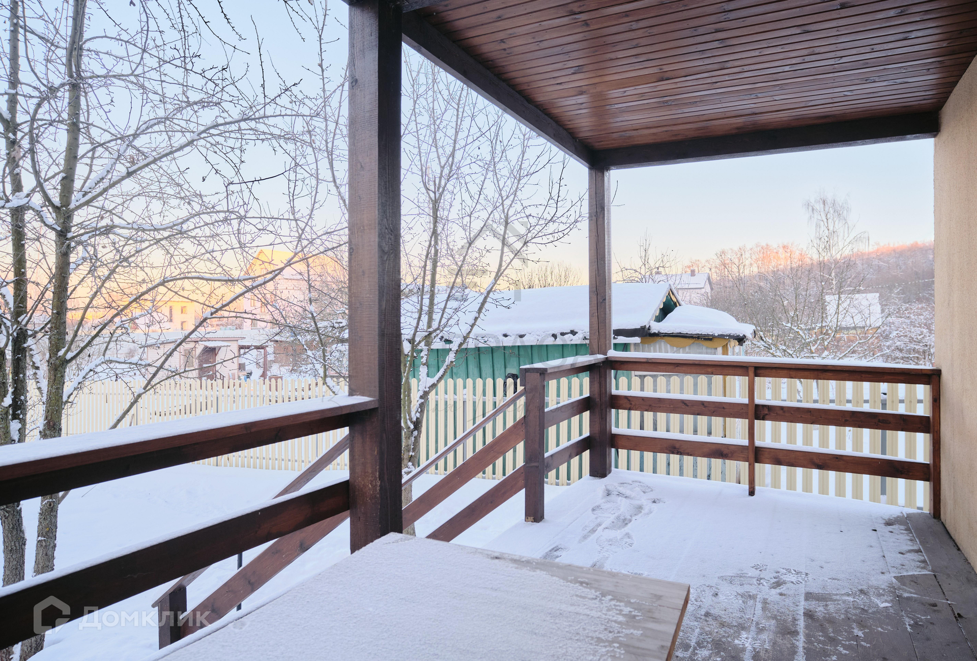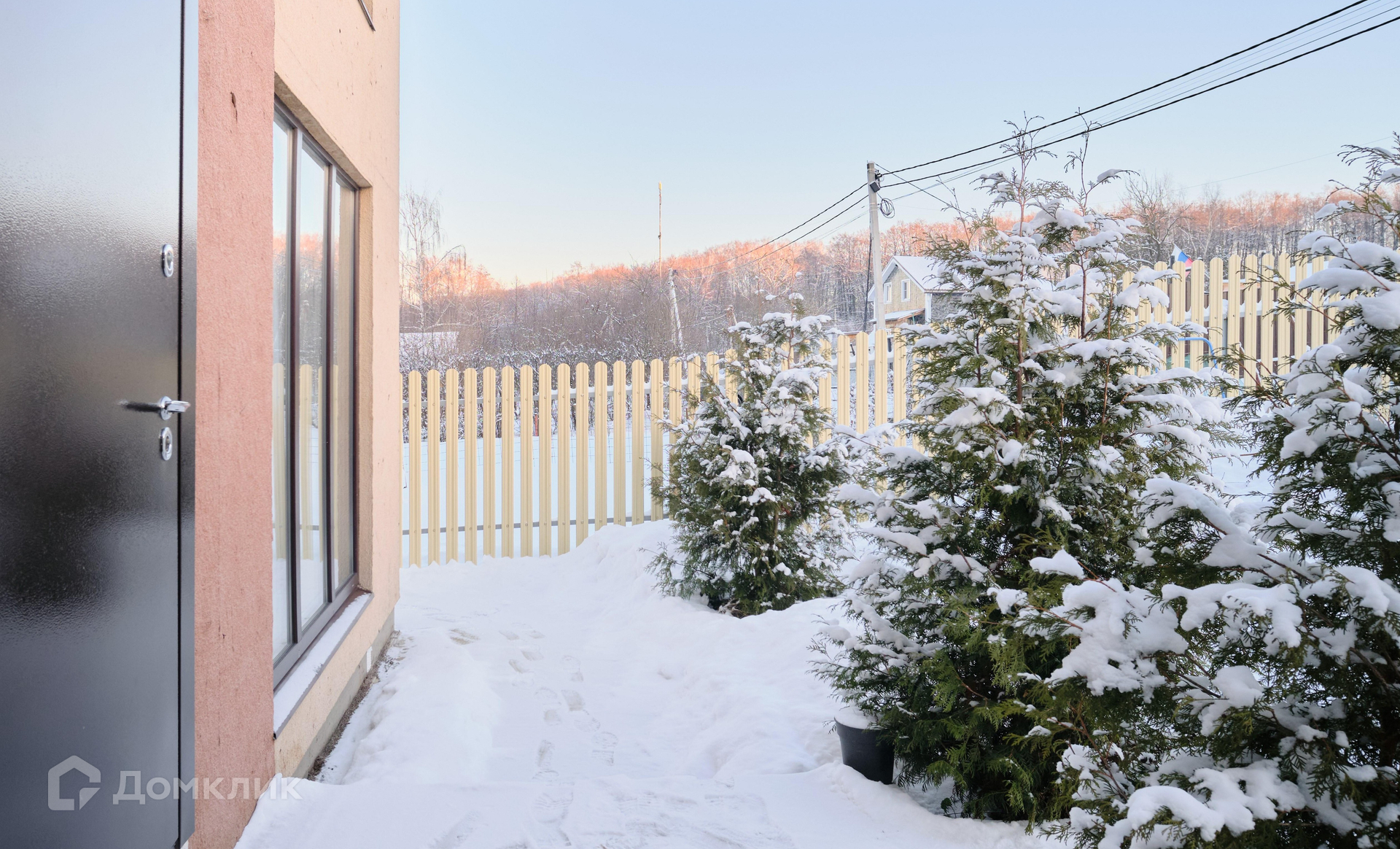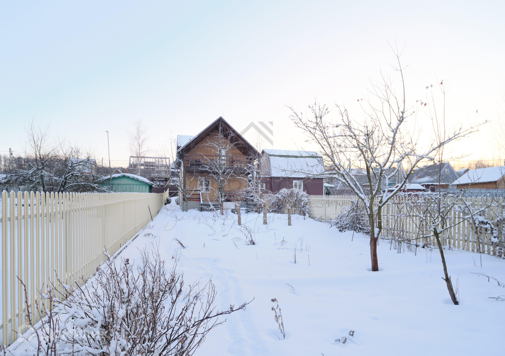 Территорию ограждает стильный евроштакетник.