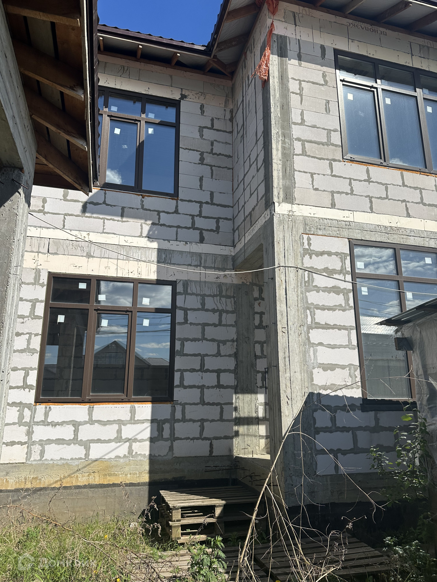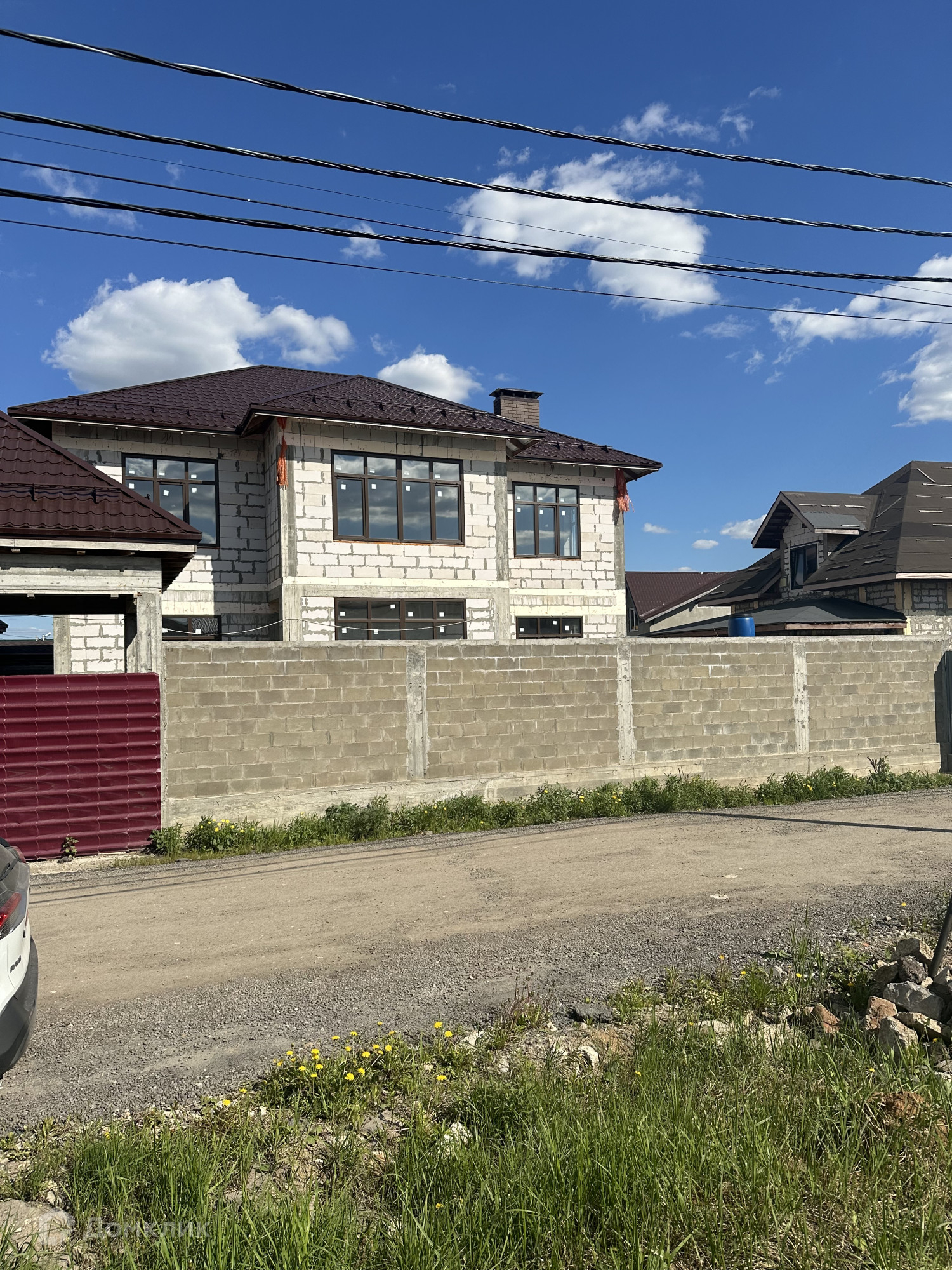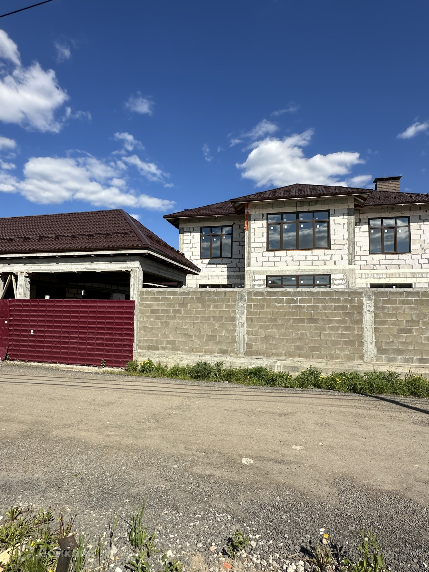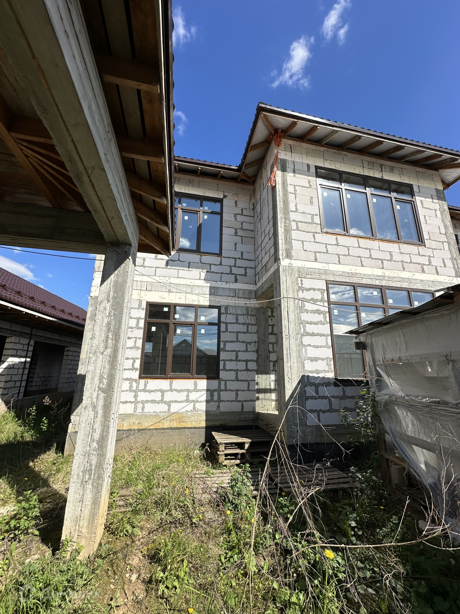 Дом построен из пенобетонных блоков. Полноценные два этажа, фундамент бетонный ленточный на сваях, пол первого этажа железобетонная плита, межэтажные перекрытия железобетонные плиты, выполнены армопояса, монолитные оконные и дверные перемычки. На 2-м этаже по планировке предполагается 4 спальные комнаты и сан. узел, на 1-м этаже 3 спальные комнаты, гостиная, кухня, сан.узел., пластиковые стеклопакеты, крыша из металлочерепицы, подведено электричество к дому, газ по границе, скважина, сам участок правильной прямоугольной формы. В поселке многие дома с круглогодичным проживанием, приличные соседи. Дом расположен в середине поселка, отдален от шумных улиц и дорог, со второго этажа открывается прекрасный вид на прилегающие территории.
