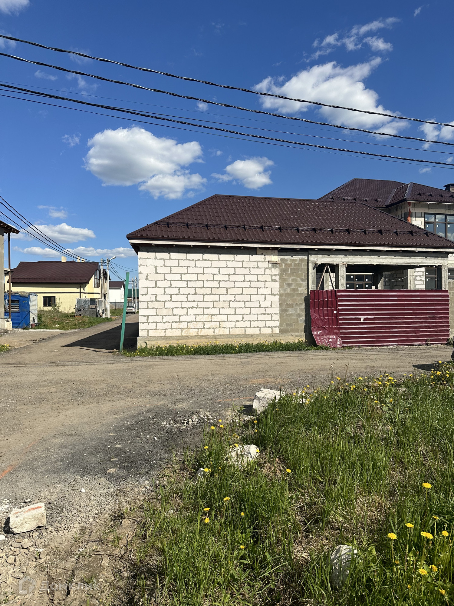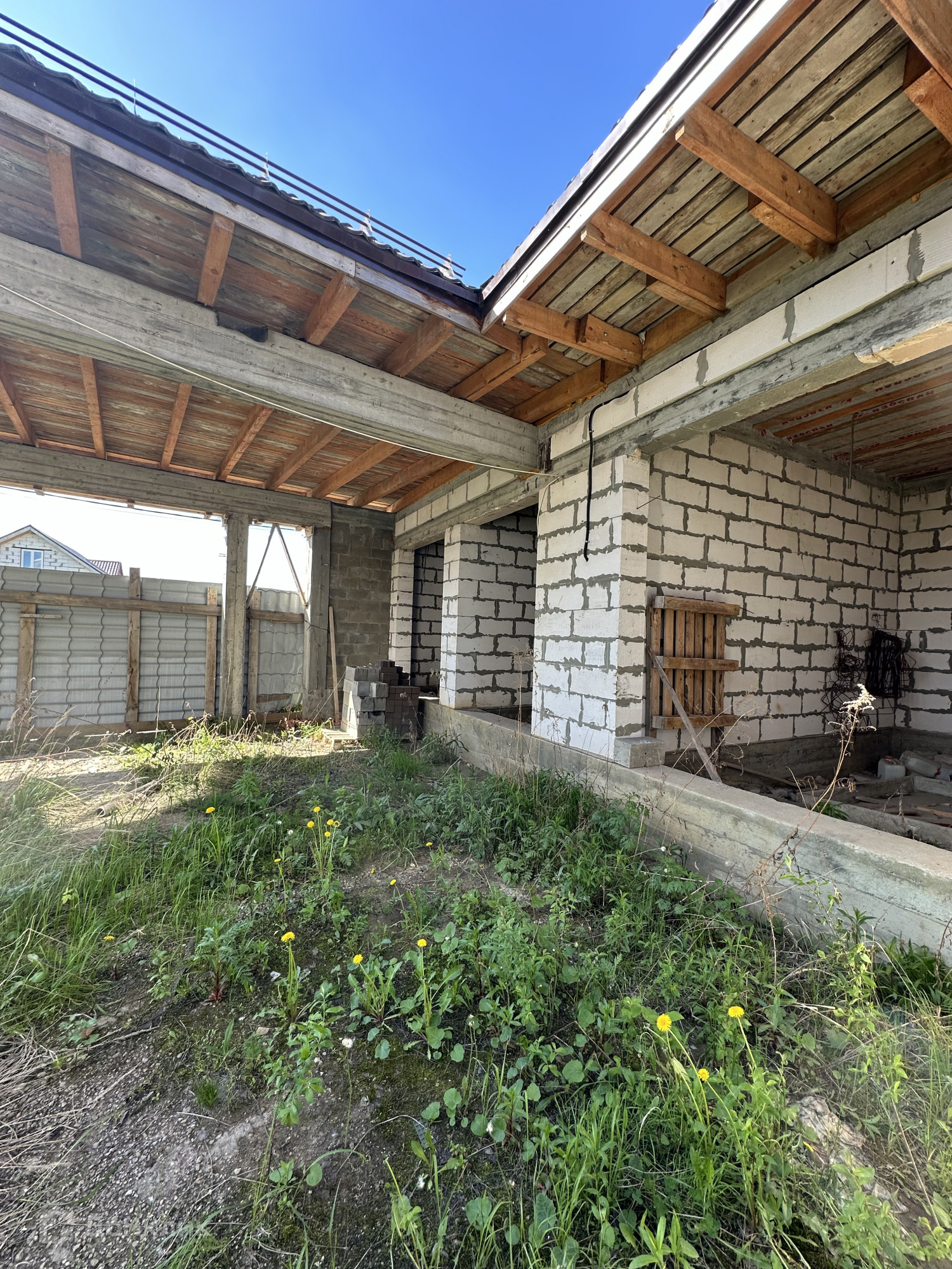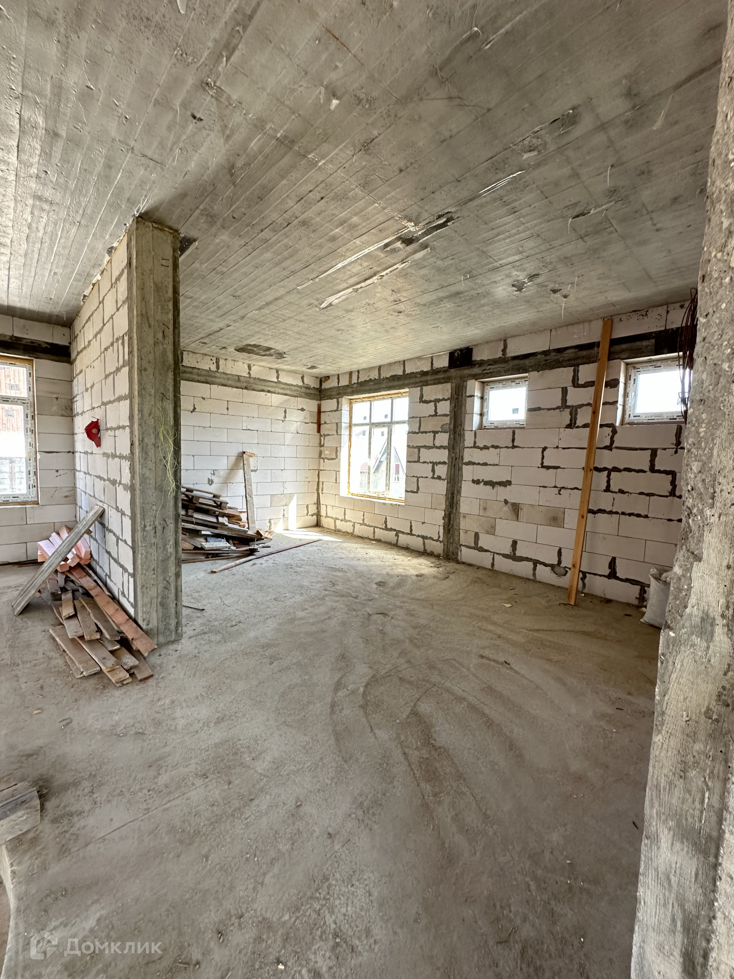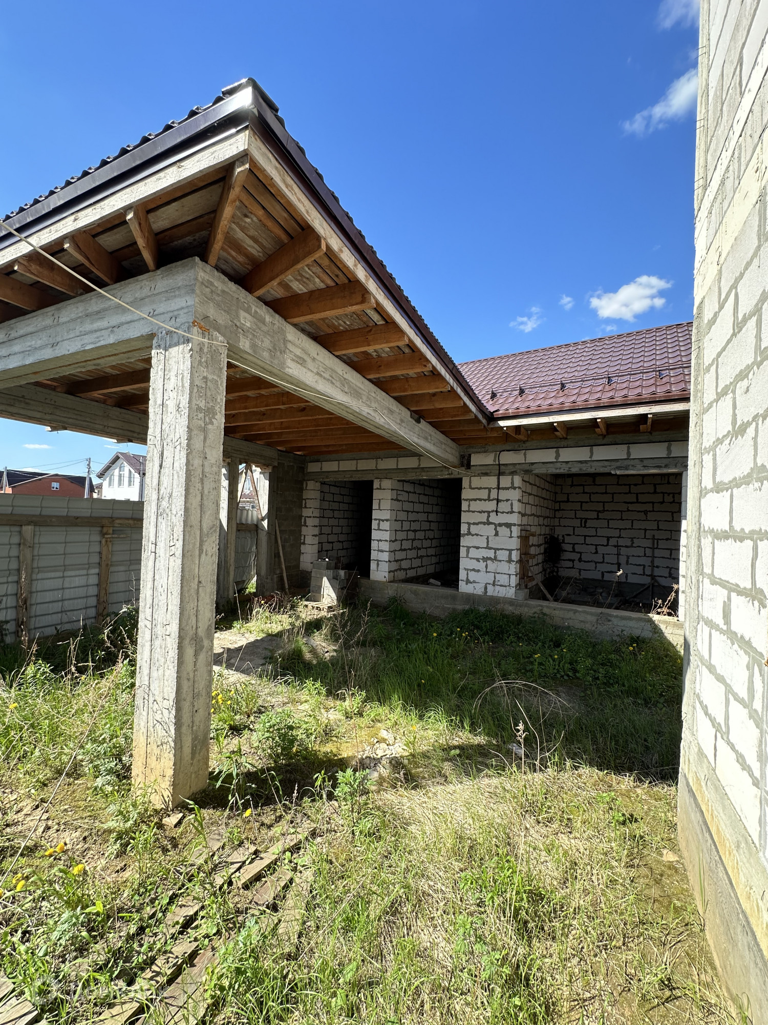 Дом построен из пенобетонных блоков. Полноценные два этажа, фундамент бетонный ленточный на сваях, пол первого этажа железобетонная плита, межэтажные перекрытия железобетонные плиты, выполнены армопояса, монолитные оконные и дверные перемычки. На 2-м этаже по планировке предполагается 4 спальные комнаты и сан. узел, на 1-м этаже 3 спальные комнаты, гостиная, кухня, сан.узел., пластиковые стеклопакеты, крыша из металлочерепицы, подведено электричество к дому, газ по границе, скважина, сам участок правильной прямоугольной формы. В поселке многие дома с круглогодичным проживанием, приличные соседи. Дом расположен в середине поселка, отдален от шумных улиц и дорог, со второго этажа открывается прекрасный вид на прилегающие территории.