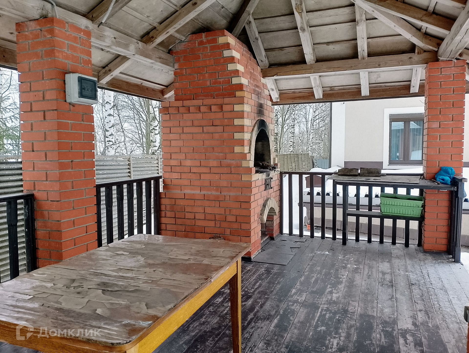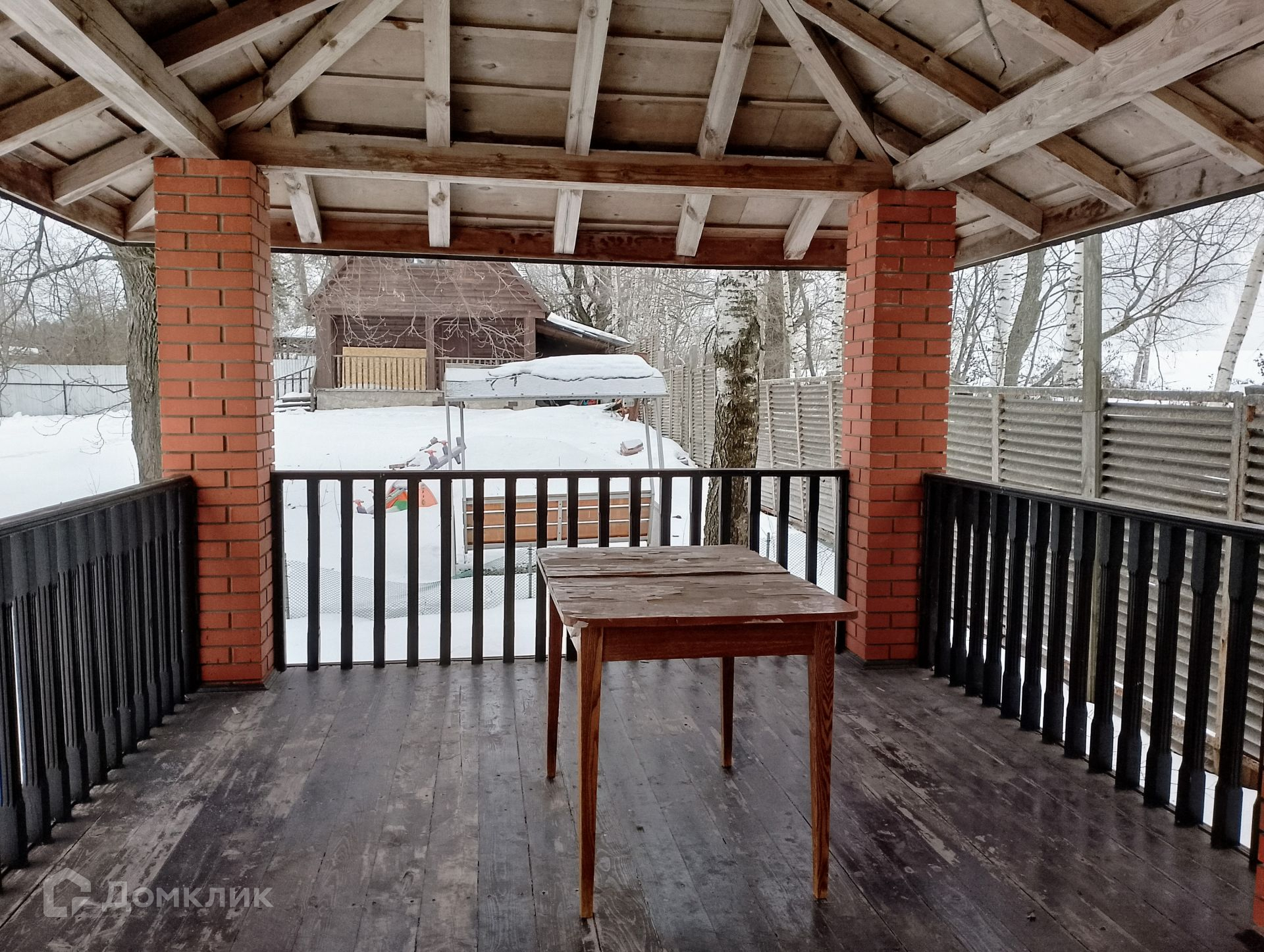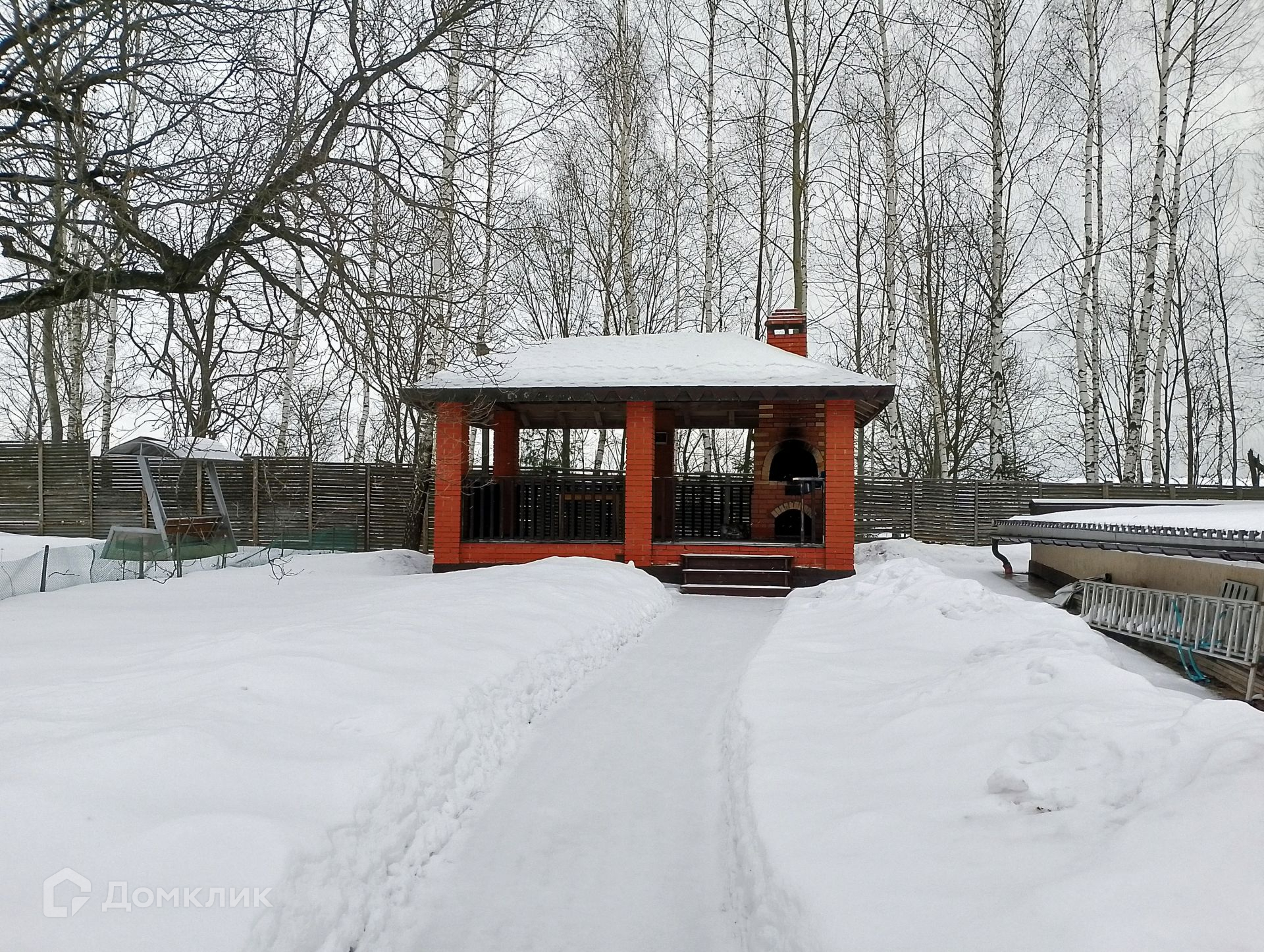 На участке под кроной большого раскидистого дуба располагается просторная беседка с мангальной зоной. По периметру участка проложены дорожки.