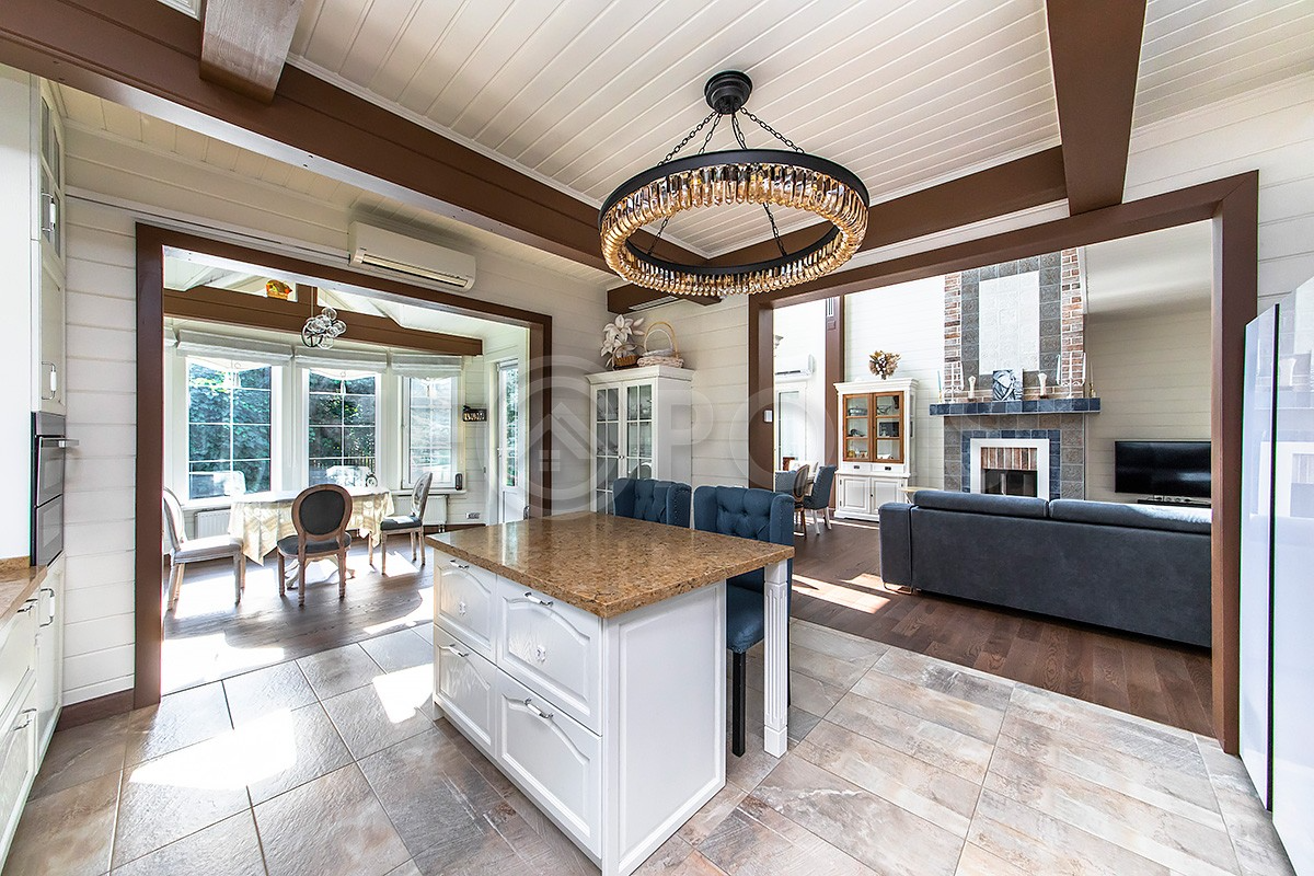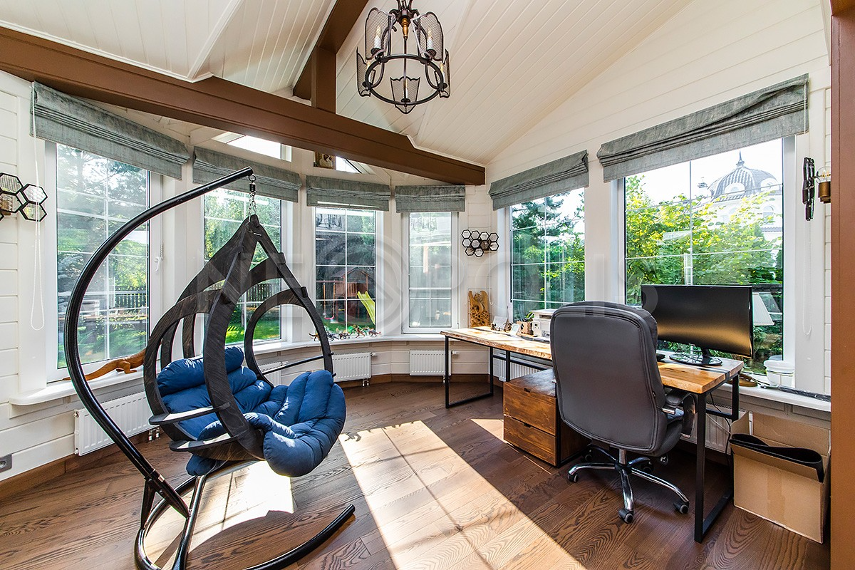 1 этаж: прихожая, кухня-столовая с выходом на веранду, гостиная с камином и со вторым светом, кабинет, спальня, гостевой с\у, постирочная, котельная;