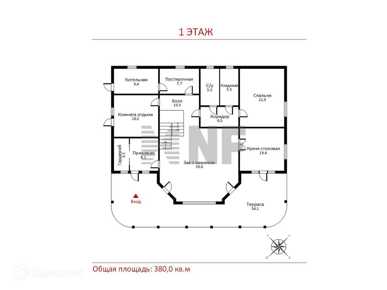 1 этаж: двухсветный каминный зал, гостиная с выходом на веранду, кухня- столовая с выходом на веранду, кабинет, спальная комната для гостей, ванная и гардеробная комнаты, прачечная, бойлерная, террасы и веранды;