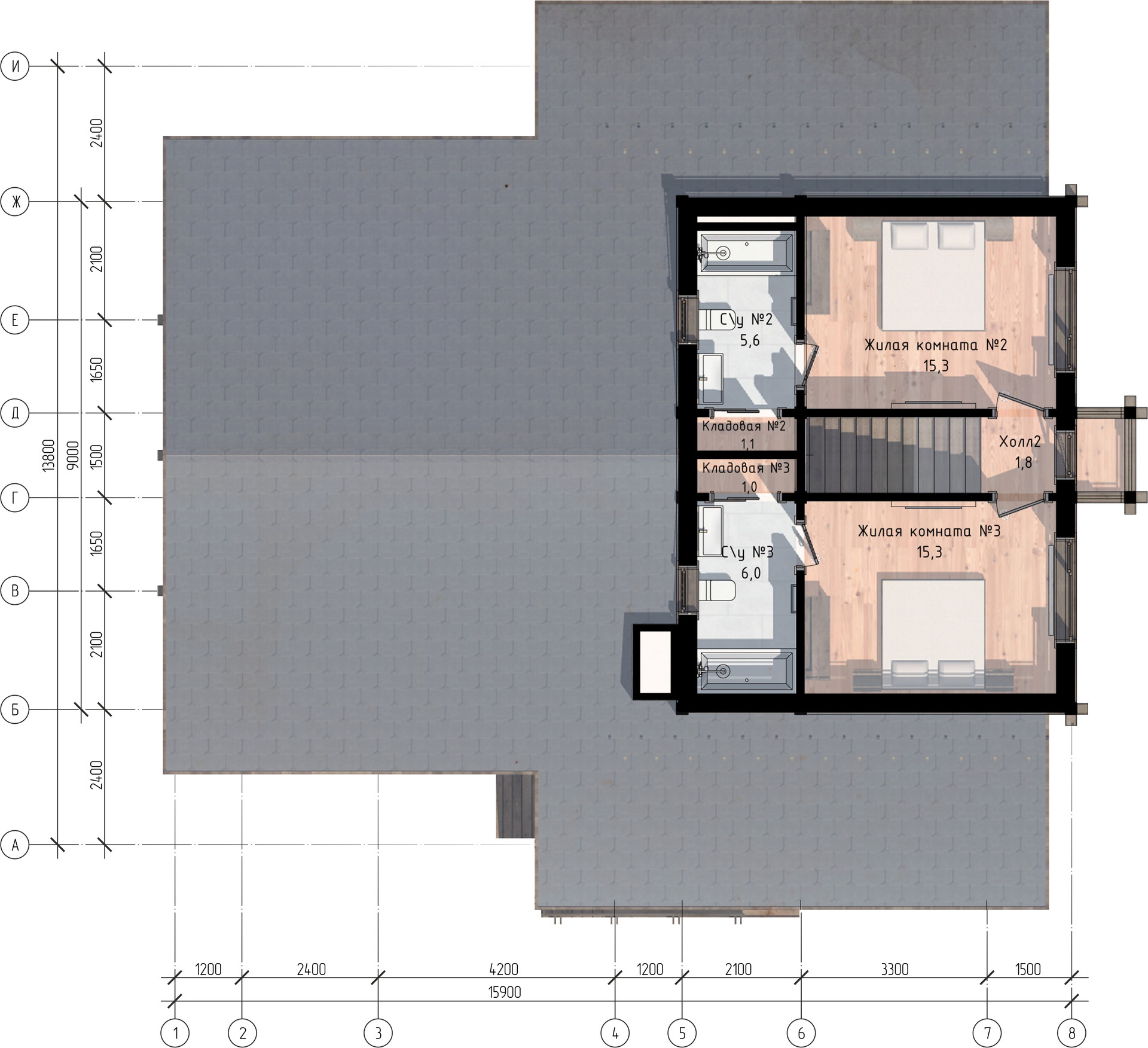 Второй этаж предлагает две комфортные спальни с санузлами, а из холла предусмотрен выход на балкон.