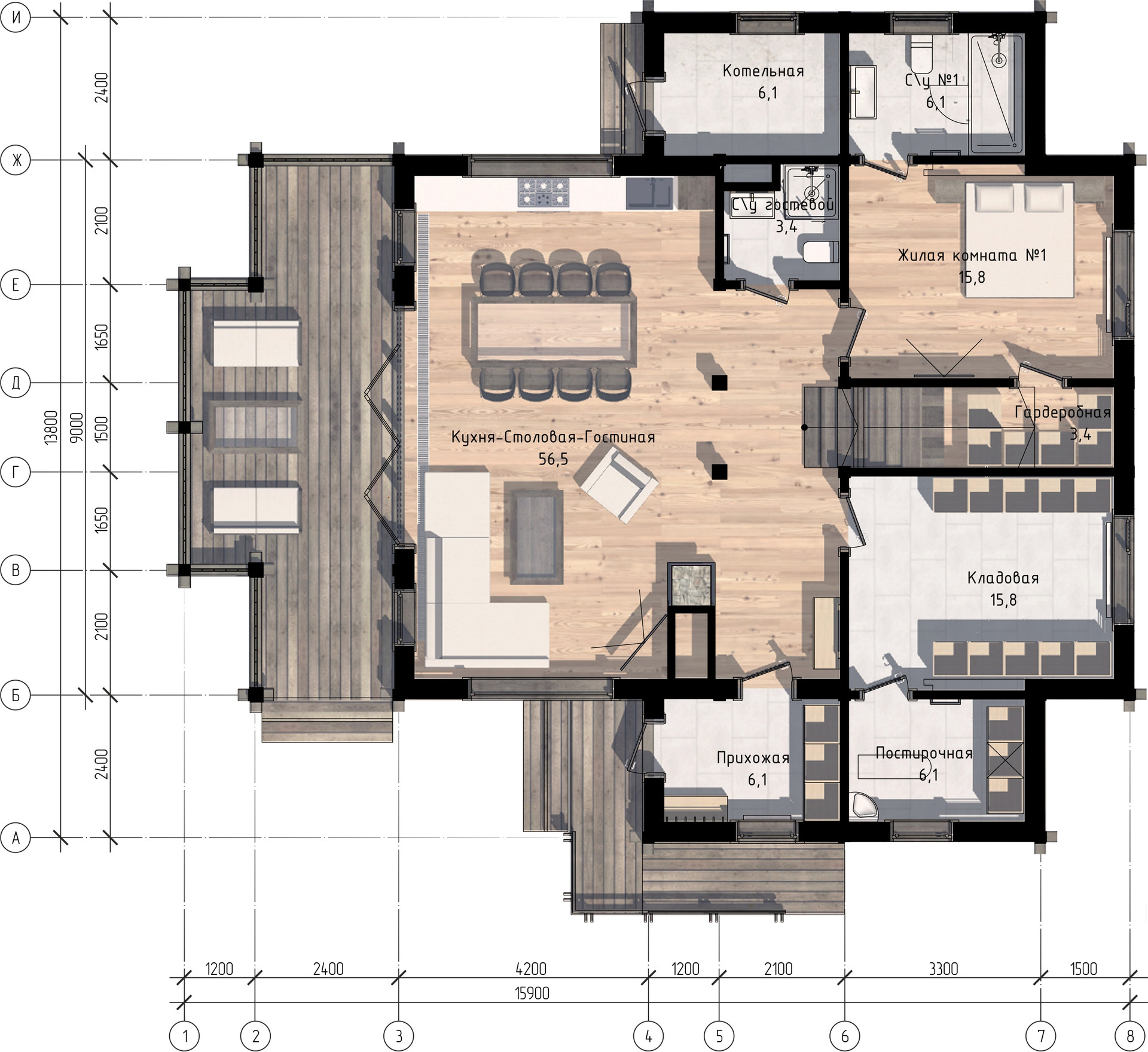 Первый этаж, помимо выделяющихся открытой террасы и входной группы, вмещает в себя котельную, 2 раздельные комнаты, каждая со своим санузлом, просторный гардероб и объединенную зону кухни, столовой, гостиной.