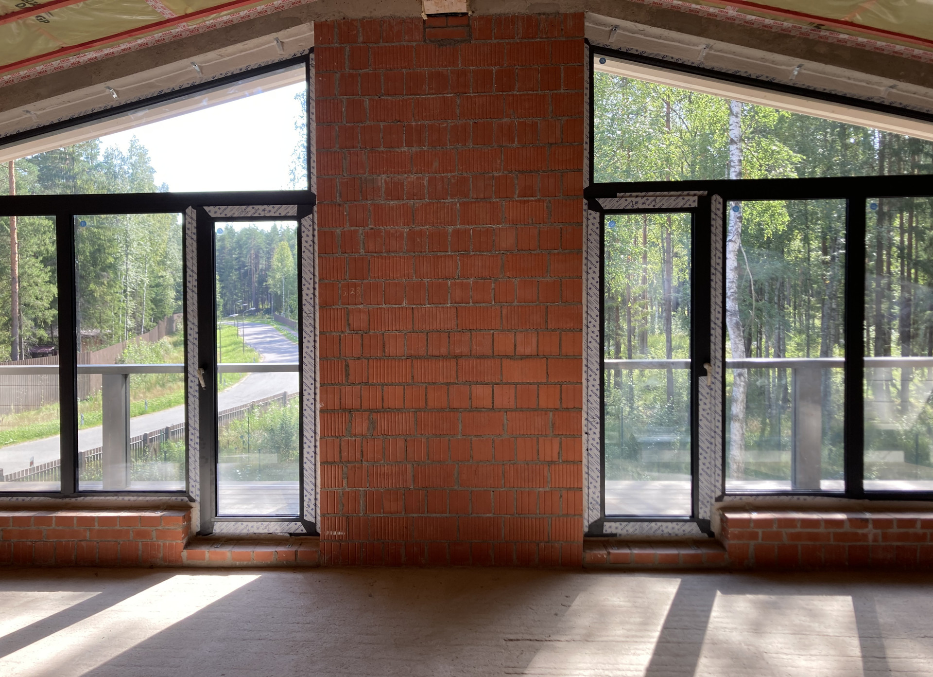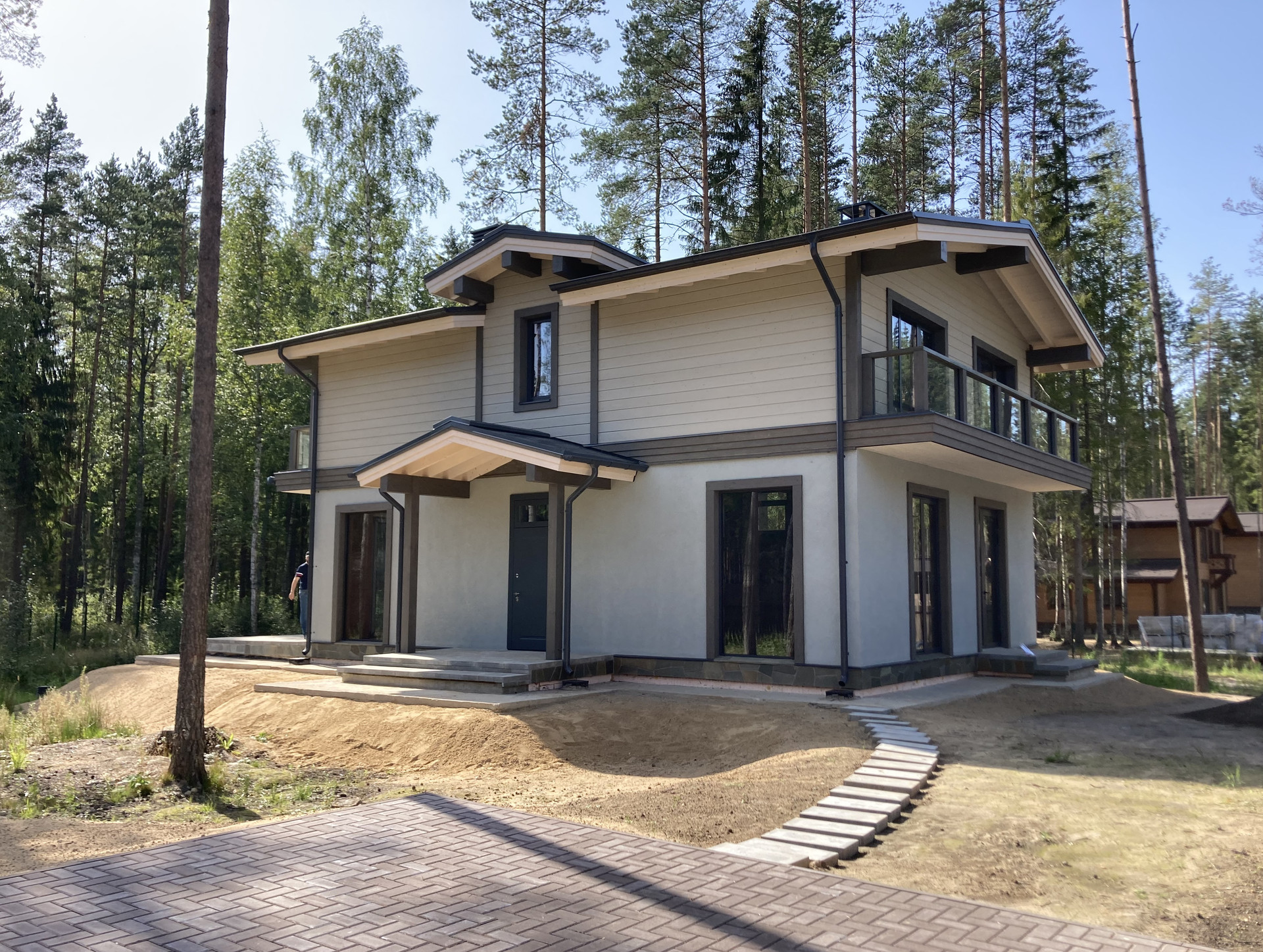 Дом возведен из керамического поризованного кирпича на монолитном фундаменте, отделка фасада по первому этажу выполнена штукатуркой и облицована имитатором бруса – по второму. Цветовое решение фасадов выполнено в скандинавском стиле в светлых, спокойных тонах. Кровельное покрытие – гибкая черепица, долговечная и бесшумная, укомплектована системами водоотвода, снегозадержания и молниезащитой. Окна и террасные двери выполнены из алюминиевого профиля. Просторная терраса покрыта крупноформатной тротуарной плиткой и дополнительно оснащена маркизой кассетного типа.