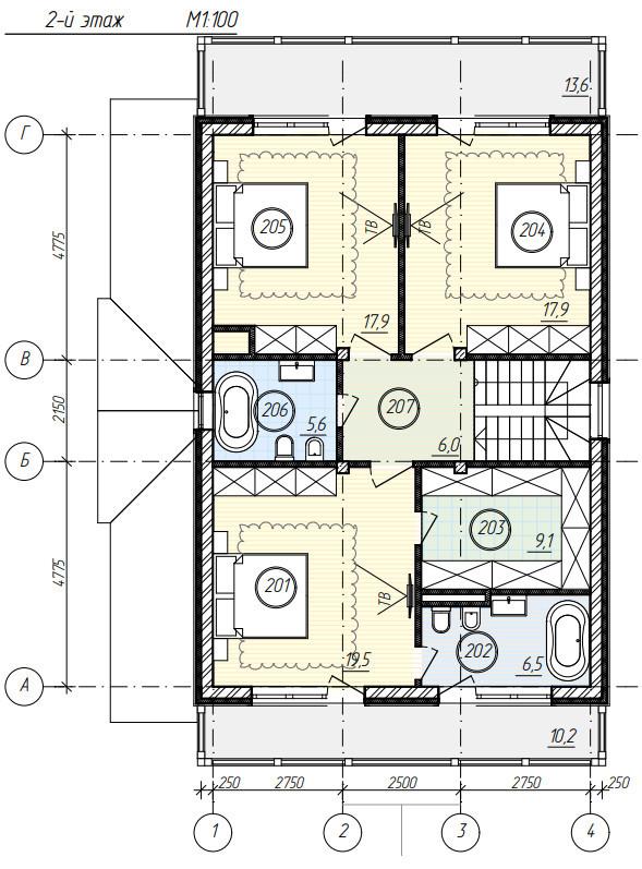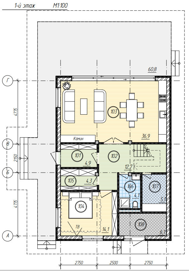 Половина первого этажа отведена под кухню-гостиную с панорамными окнами в пол и выходом на просторную террасу, в другой половине разместилась котельная, а оставшееся свободное пространство можно организовать сообразно потребностям семьи: обустроить кабинет или жилую комнату, сауну или постирочную, тамбур, гардеробную и санузел. Второй этаж отведен под приватную зону: здесь с комфортом разместятся 3 или 4 спальни.