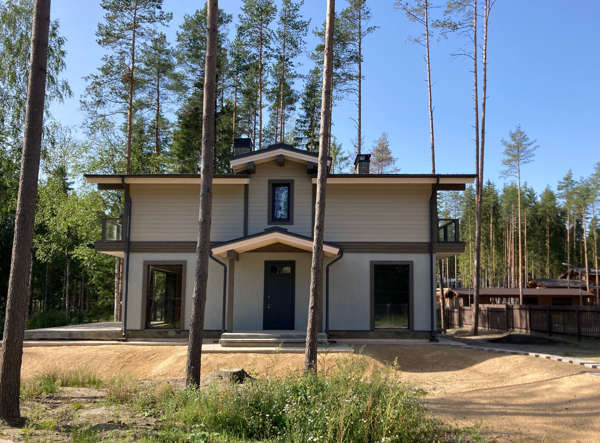 Светлый и просторный дом в окружении густого соснового леса расположен в поселке премиум класса Лесная деревня в 10 км от Санкт-Петербурга, к востоку от знаменитого курорта Охта Парк.