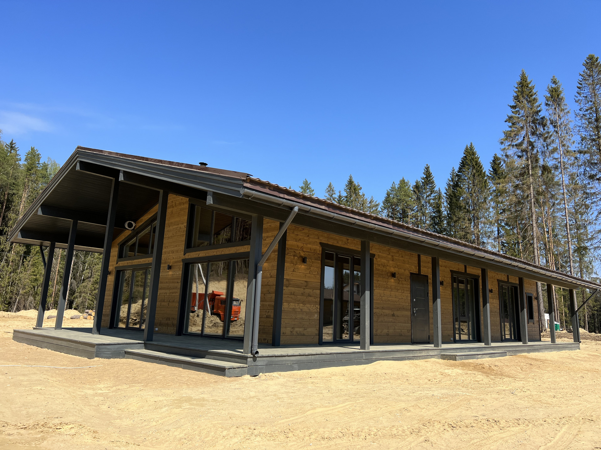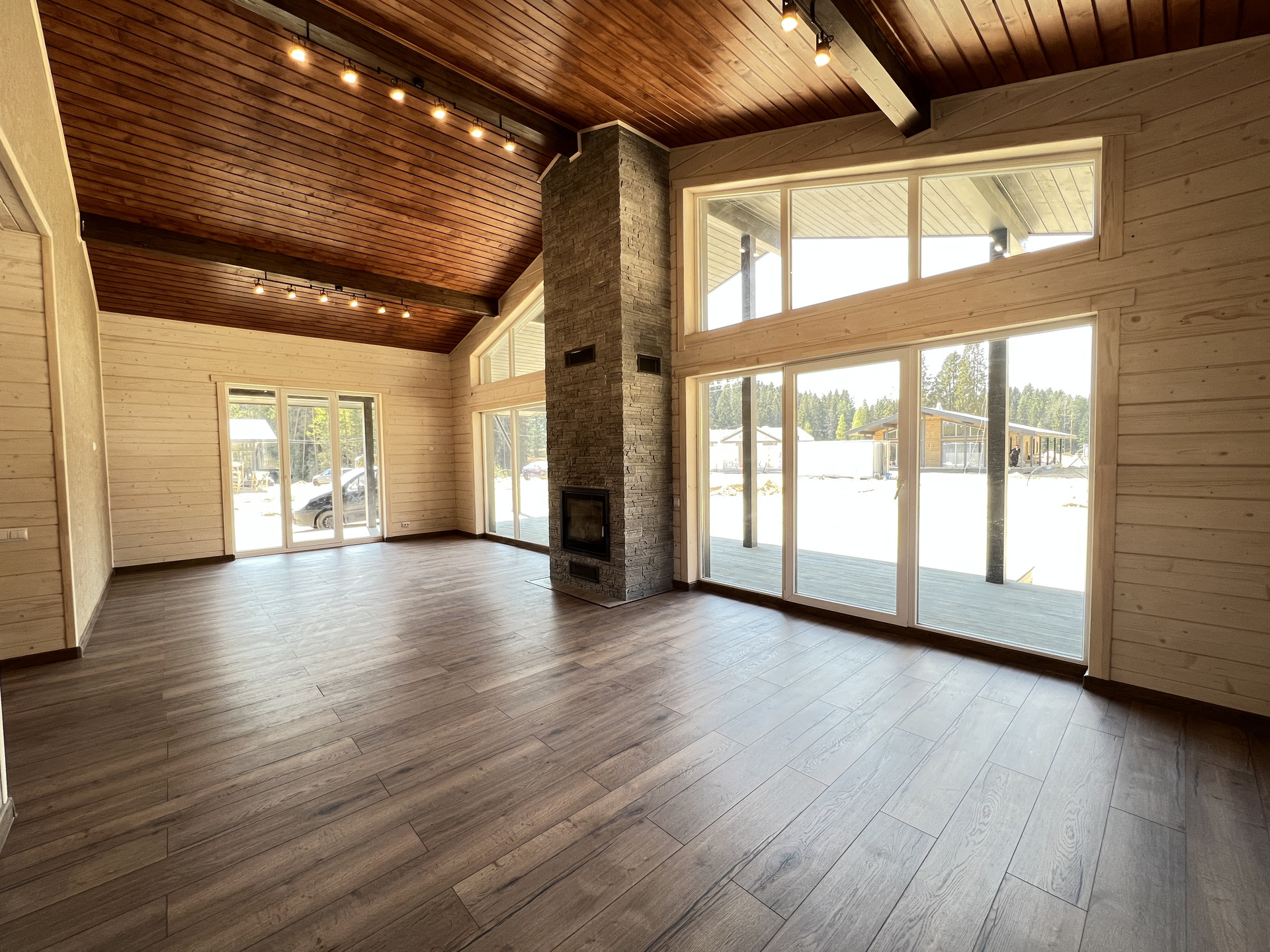 Просторная зона гостиной-кухни-столовой, 4 спальни, 2 санузла, камин, сауна, гардеробная, шикарная терраса, панорамные окна