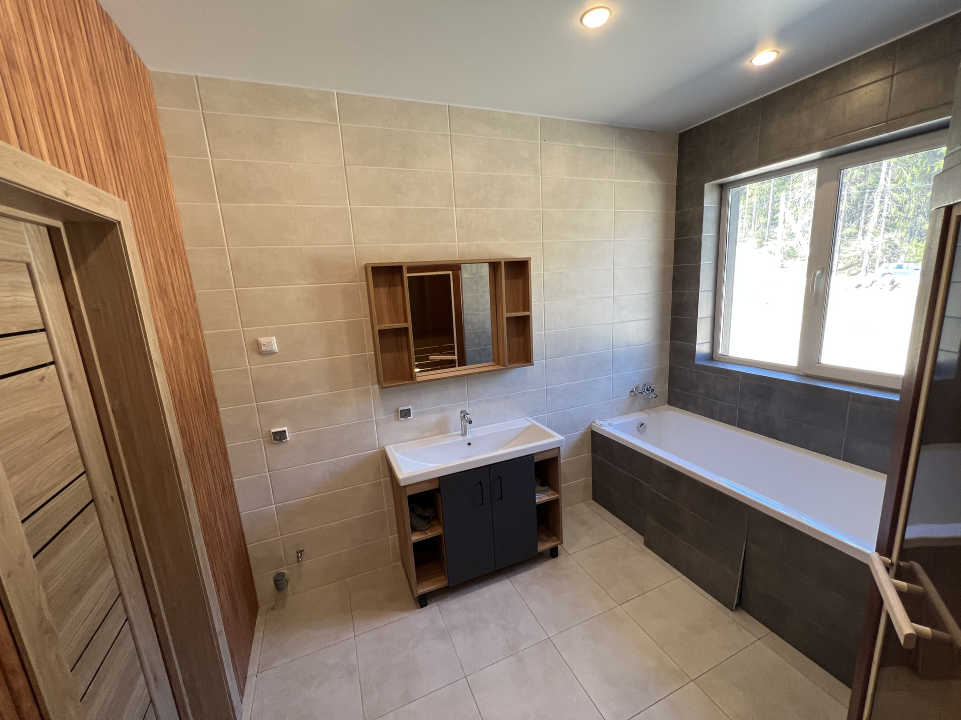 Отделка стен – имитация бруса, высококачественные крашеные обои, декоративная штукатурка, полы - ламинат/керамогранит, ванные комнаты отделаны керамогранитом, полностью укомплектован сантехникой.