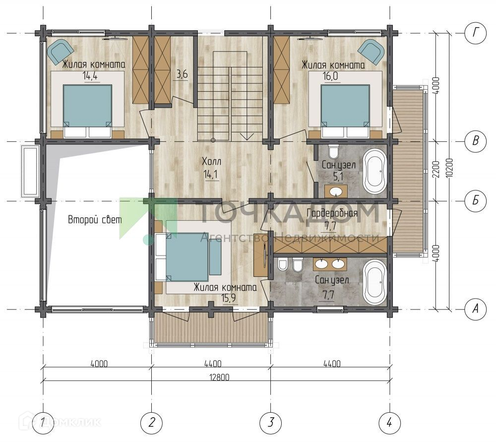 На втором этаже расположены 3 спальни, 2 гардеробные и 2 санузла.