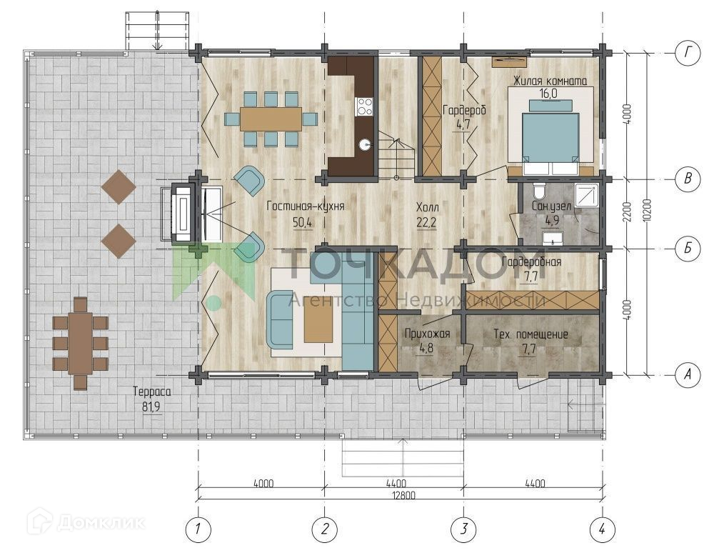 На первом этаже располагаются кухня-гостиная (по проекту можно отделить перегородкой) с уютной зоной у камина, комната 16 м2, гардеробная, котельная, 1 санузел