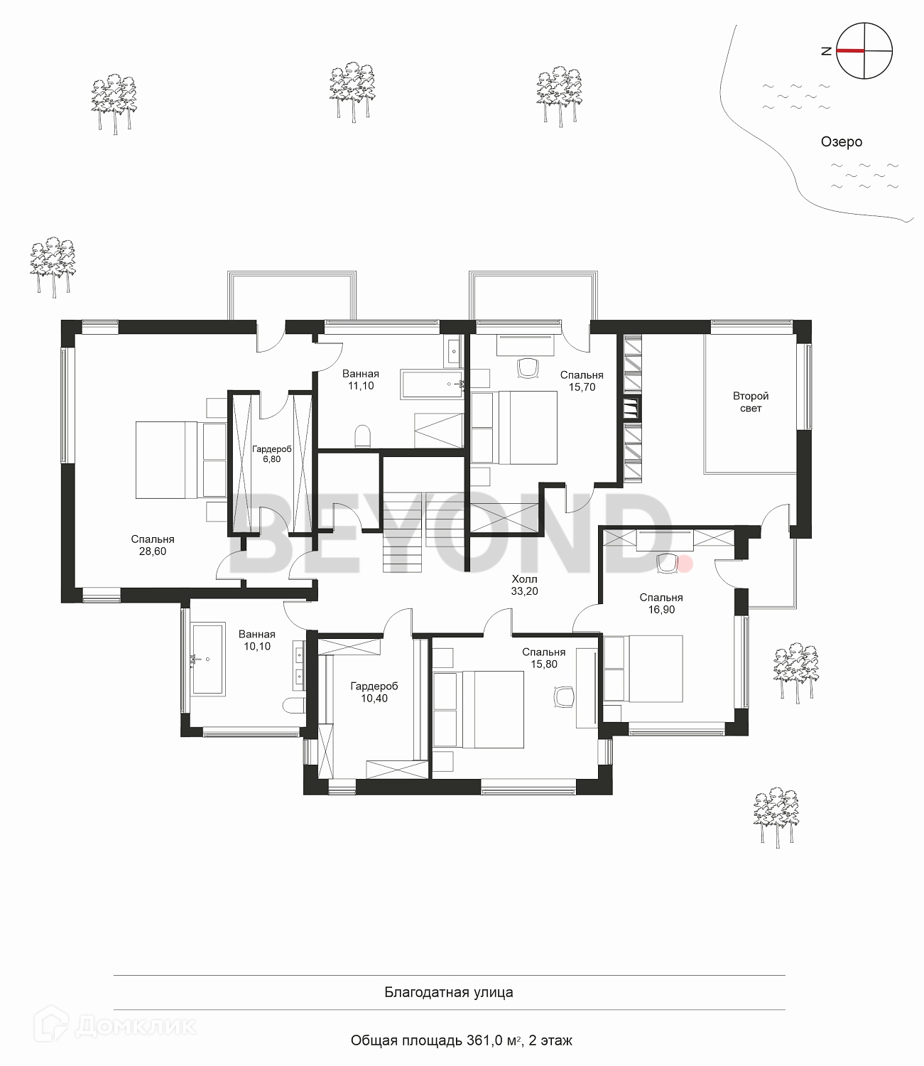 На втором этаже: мастер-спальня с гардеробной и ванной комнатой, две детские комнаты и гостевая.