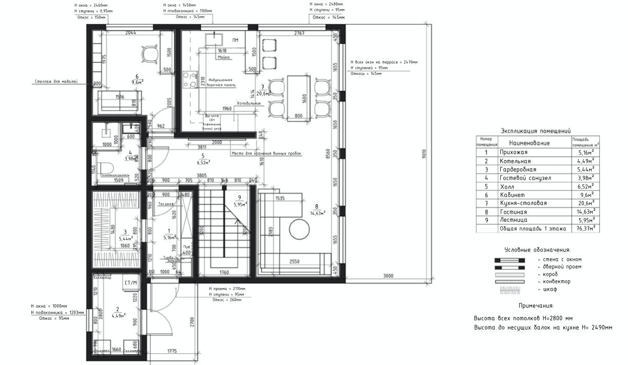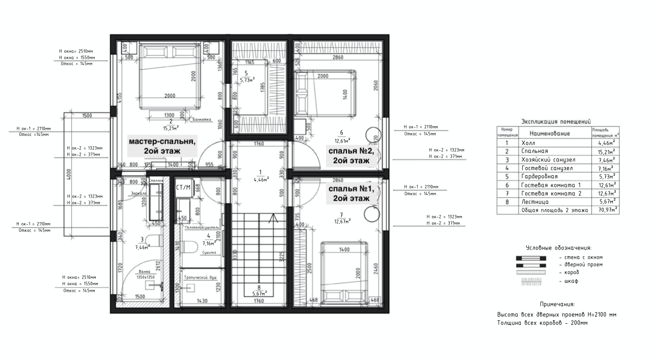 Вся внутренняя отделка и наполнение будет предметом для творчества его будущего владельца. Планировкой дома на первом этаже предусмотрена просторная кухня столовая 20,6 кв.м., совмещенная с гостиной 14,6 кв.м., таким образом имеем общее светлое пространство, площадью 35 кв.м., кабинет или гостевая спальня, 9,6 кв.м., С/У 4 кв.м. и гардеробная 5,5 кв.м., на втором этаже мастер- спальня, общей площадью 28,5 кв.м. со своим С/У, с выходом на террасу и гардеробной, а так же две детских спальни по 12,5 кв.м. и С/У 7 кв.м.