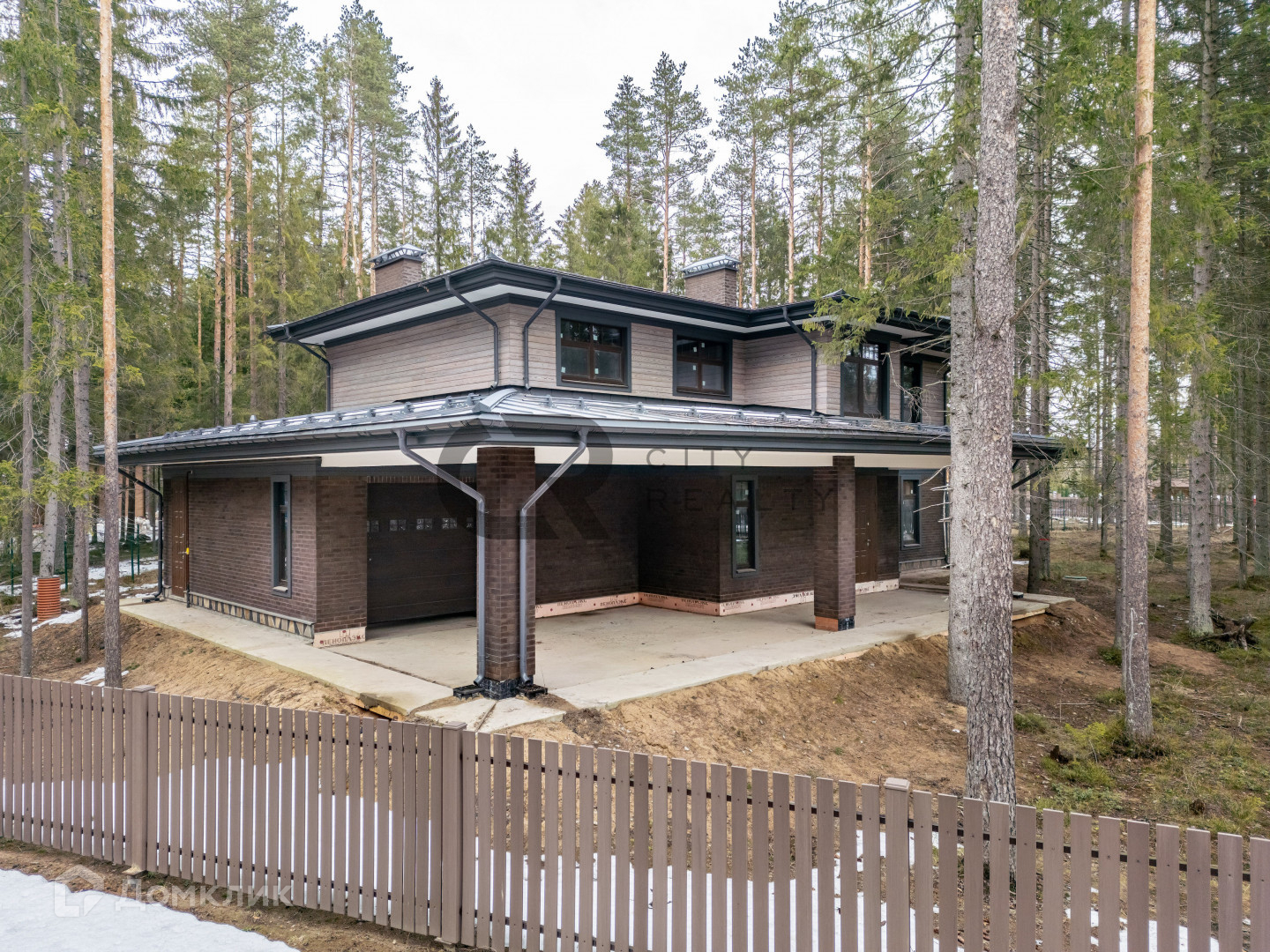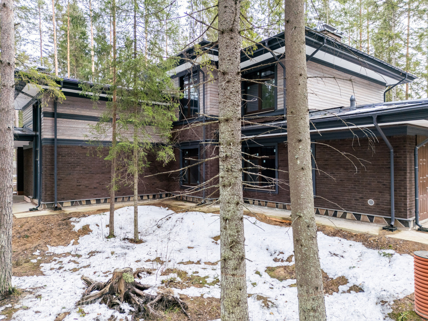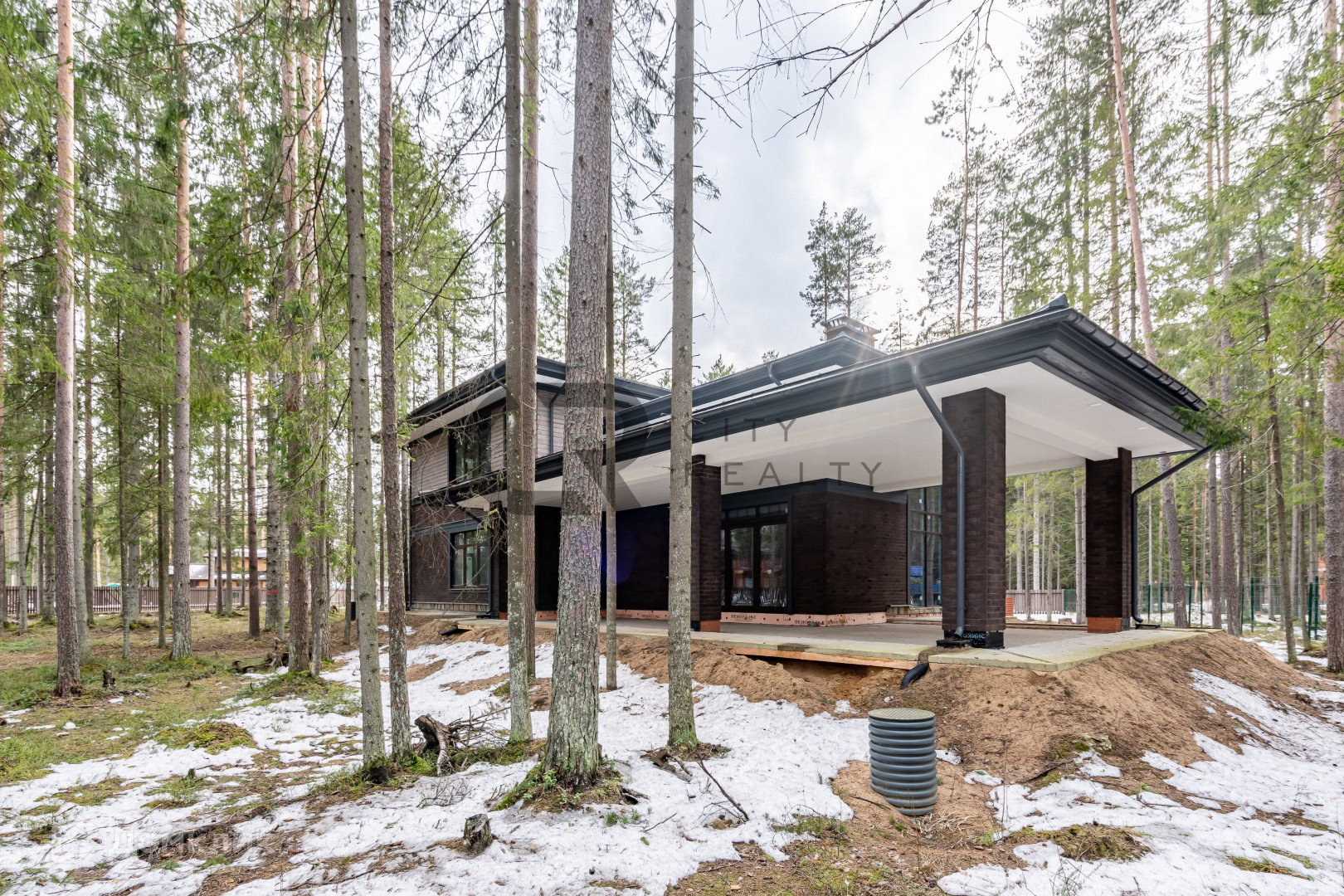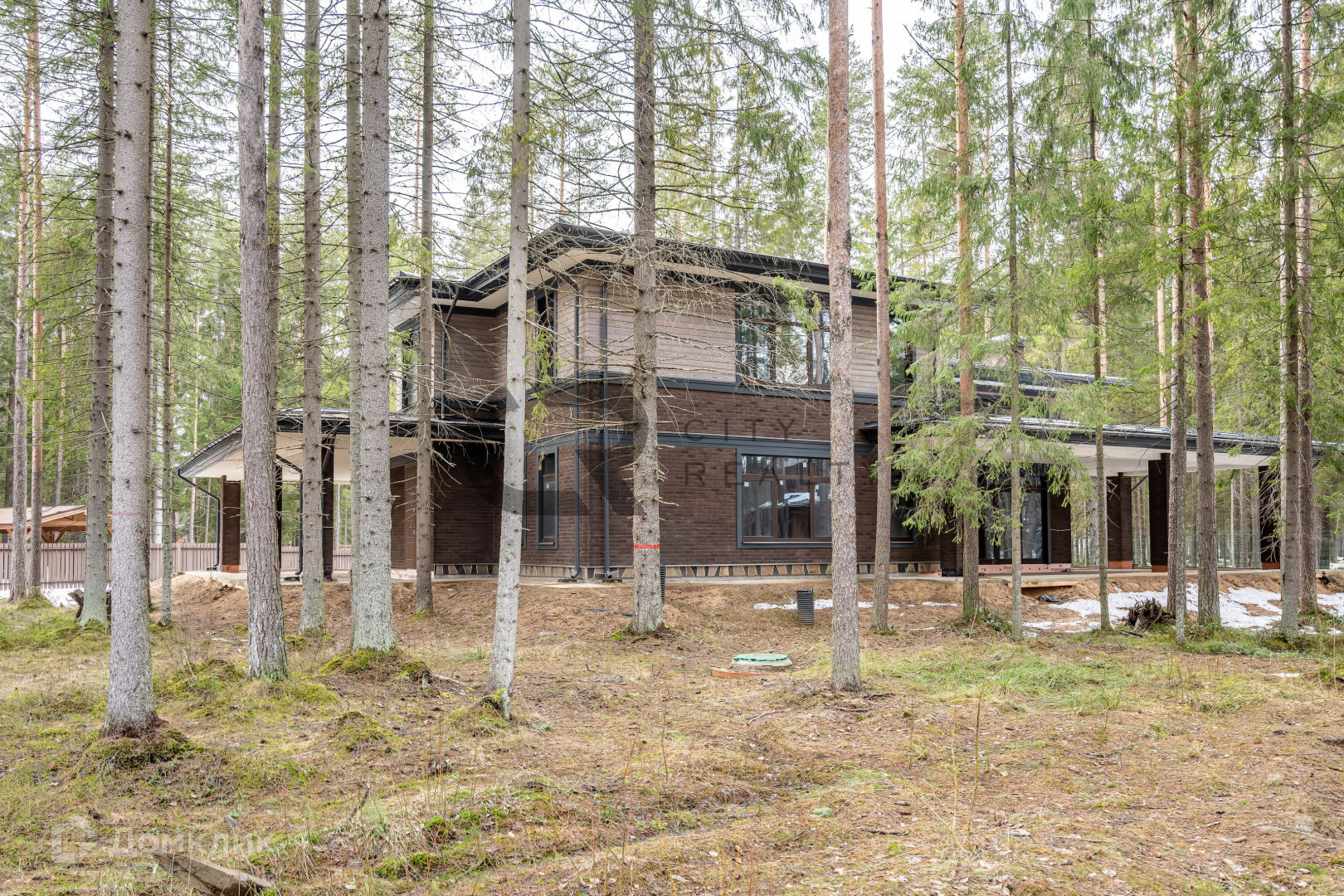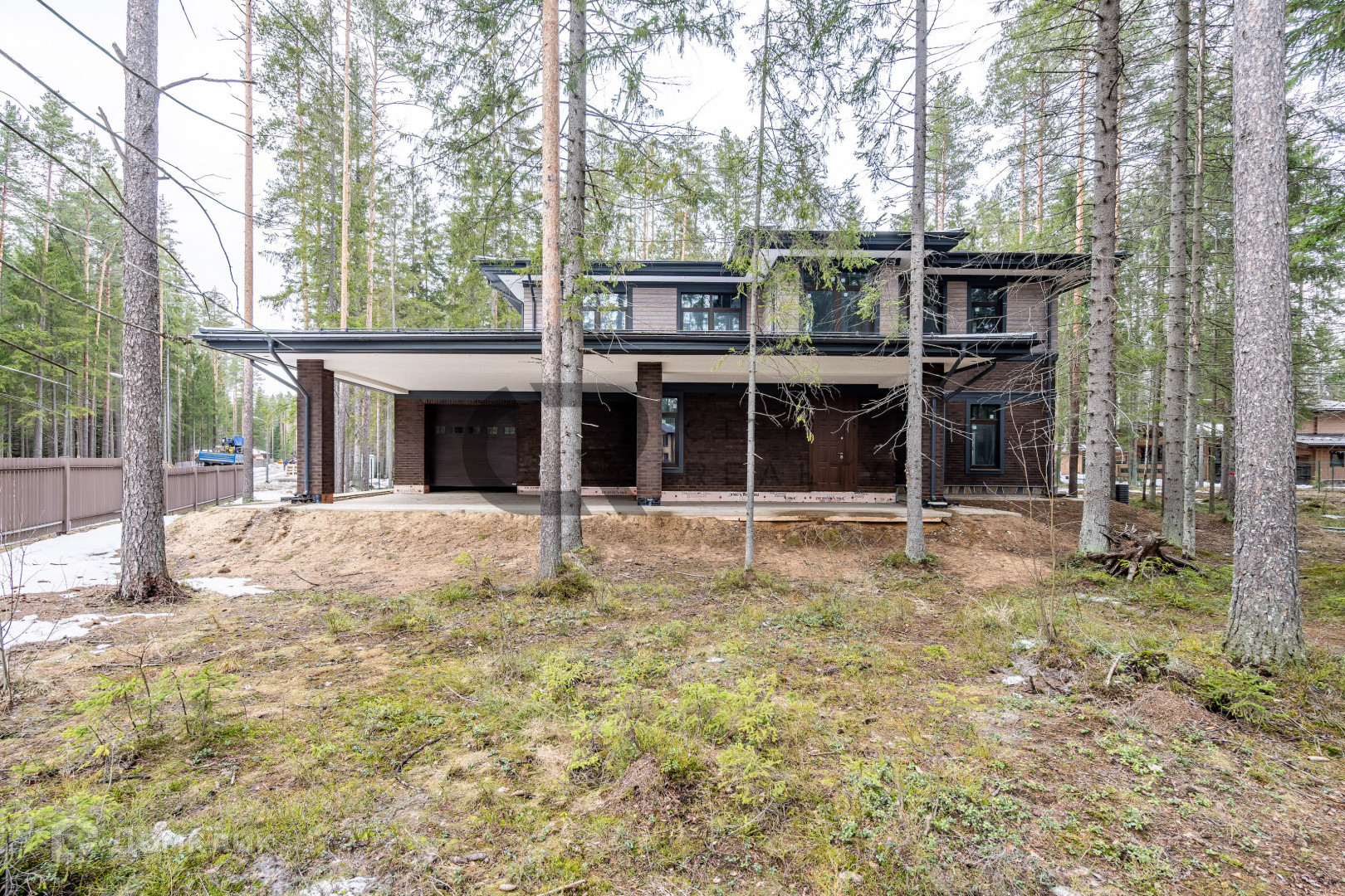 На участке бережно сохранен густой хвойный лес, а по периметру обустроен кольцевой дренаж.
