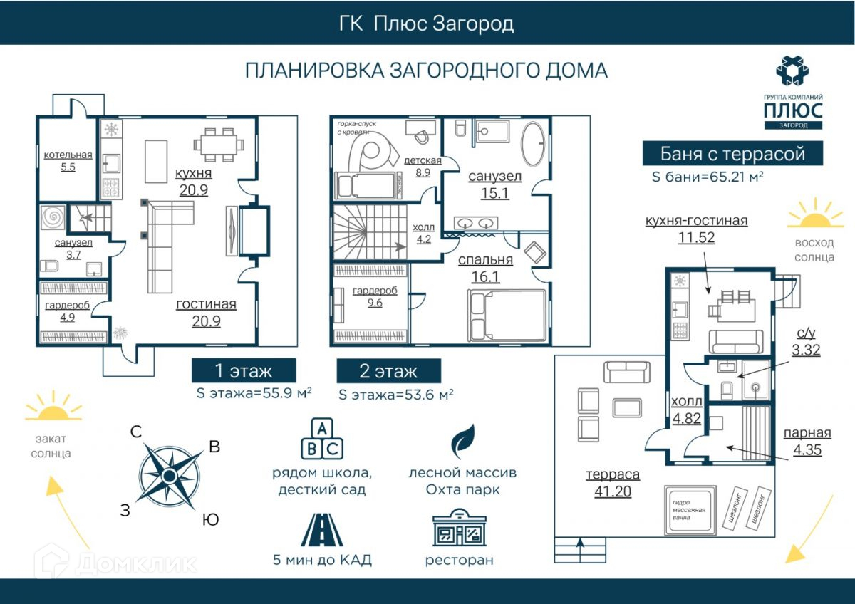 Домовладение состоит из основного дома общей площадью 150 кв.м, гостевого дома/банного комплекса с предчистовой отделкой площадью 65 кв.м включая террасу и навеса на 2 а/м с просторным помещением для хранения, площадью 10 кв.м.