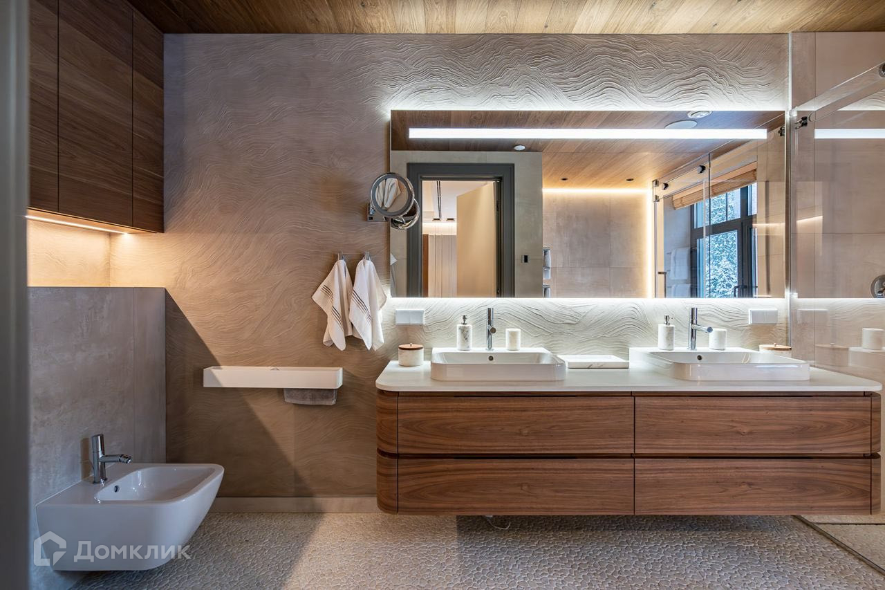 В отделке: Мрамор. Крупноформатный керамогранит. Плитка- Испания,Италия. Шпон. Мозаика из натуральной гальки на полу в основной ванной.