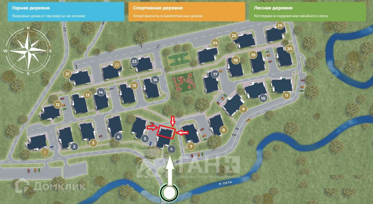 Проект состоит из трех деревень: "Горной" (индивидуальные дома и таунхаусы), "Спортивной" (апартаменты в малоэтажных домах и нежилые помещения для сферы услуг и магазинов) и "Лесной" (элитные коттеджи в окружении хвойного леса).