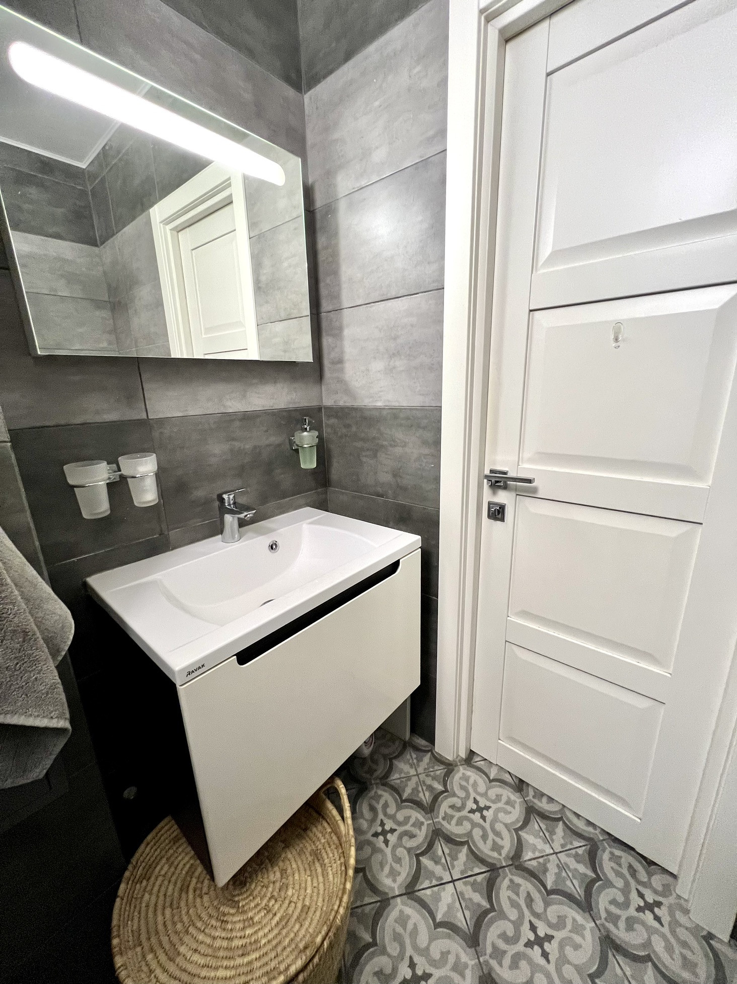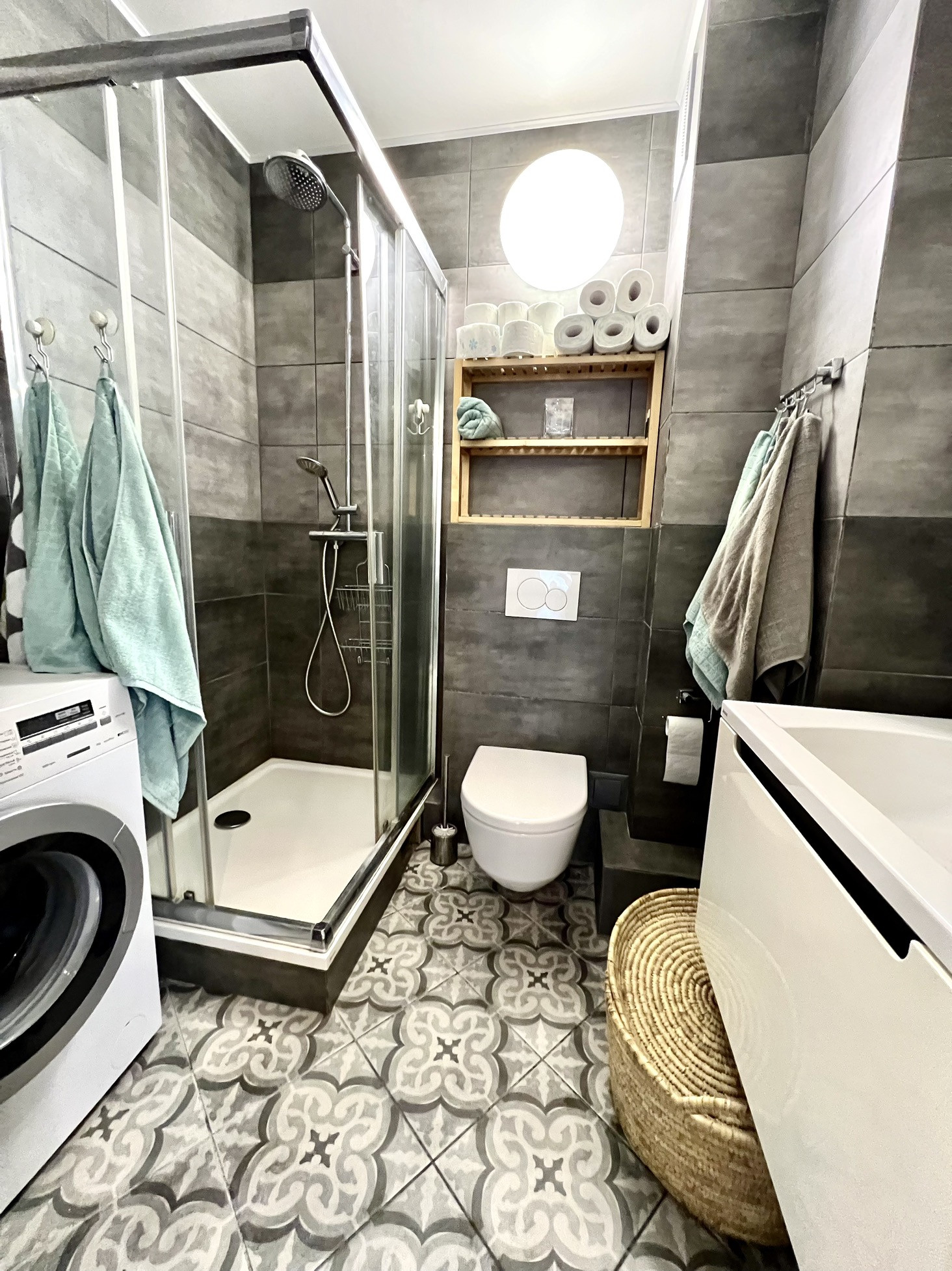 При входе обустроен совмещенный санузел с большой душевой кабиной сантехника Grohe, инсталляцией и стиральной машиной Siemens.