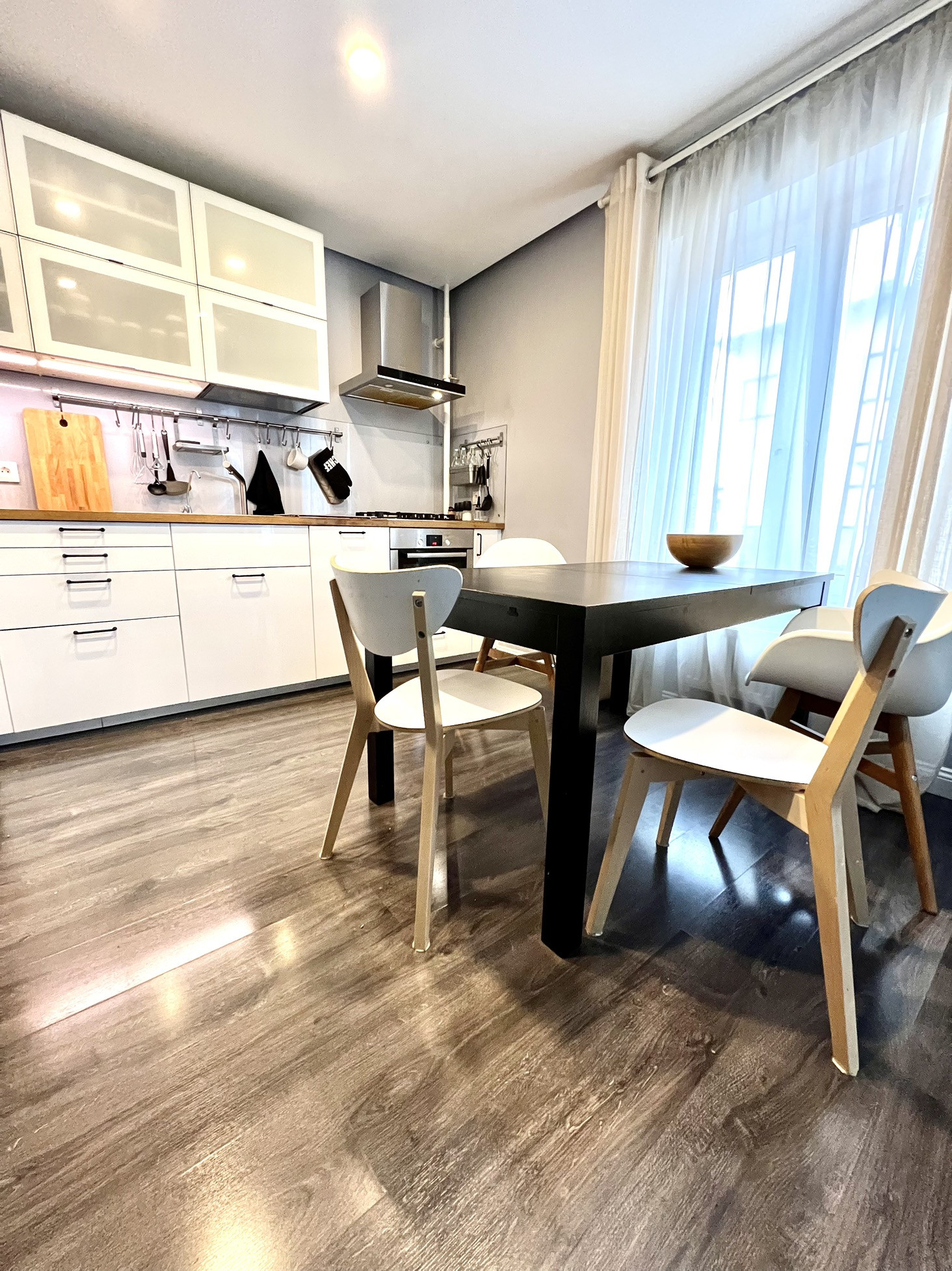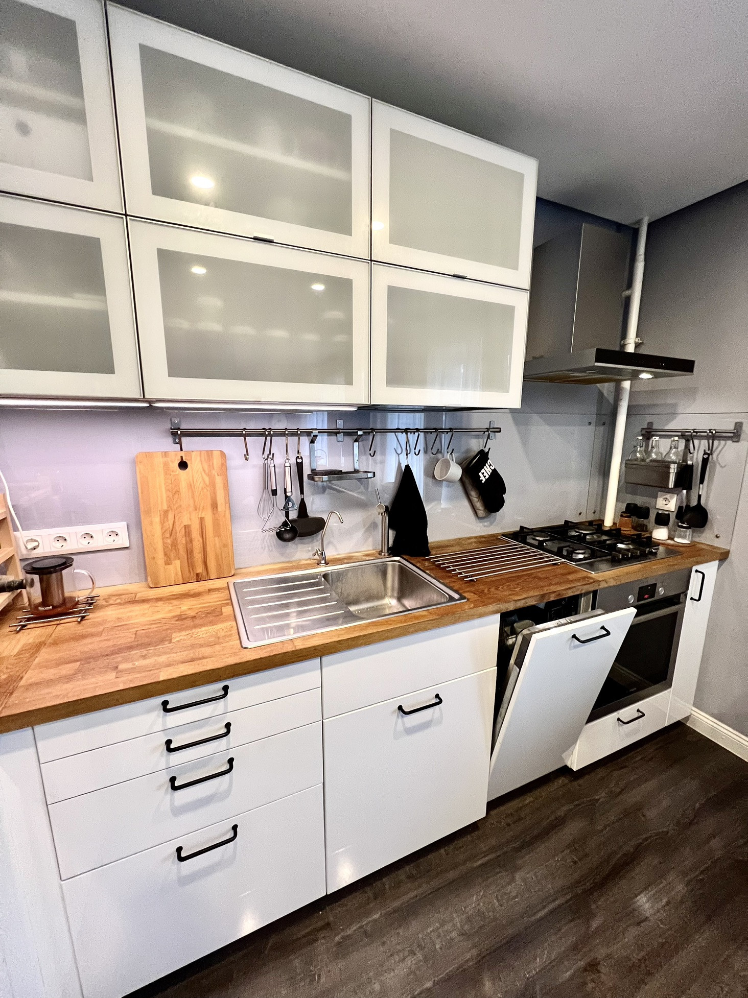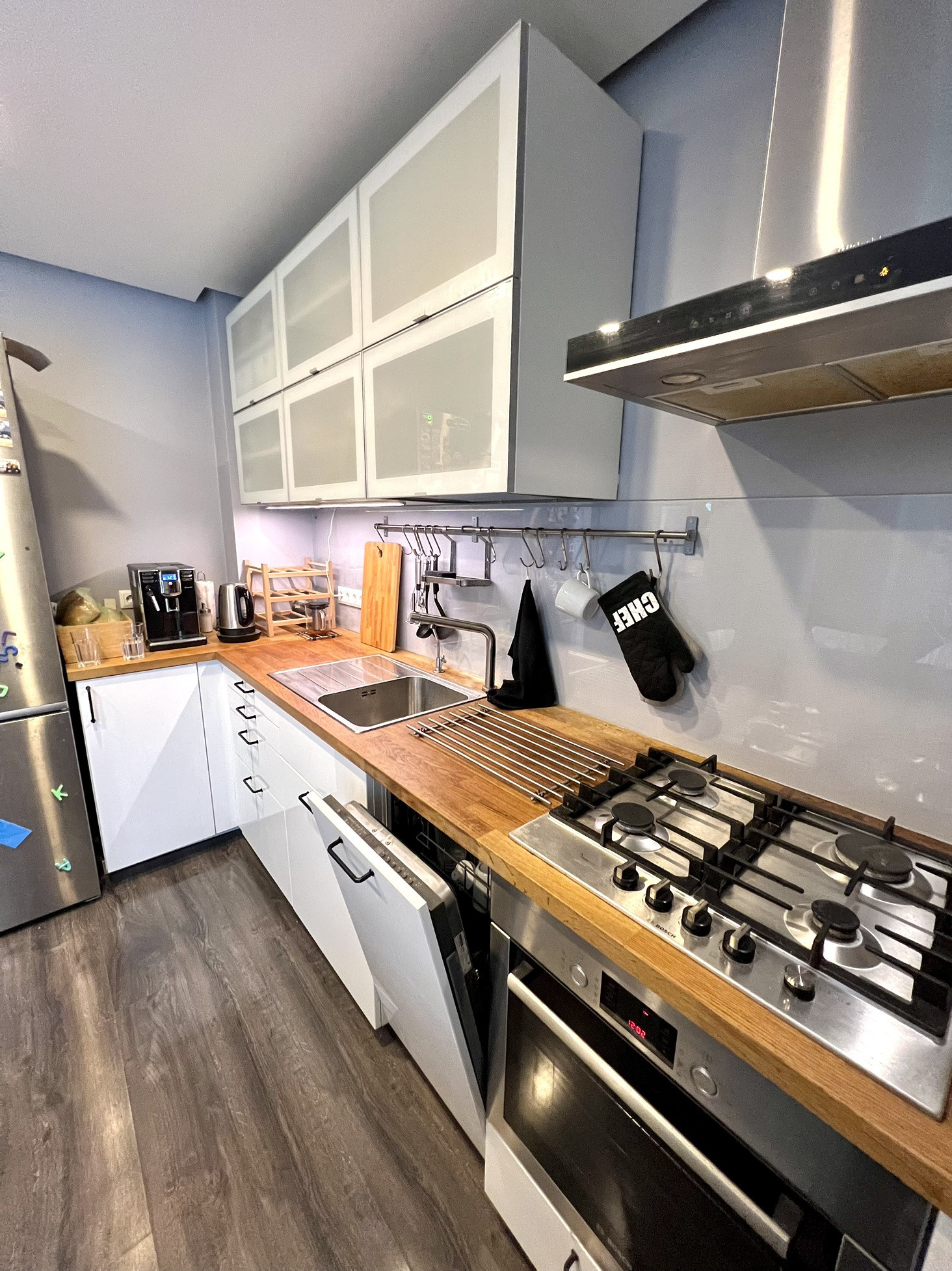 Стильная кухня Ikea со встроенной техникой Bosch.  Есть посудомоечная машина.