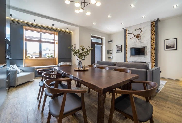 - Большая кухня гостиная с камином и встроенной техникой (посудомоечная машина, варочная панель, духовой шкаф, холодильник)