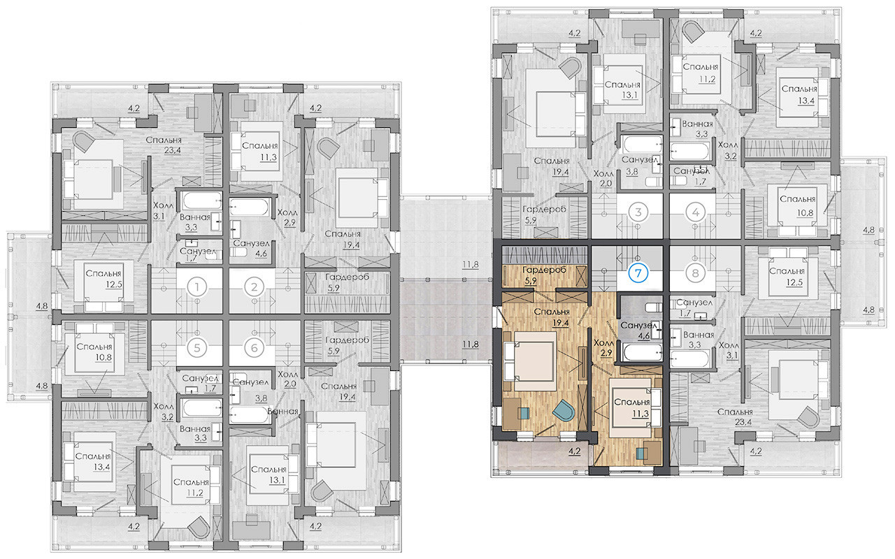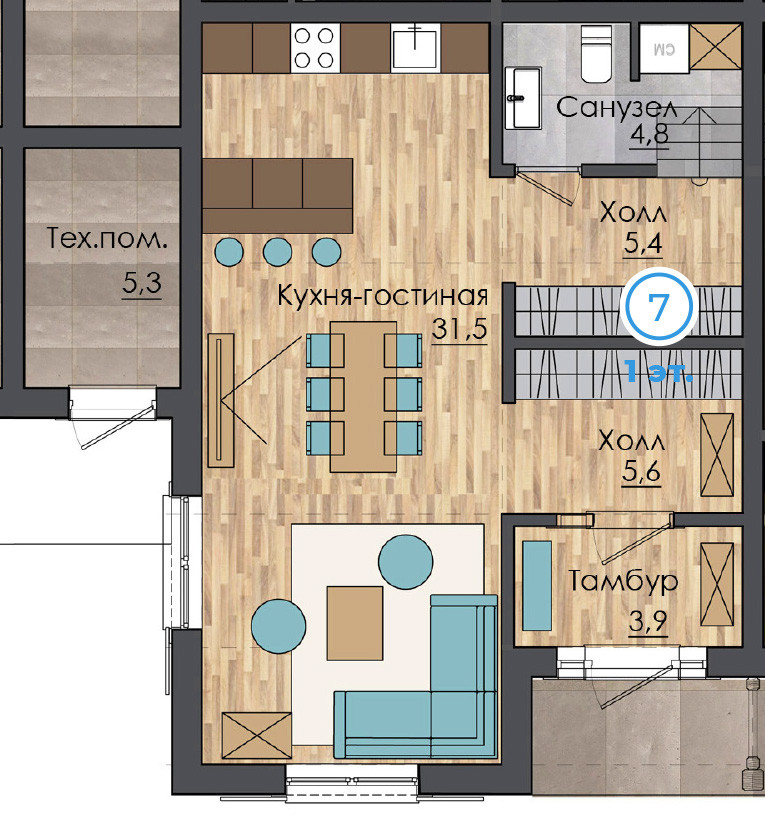 В доме свободная планировка: на первом этаже предусмотрена прихожая, просторная кухня-гостиная, санузел и кладовая. На втором этаже можно разместить 2 спальни с выходами на балконы, а также раздельный санузел.