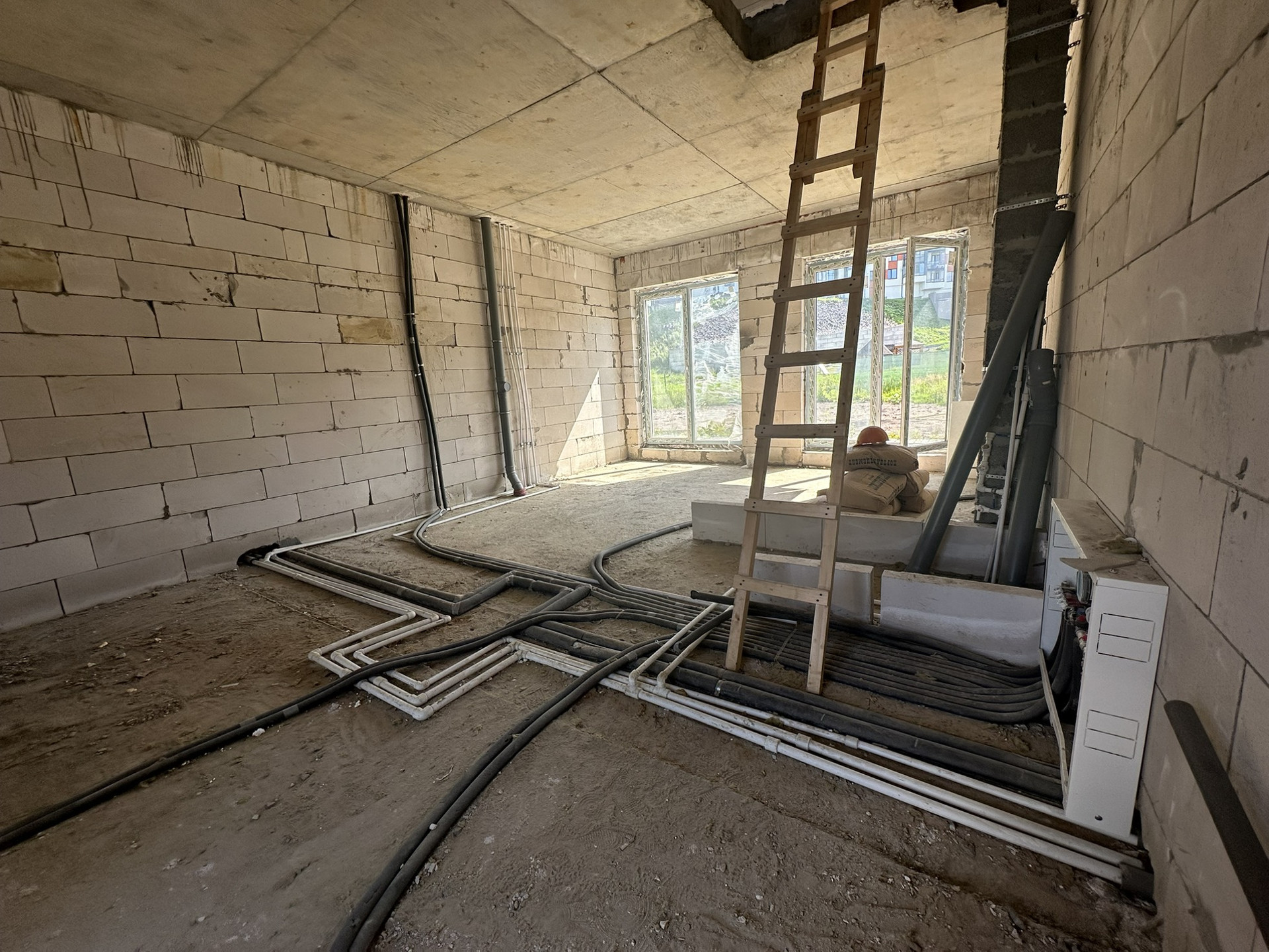 Несущие стены из газобетона. Перекрытия монолитные железобетонные. Кровля - листовая металлическая, стропильная система деревянная. Окна и наружные