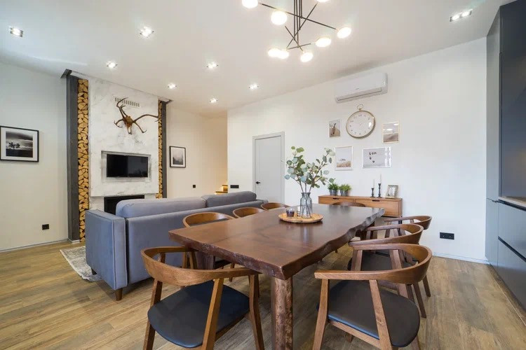- Большая кухня гостиная с камином и встроенной техникой (посудомоечная машина, варочная панель, духовой шкаф, холодильник)