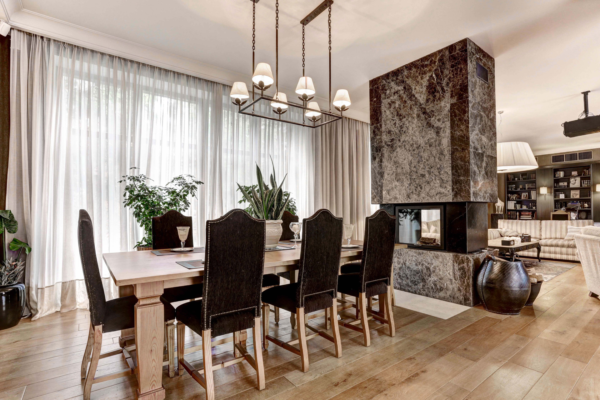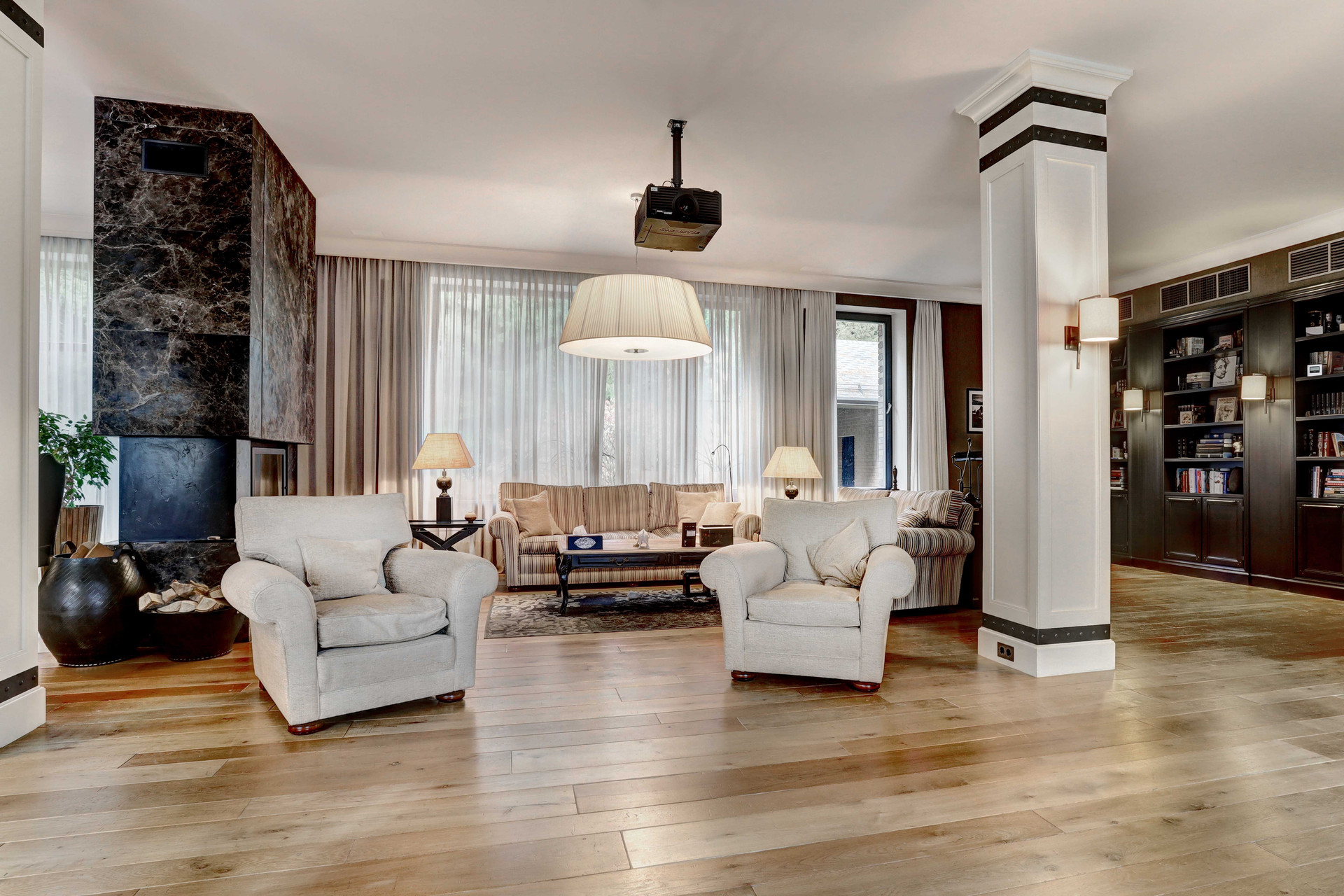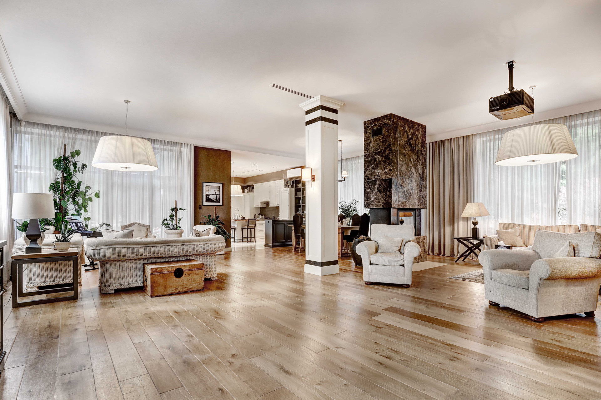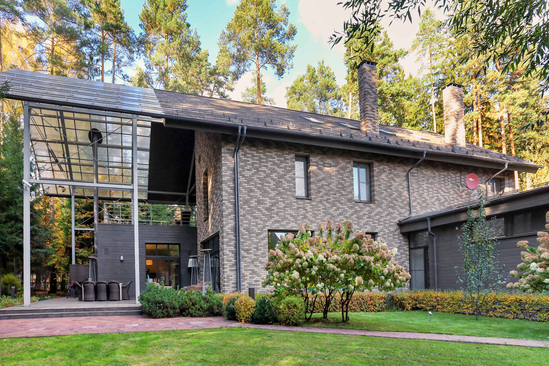 В доме имеется 4 спальни, кабинеты, гардеробные комнаты, 6 сан. узлов, камин, панорамное остекление первого этажа, кухня- гостиная 160 м2 с мраморным полом, выполненная в стиле Лофт.