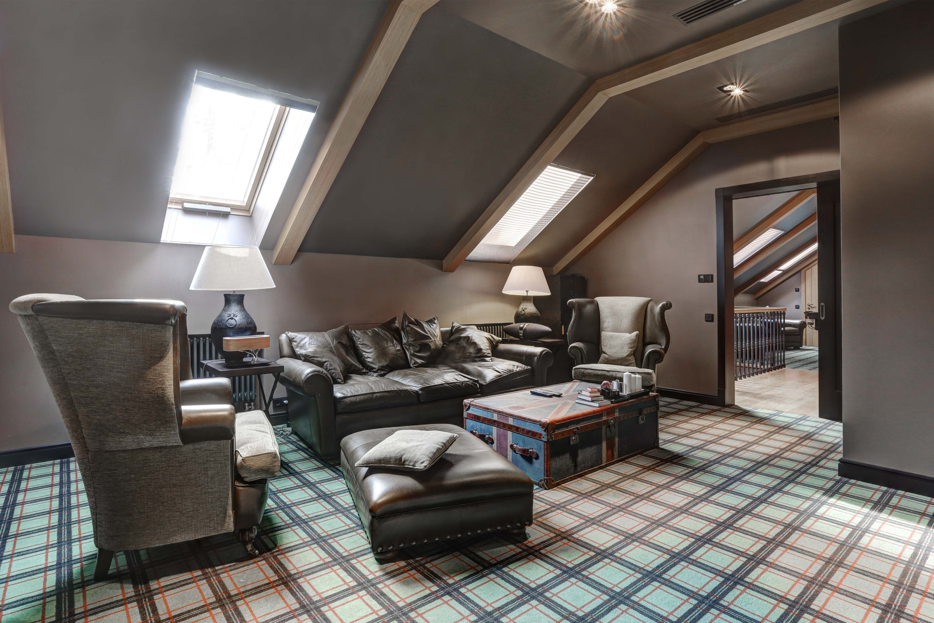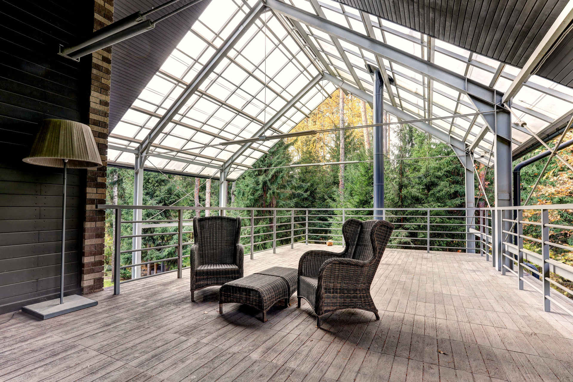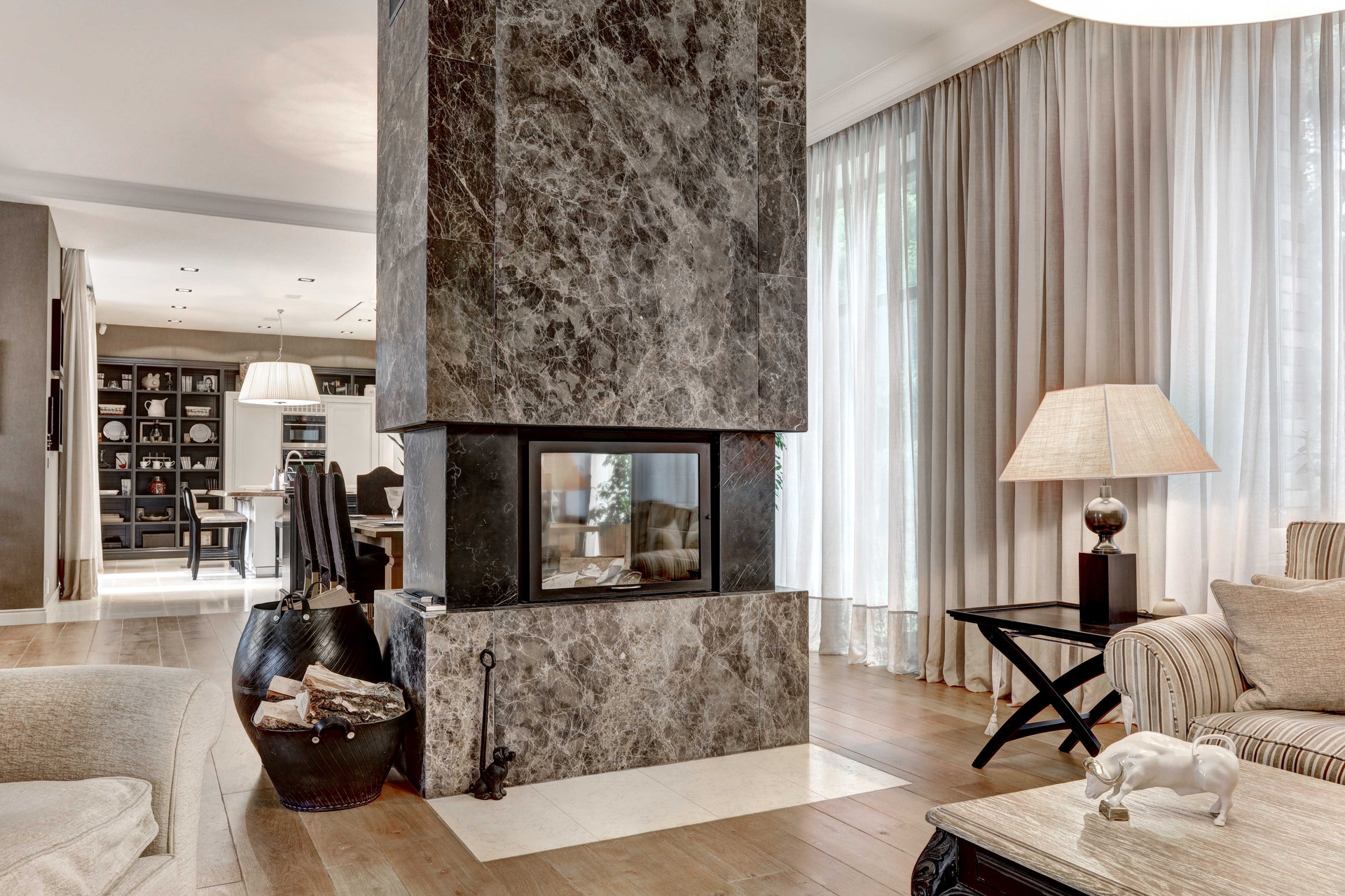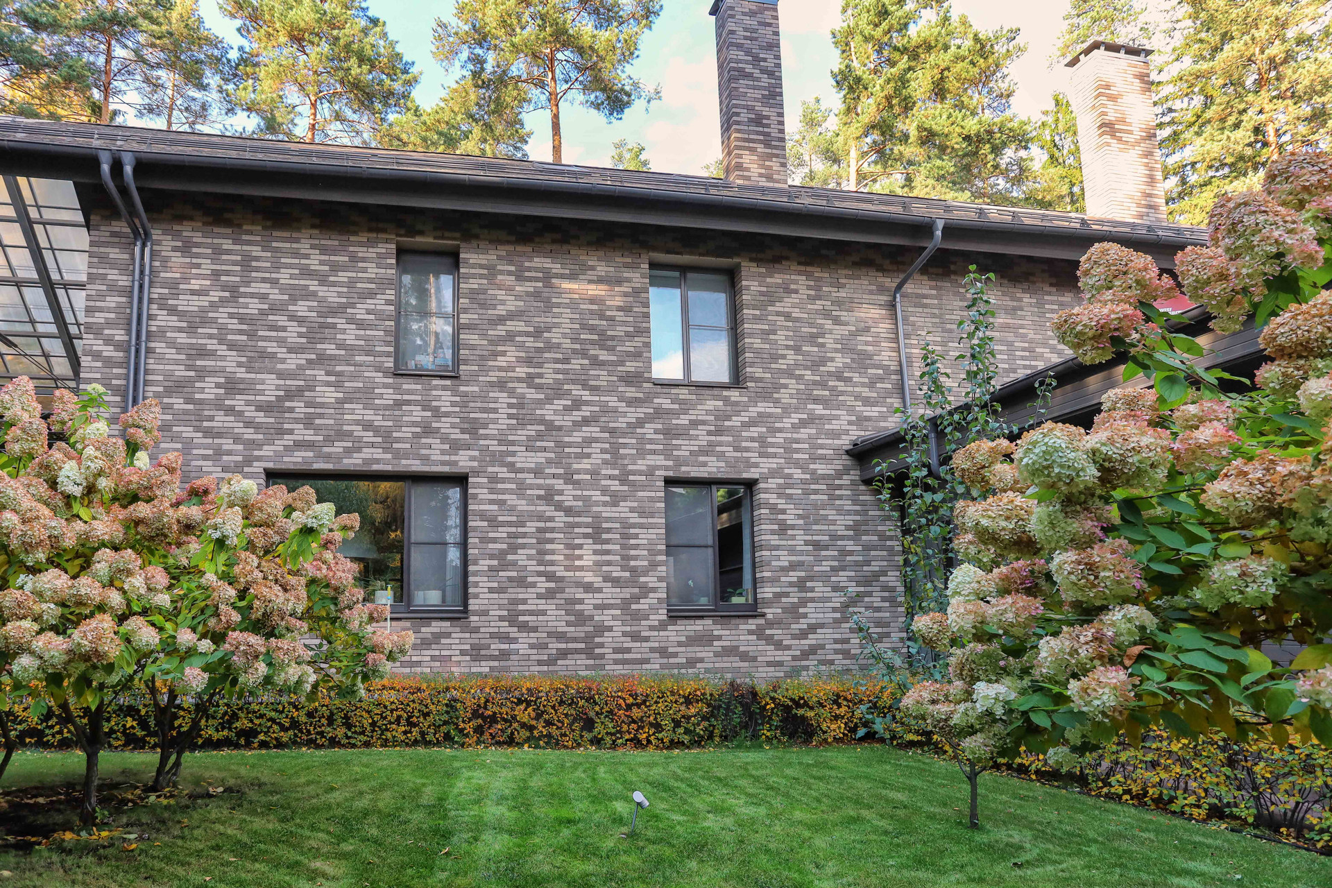 В доме имеется 4 спальни, кабинеты, гардеробные комнаты, 6 сан. узлов, камин, панорамное остекление первого этажа, кухня- гостиная 160 м2 с мраморным полом, выполненная в стиле Лофт.