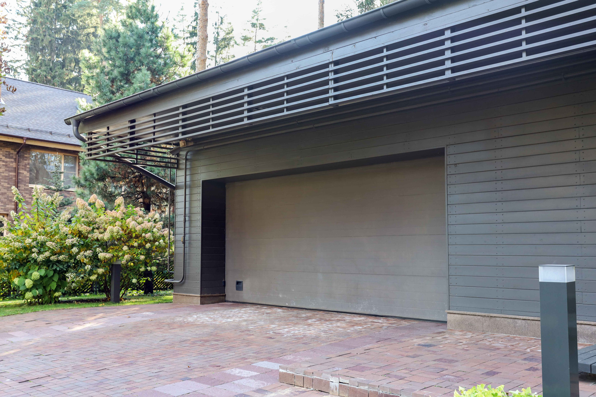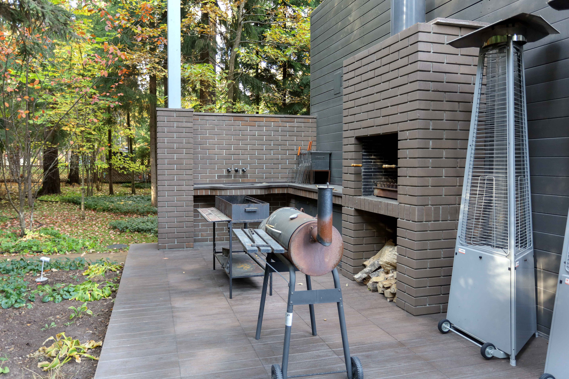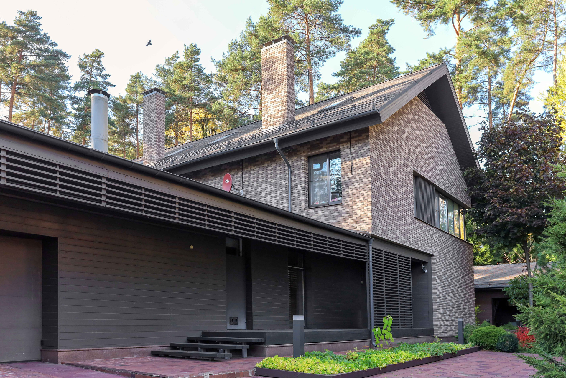 Теплый гараж на 2 авто с выходом в дом, на террасе оборудована зона барбекю с вытяжной трубой. На участке растут сосны, ели, декоративные кустарники, видеонаблюдение.
