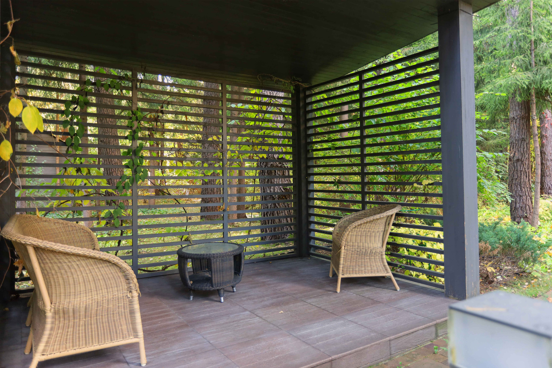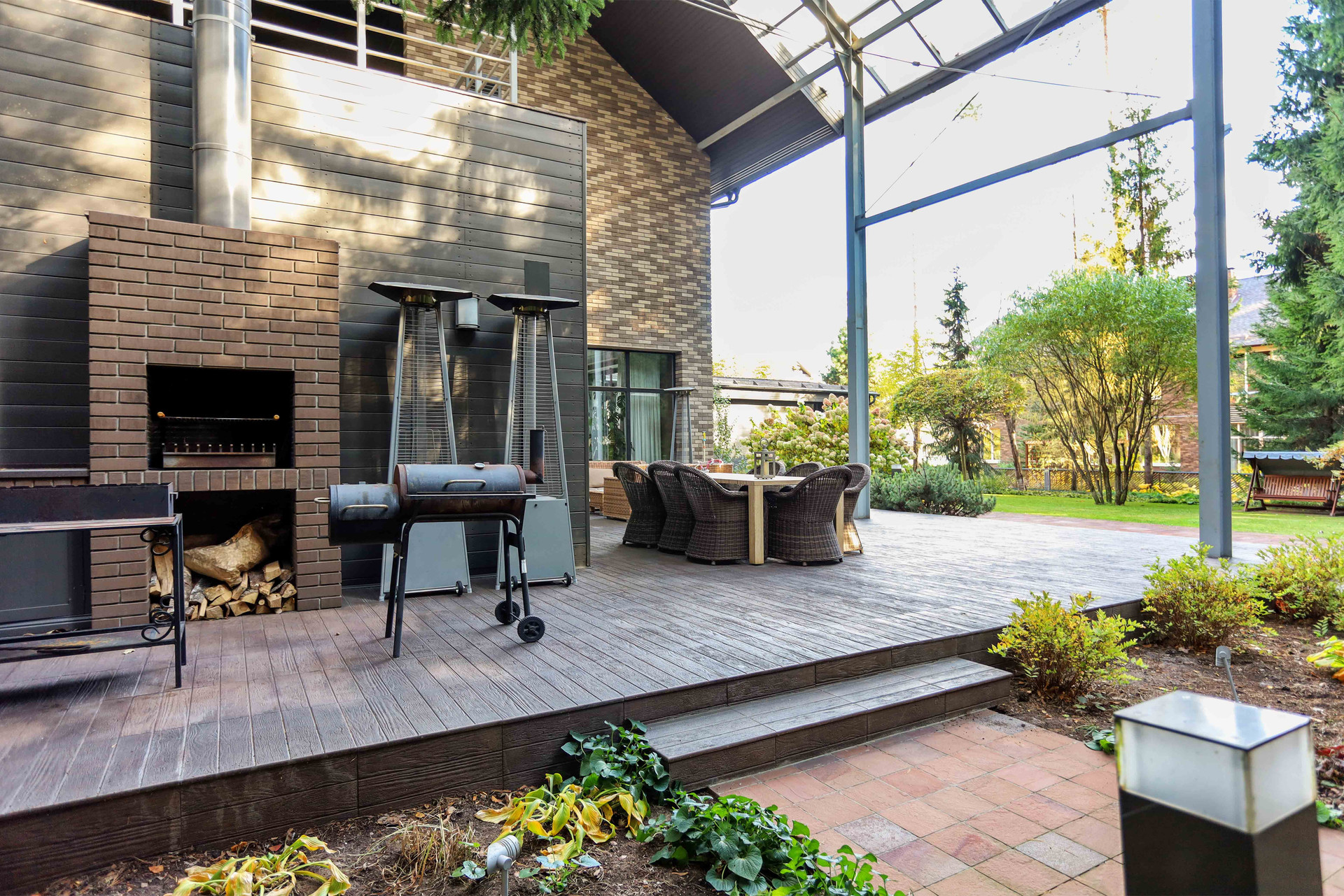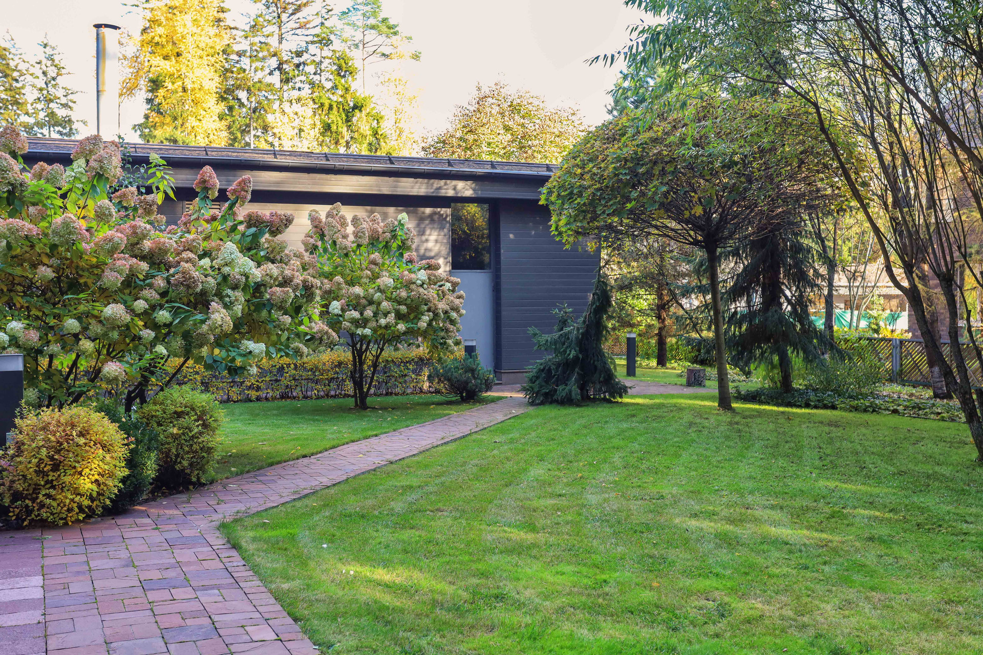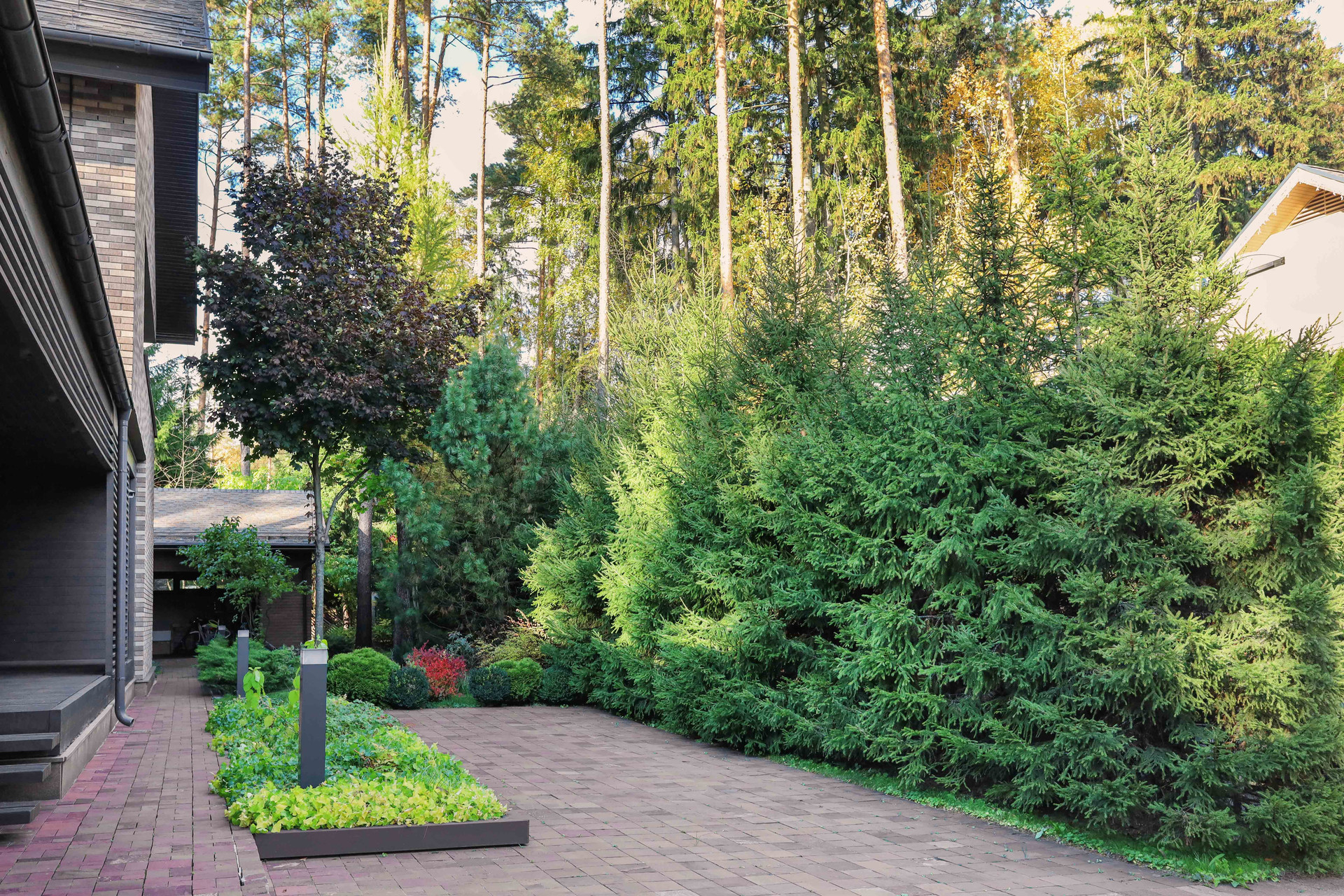 Теплый гараж на 2 авто с выходом в дом, на террасе оборудована зона барбекю с вытяжной трубой. На участке растут сосны, ели, декоративные кустарники, видеонаблюдение.