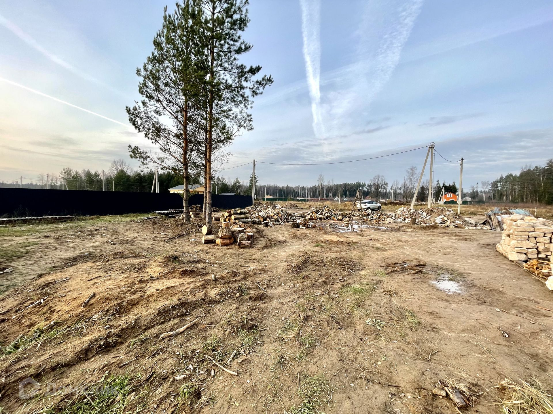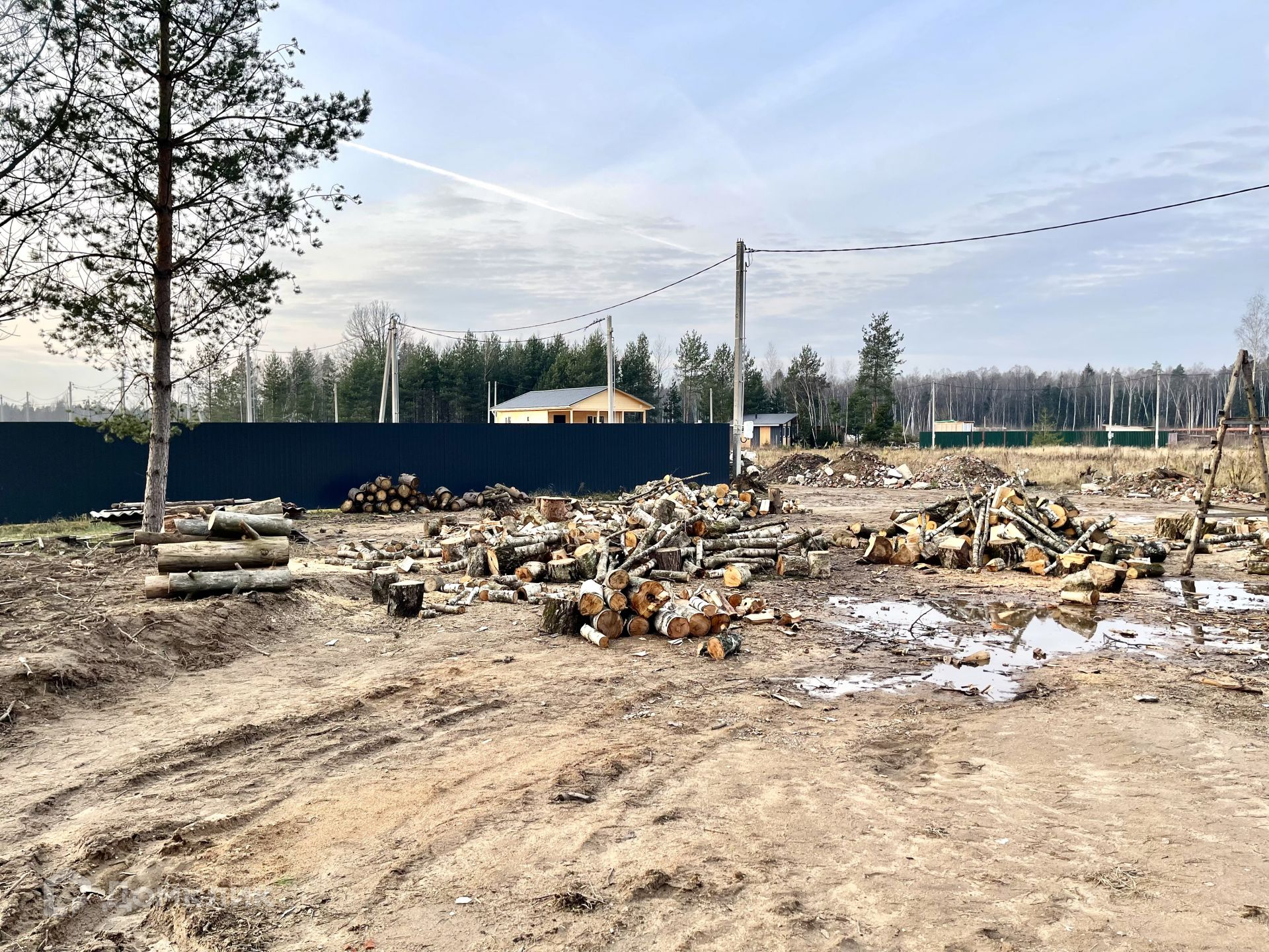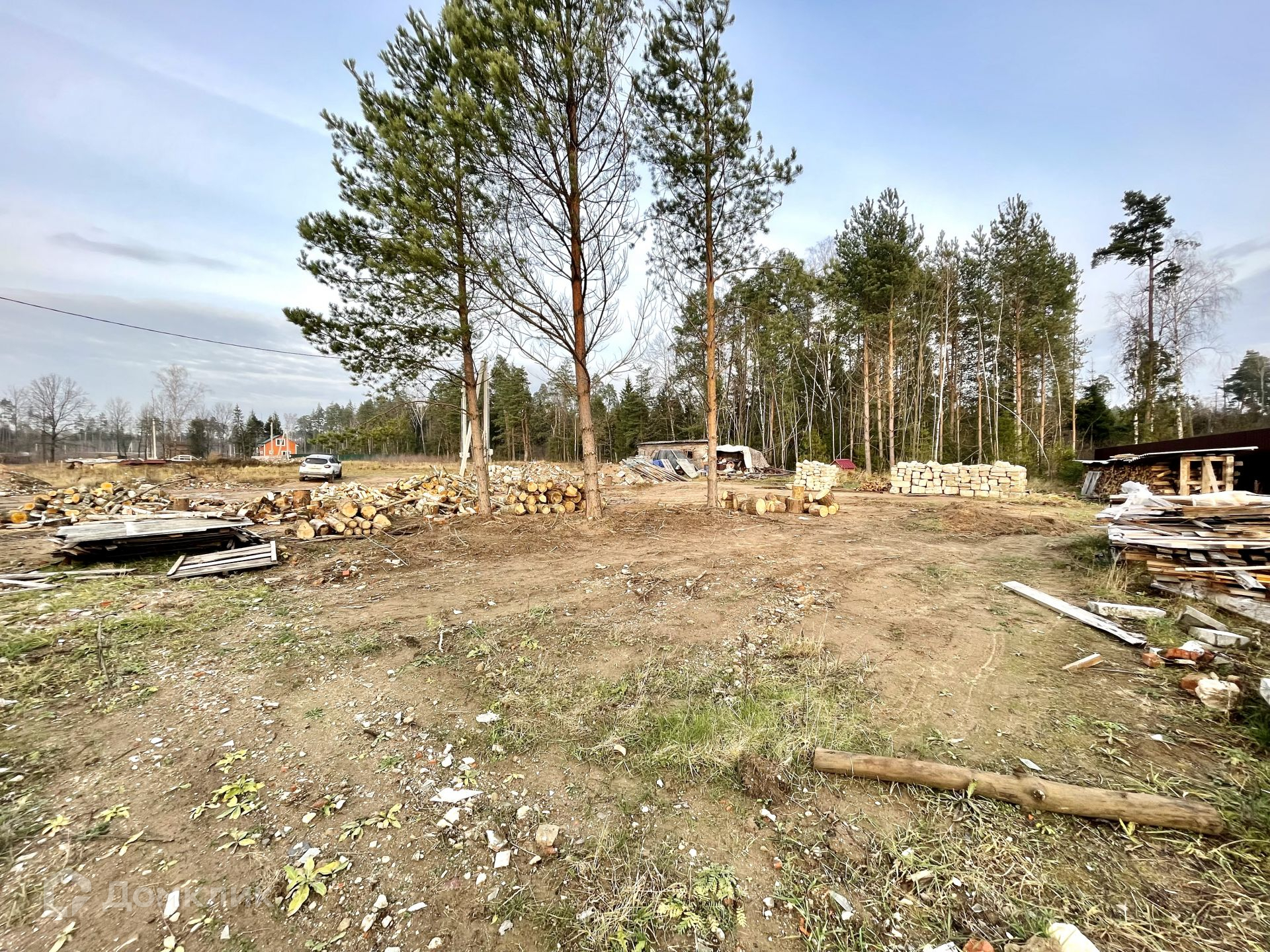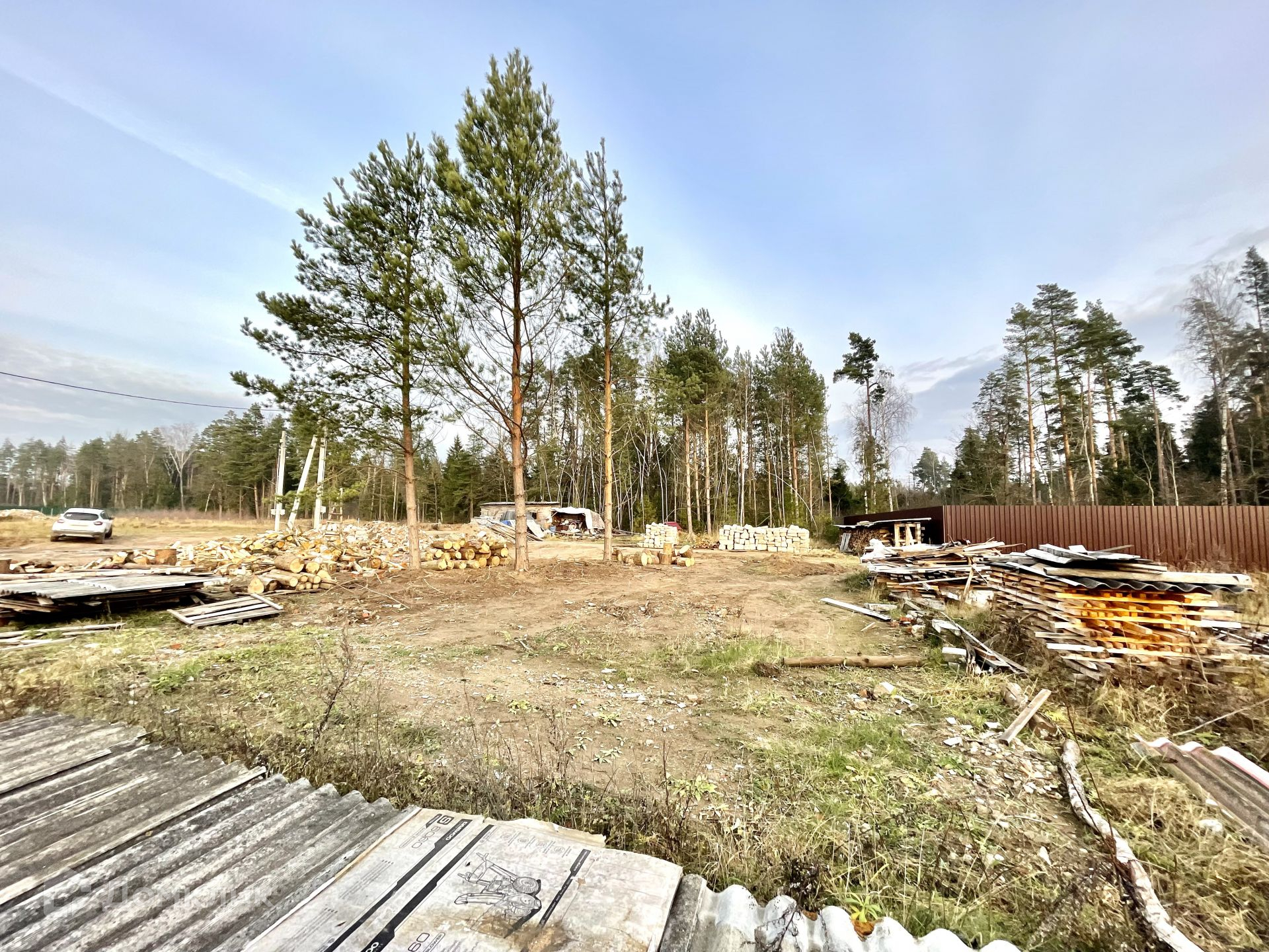 На участке растут сосны, которые отлично дополнят ландшафт вокруг дома. Остальные деревья вырублены, поленья остаются на участке.