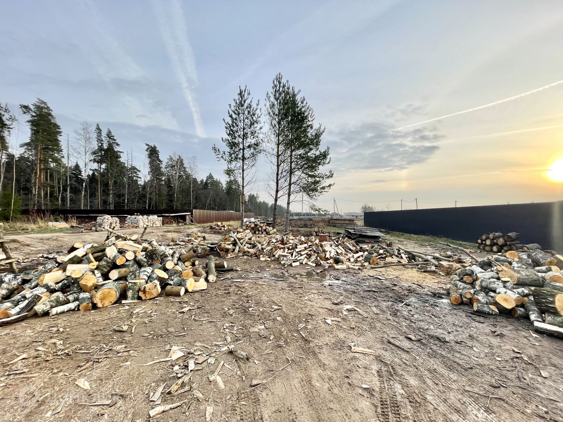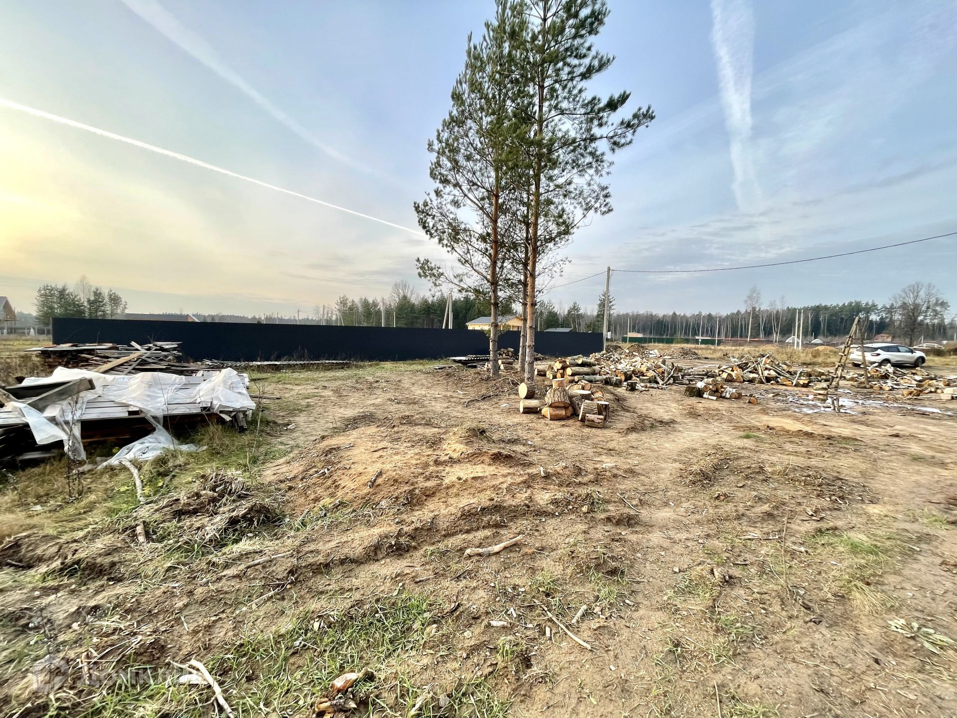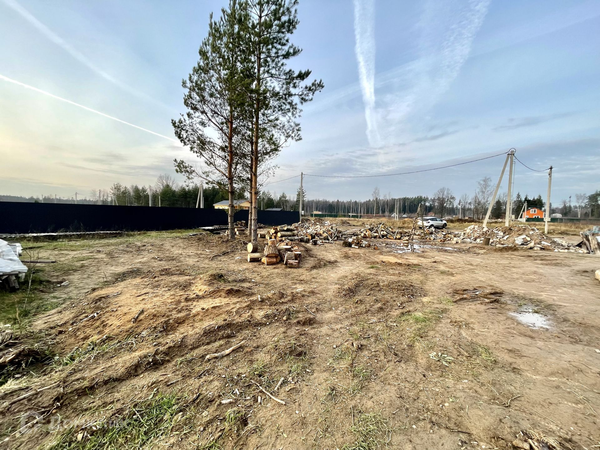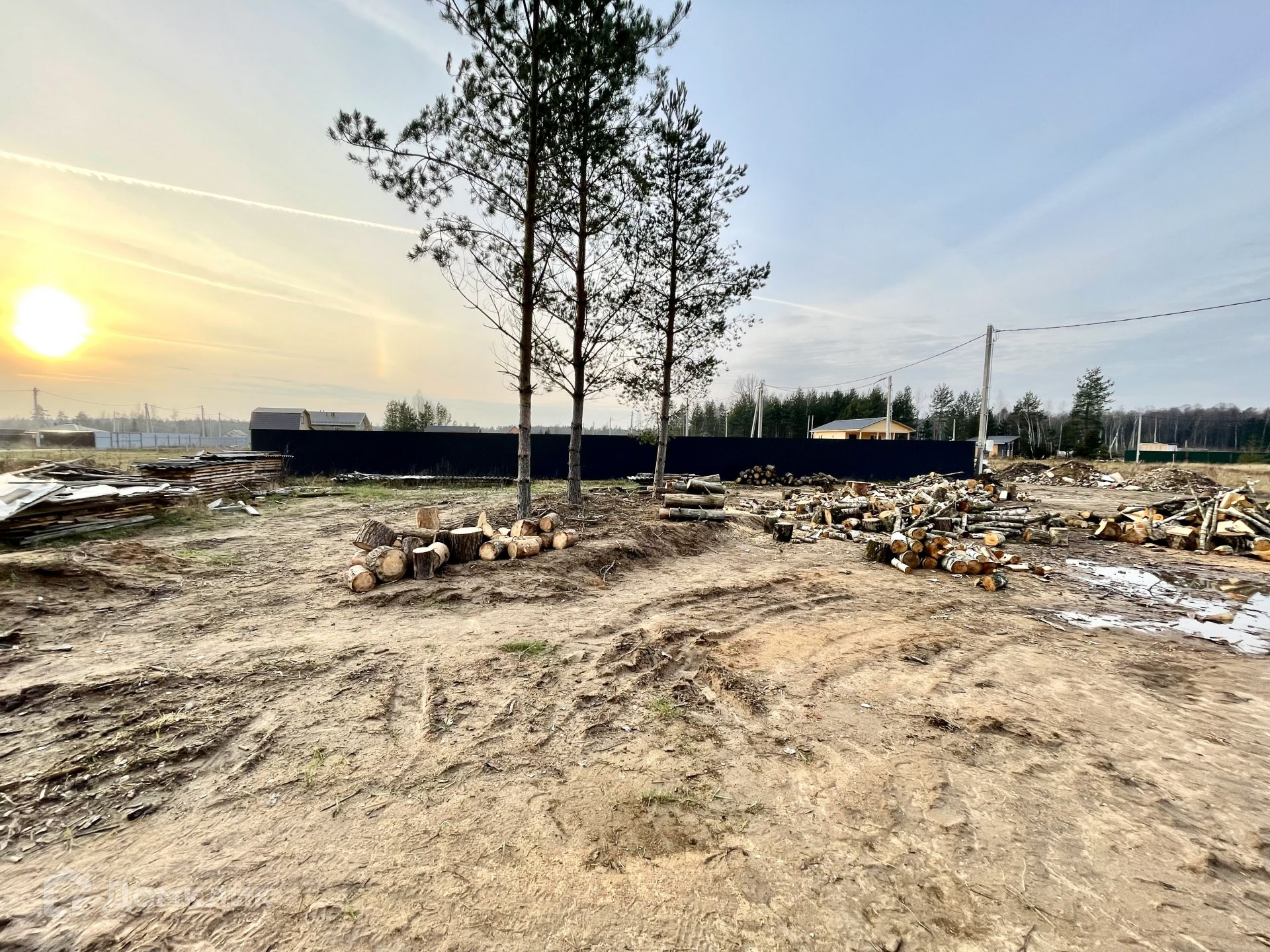 На участке растут сосны, которые отлично дополнят ландшафт вокруг дома. Остальные деревья вырублены, поленья остаются на участке.