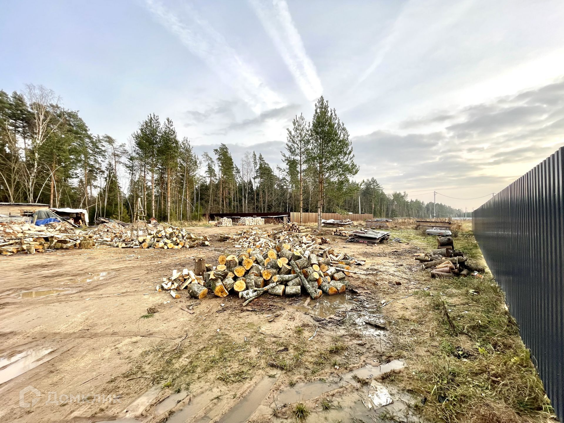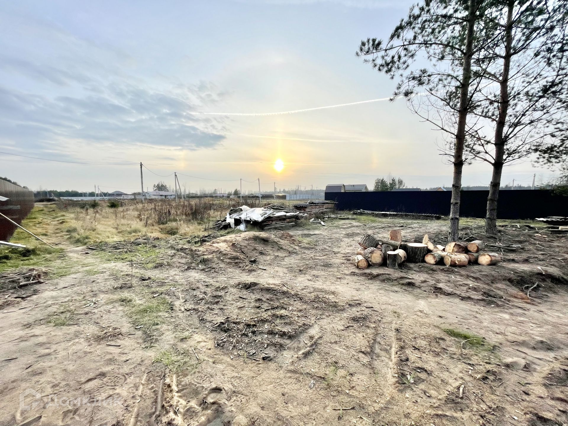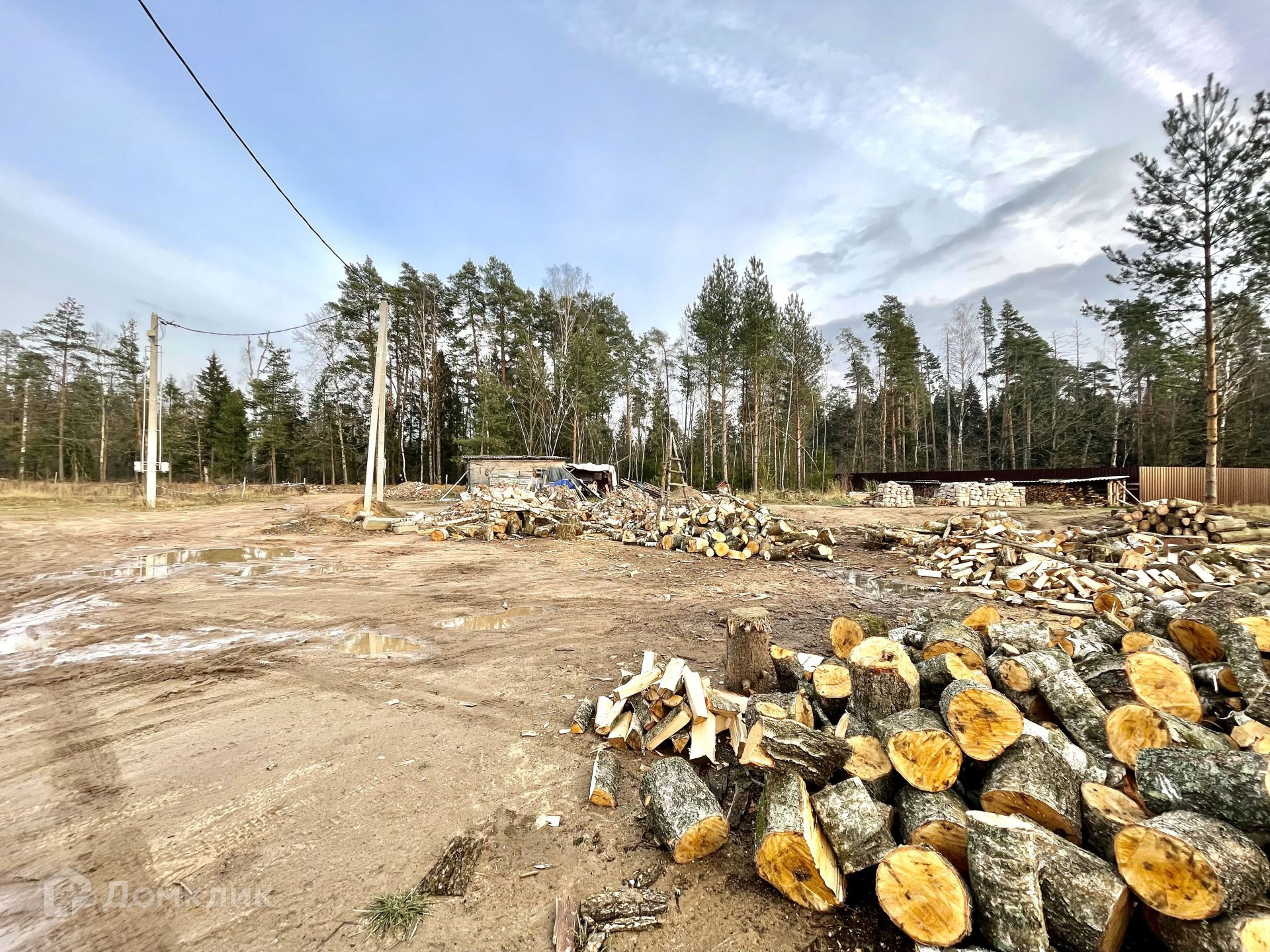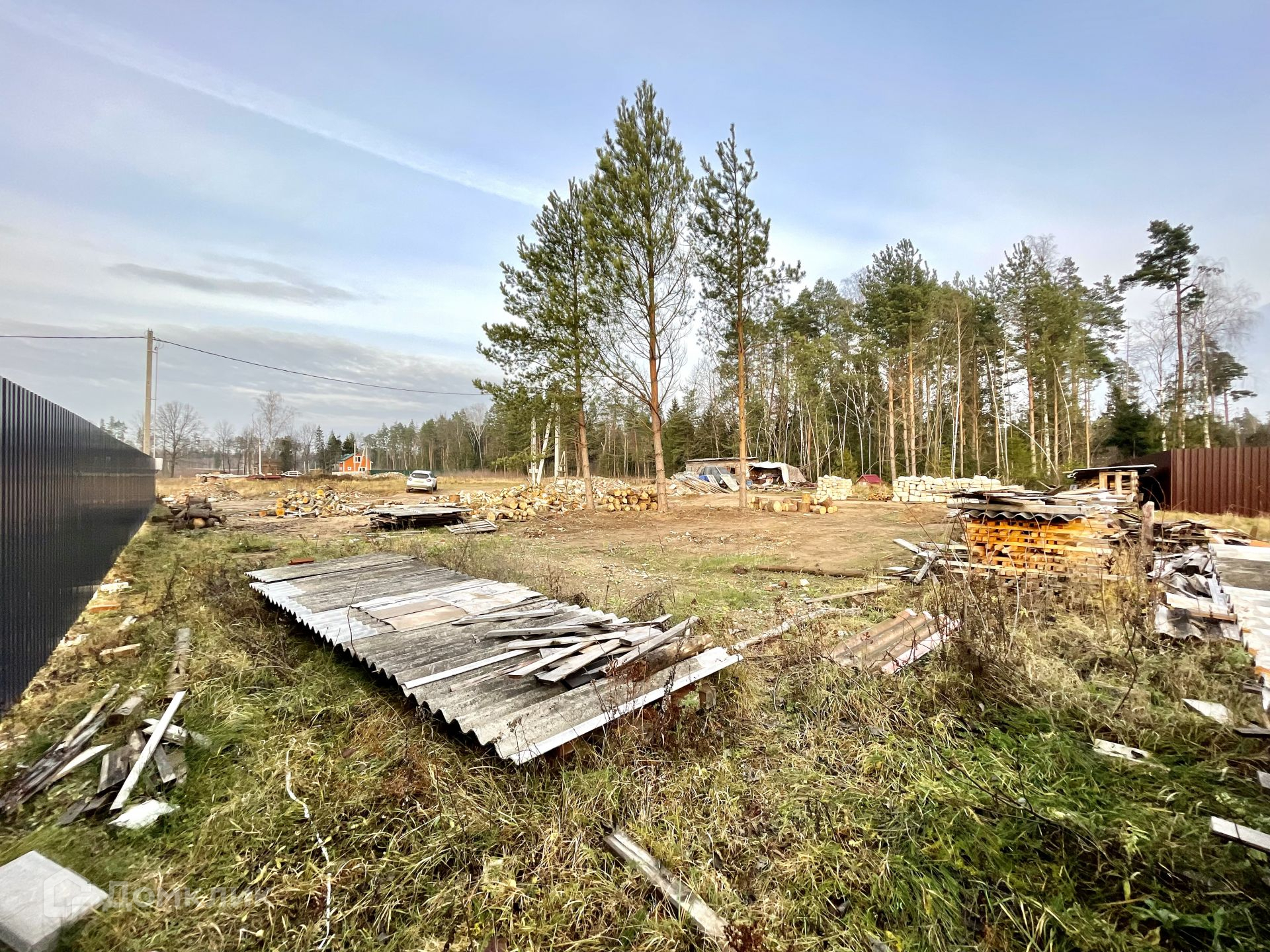 На участке растут сосны, которые отлично дополнят ландшафт вокруг дома. Остальные деревья вырублены, поленья остаются на участке.