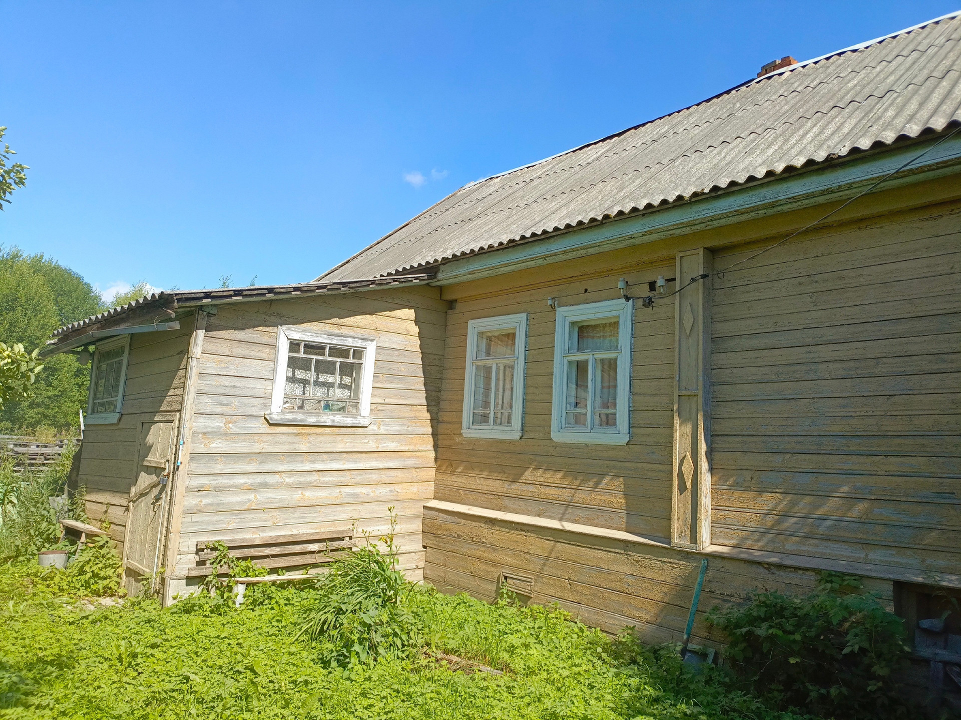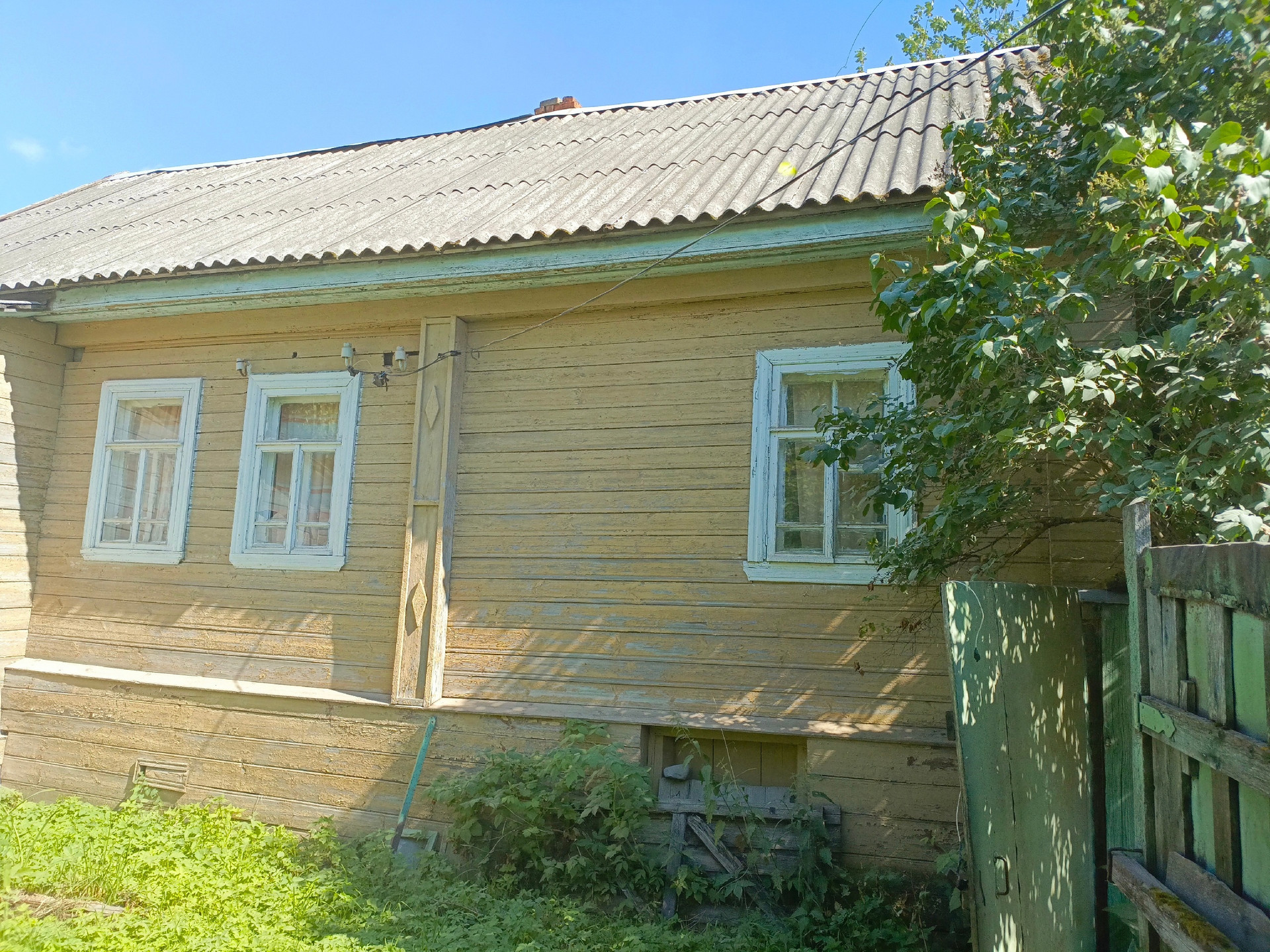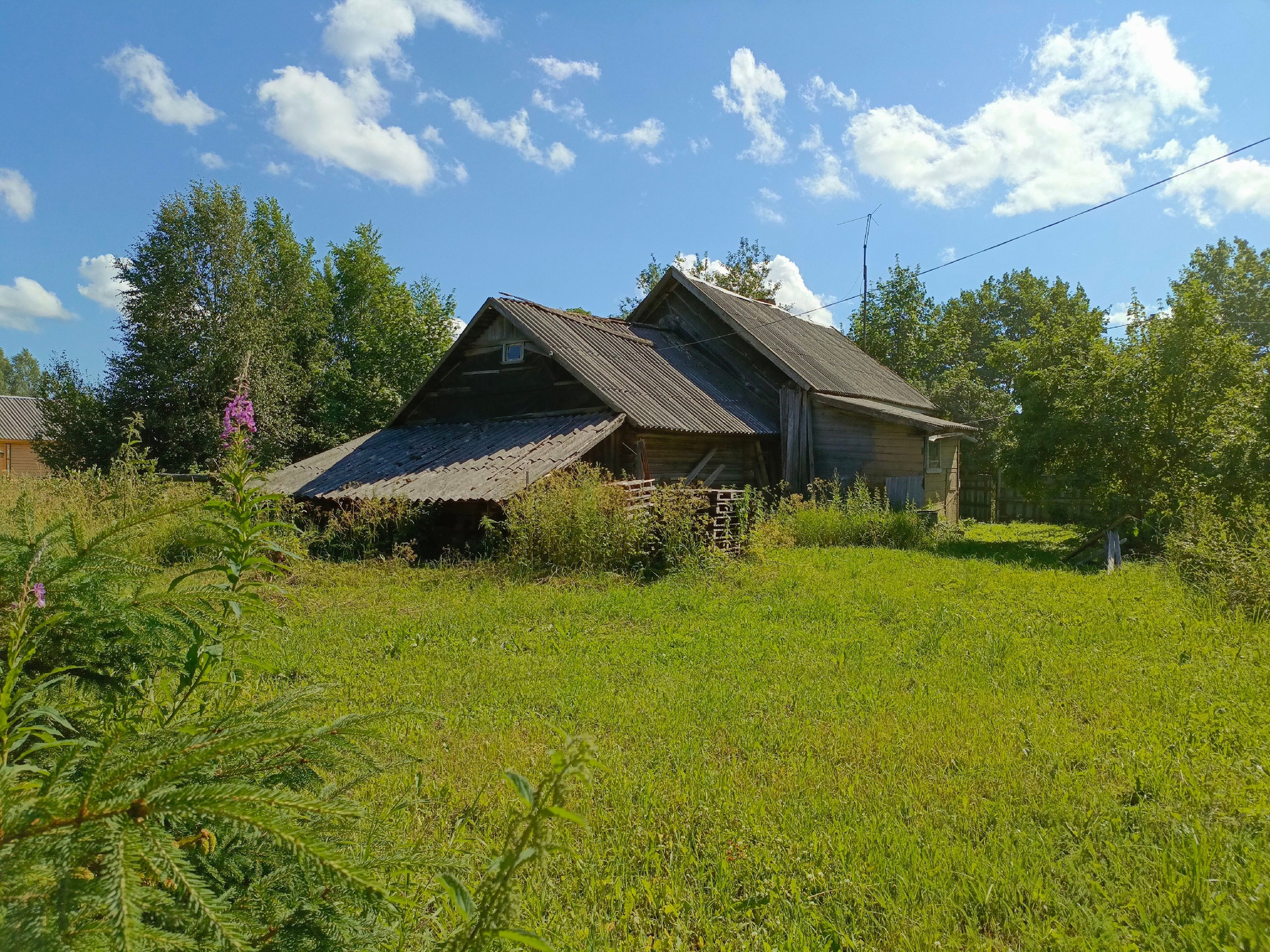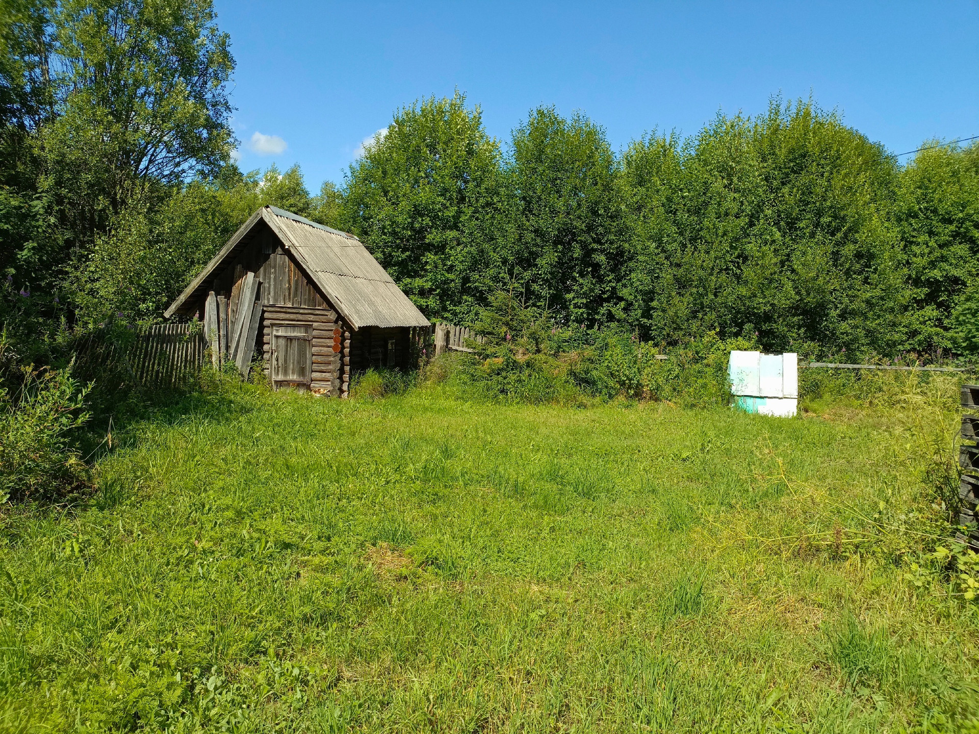 Участок 38 соток, забором огорожено около восьми. Остальные 30 соток - в поле. На участке есть колодец, баня и сарай. Растут кусты смородины, малины, две яблони, орешник.