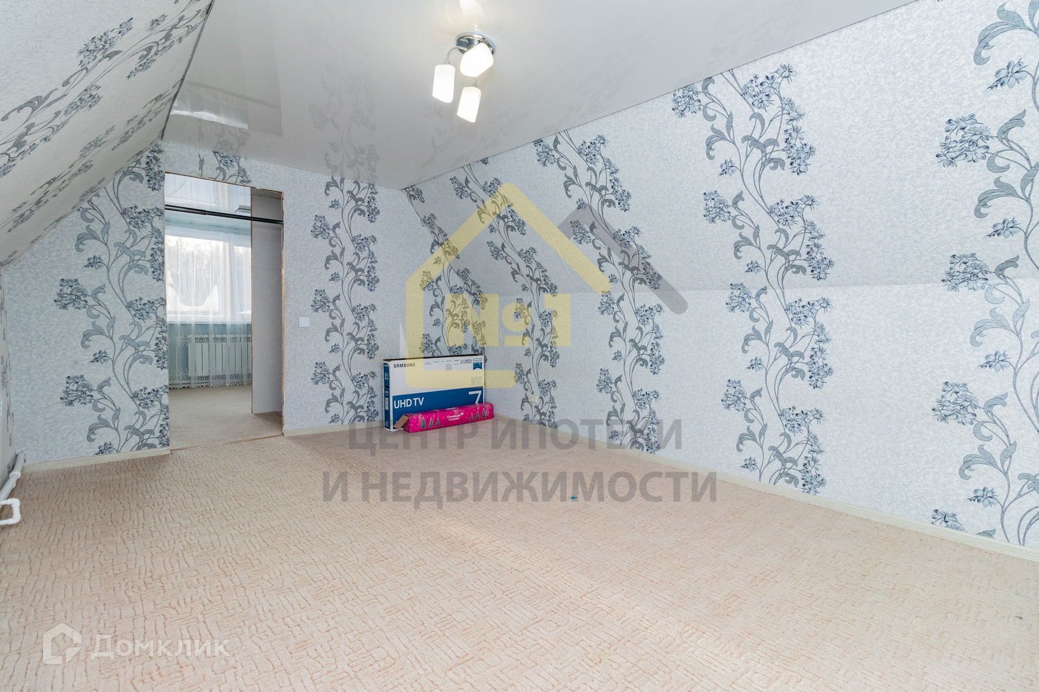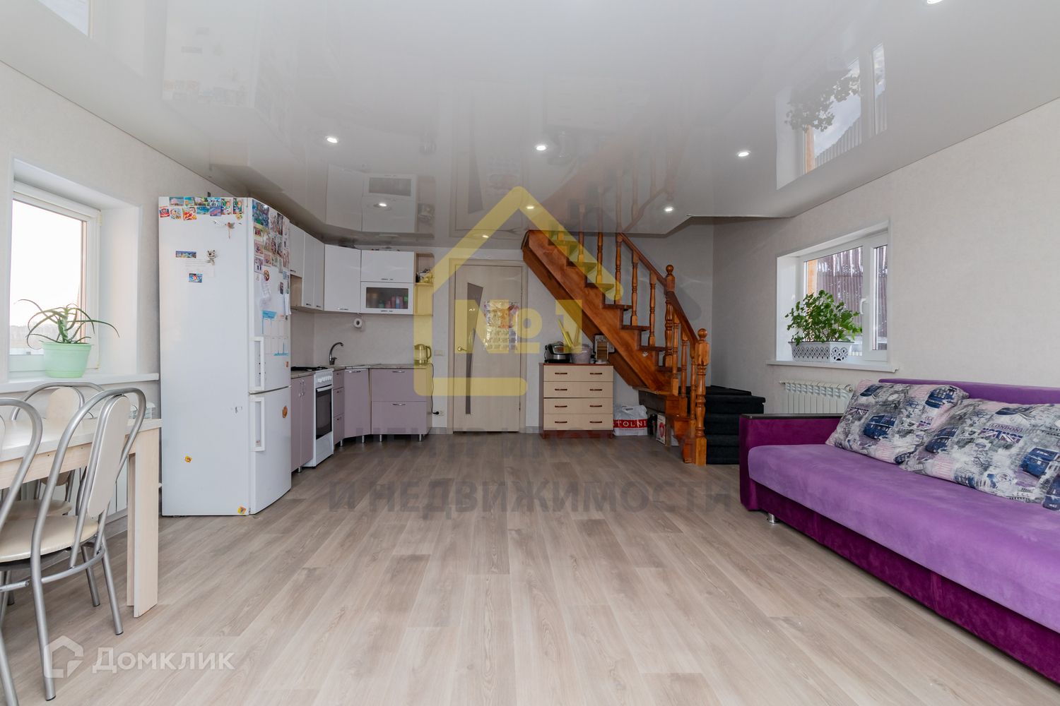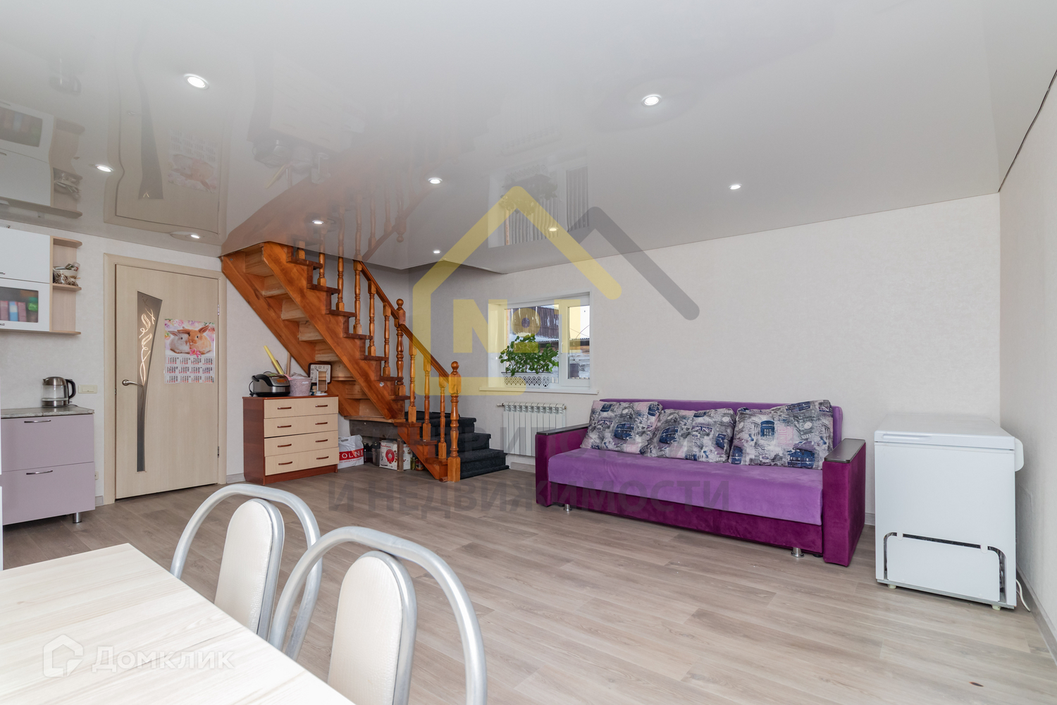 Потолки натяжные, пол ламинат, на кухне линолеум, на 2 этаже пол - ковролин.
