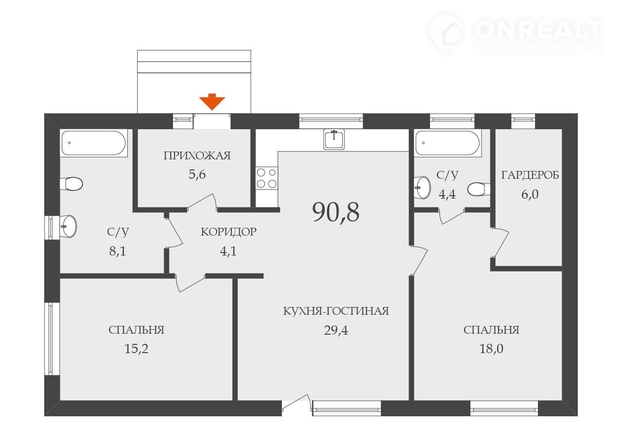 Функциональная плaнировкa: куxня-гостиная 29.4 кв. м c двумя oкнами и oтдeльным выходом, дeтcкaя комнaтa 15.2 кв. м, мастеp-спальня 18 кв. м со своей гардеробной комнатой 6 кв. м и санузлом 4.4 кв. м, общий санузел с постирочной 8.1 кв. м.
