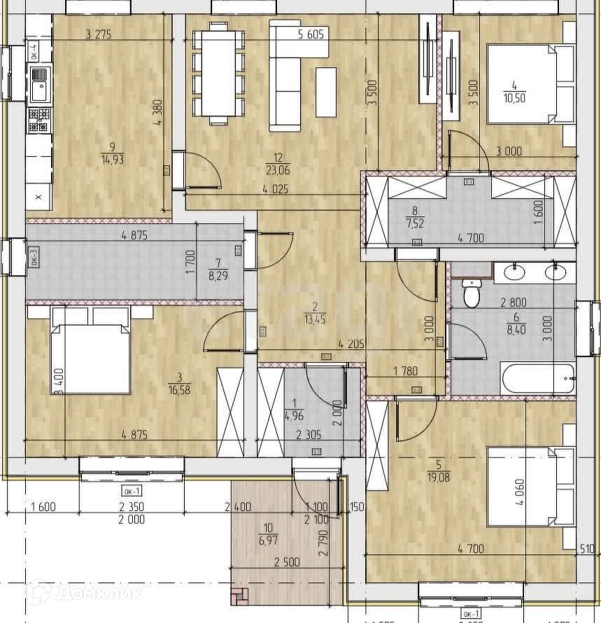 В доме предусмотрены три спальни, гостиная, кухня, холл, ванная, котельная, гардеробная.
