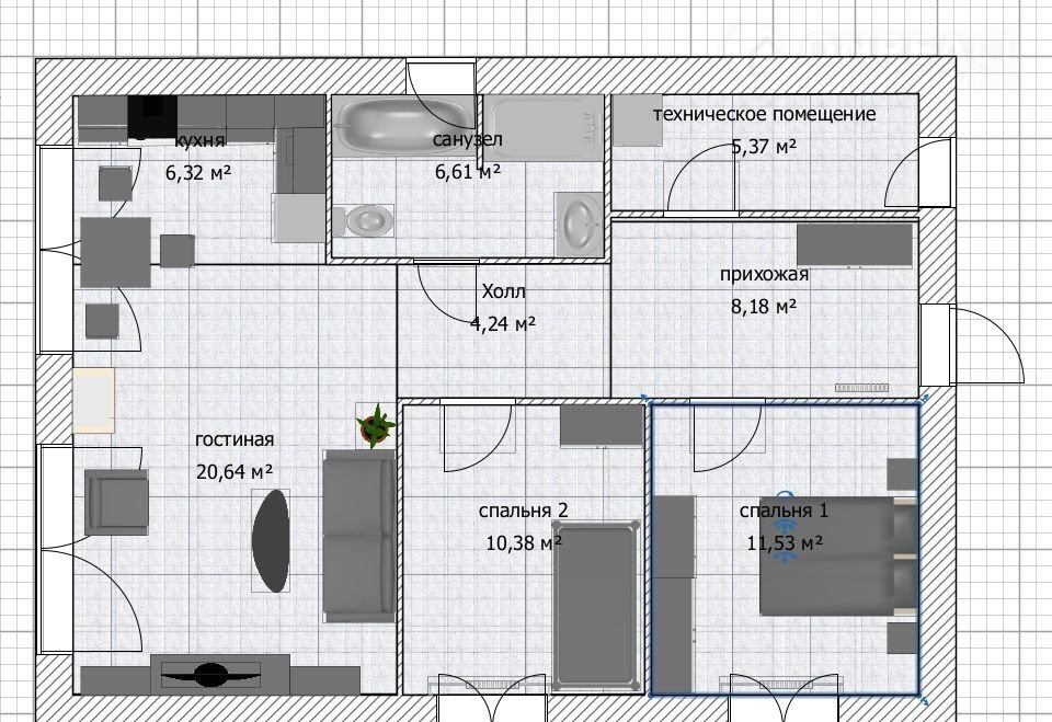 Общая площадь -88 кв.м. (11мх8м), жилая - 63,94 кв.м., три жилые комнаты: гостиная-20 кв.м, кухня – 6кв.м., две спальни 11 кв.м и 10 кв.м. в одной спальне предусмотрено антресольное пространство в качестве дополнительного спального места (дети будут в восторге!), просторный санузел 6,6кв.м. (предусмотрено место для ванны и душевой кабины).
