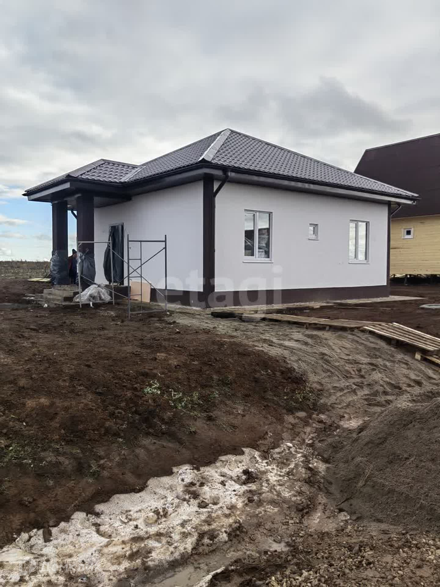 Дом облицован декоративной штукатуркой под короед. Крыша металлочерепица, установлены водосточные трубы, залиты отмостки и крыльцо, цементно-песочная стяжка пола, теплый пол по всему периметру этажа. Канализация септик, центральный водопровод, электро разводка выполнена, идеально выравнены, оштукатурены стены.